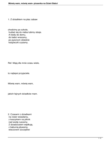 Mówię wam, mówię wam- piosenka na Dzień Babci 1. Z dziadkiem na plac zabaw chodzimy po szkole, huśtać się do nieba lubimy oboje. A kiedy do domu, do babci wracamy, po pysznym obiedzie książeczki czytamy. Ref. Mają dla mnie czasu wiele, to najlepsi przyjaciele. Mówię wam, mówię wam, jakich fajnych dziadków mam. 2. Czasami z dziadkami na rower wsiadamy, z koszykiem na piknik nad wodę ruszamy. Z dziadziusiem wędkuję, z babunią pływamy, wieczorem szczęśliwi 1/2 Mówię wam, mówię wam- piosenka na Dzień Babci do domu wracamy. Ref. Mają dla mnie czasu wiele… 2/2