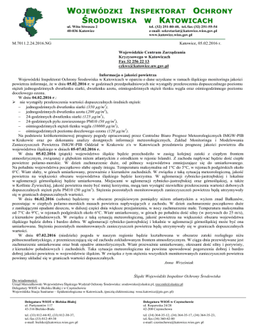 WOJEWÓDZKI INSPEKTORAT OCHRONY ŚRODOWISKA W KATOWICACH ul. Wita Stwosza 2 40-036 Katowice M.7011.2.24.2016.NG tel. (32) 251-80-40, tel./fax (32) 251-55-54 e-mail: [email protected] www.katowice.wios.gov.pl Katowice, 05.02.2016 r. Wojewódzkie Centrum Zarządzania Kryzysowego w Katowicach Fax 32 256 22 13 [email protected] Informacja o jakości powietrza Wojewódzki Inspektorat Ochrony Środowiska w Katowicach w oparciu o dane uzyskane w ramach śląskiego monitoringu jakości powietrza informuje, że w dniu 05.02.2016 r. w godzinach przedpołudniowych nie wystąpiły przekroczenia dopuszczalnego poziomu stężeń jednogodzinnych dwutlenku siarki, dwutlenku azotu, ośmiogodzinnych stężeń tlenku węgla oraz ośmiogodzinnego poziomu docelowego ozonu. W dniu 04.02.2016 r.: nie wystąpiły przekroczenia wartości dopuszczalnych średnich stężeń: jednogodzinnych dwutlenku siarki (350 µg/m3), jednogodzinnych dwutlenku azotu (200 µg/m3), 24-godzinnych dwutlenku siarki (125 µg/m3), 24-godzinnych pyłu zawieszonego PM10 (50 µg/m3), ośmiogodzinnych stężeń tlenku węgla (10000 µg/m3), ośmiogodzinnych poziomu docelowego ozonu (120 µg/m3). Na podstawie krótkoterminowej prognozy pogody opracowanej przez Centralne Biuro Prognoz Meteorologicznych IMGW-PIB w Krakowie oraz po dokonaniu analizy dostępnych informacji meteorologicznych, Zakład Monitoringu i Modelowania Zanieczyszczeń Powietrza IMGW-PIB Oddział w Krakowie z/s w Katowicach przedstawia prognozę jakości powietrza dla województwa śląskiego w dniach 05-07.02.2016 r. W dniu 05.02.2016 (piątek) województwo śląskie będzie przechodziło w zasięg kolejnej zatoki z ciepłym frontem atmosferycznym, związanej z głębokim niżem atlantyckim z ośrodkiem w rejonie Islandii. Z zachodu napływać będzie dość ciepłe powietrze polarno-morskie. W dzień zachmurzenie duże, od północy województwa zmniejszające się do umiarkowanego. Na południu województwa początkowo słabe opady śniegu. Temperatura maksymalna od 1°C do 3°C, w rejonach podgórskich około 0°C. Wiatr słaby, w górach umiarkowany, przeważnie z kierunków zachodnich. W związku z taką sytuacją meteorologiczną, jakość powietrza na większości obszaru województwa śląskiego będzie korzystna. W aglomeracji rybnicko-jastrzębskiej i lokalnie w aglomeracji górnośląskiej będzie umiarkowana. Miejscami w aglomeracji rybnicko-jastrzębskiej oraz górnośląskiej, a także w Kotlinie Żywieckiej, jakość powietrza może być mniej korzystna, mogą tam wystąpić niewielkie przekroczenia wartości dobowych dopuszczalnych stężeń pyłu PM10 (50 µg/m3). Stężenia pozostałych monitorowanych zanieczyszczeń powietrza będą utrzymywały się w granicach dopuszczalnych wartości. W dniu 06.02.2016 (sobota) będziemy w obszarze przejściowym pomiędzy niżem atlantyckim a wyżem znad Bałkanów, pozostając w ciepłych polarno-morskich masach powietrza napływających z zachodu. W dzień zachmurzenie początkowo duże z zanikającymi opadami deszczu, w dalszej części dnia większe przejaśnienia, w nocy zachmurzenie małe. Temperatura maksymalna od 7°C do 9°C, w rejonach podgórskich około 6°C. Wiatr umiarkowany, w górach po południu dość silny (w porywach do 25 m/s), z kierunków południowych. W związku z taką sytuacją meteorologiczną, jakość powietrza na większości obszaru województwa śląskiego będzie dobra i bardzo dobra. W aglomeracji rybnicko-jastrzębskiej i lokalnie w aglomeracji górnośląskiej może być ona umiarkowana. Stężenia pozostałych monitorowanych zanieczyszczeń powietrza będą utrzymywały się w granicach dopuszczalnych wartości. W dniu 07.02.2016 (niedziela) pogoda w naszym regionie będzie kształtowana w obszarze zatoki rozległego niżu północnoatlantyckiego, z przemieszczającą się od zachodu zokludowanym frontem atmosferycznym. W ciągu dnia przewidywane jest zachmurzenie umiarkowane oraz brak opadów atmosferycznych. Wiatr przeważnie umiarkowany, okresami dość silny i porywisty, z kierunków południowych i zachodnich. Taka sytuacja meteorologiczna nie powinna spowodować pogorszenia dobrej i bardzo dobrej jakości powietrza w województwie śląskim. W związku z tym stężenia wszystkich monitorowanych zanieczyszczeń powietrza powinny układać się w granicach wartości dopuszczalnych. Anna Wrześniak Śląski Wojewódzki Inspektor Ochrony Środowiska Do wiadomości: Urząd Marszałkowski Województwa Śląskiego Wydział Ochrony Środowiska: [email protected], [email protected] Delegatury WIOŚ w Bielsku Białej i w Częstochowie Wojewódzka Stacja Sanitarno – Epidemiologiczna w Katowicach, (pocztą elektroniczną: [email protected]) Delegatura WIOŚ w Bielsku-Białej ul. Partyzantów 117 43-316 Bielsko-Biała Delegatura WIOŚ w Częstochowie ul. Rząsawska 24/28 42-200 Częstochowa tel. (33) 812-44-92, (33) 812-30-37, tel./fax (33) 812-49-30 e-mail: [email protected] tel. (34) 364-35-12, (34) 364-35-17, (34) 364-35-23, tel./fax (34) 360-42-80 e-mail: [email protected]
