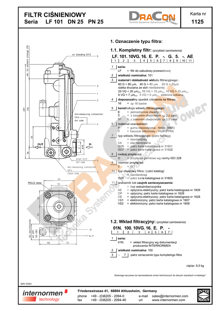 FILTR CIŚNIENIOWY Seria Karta nr ' LF 101 DN 25 PN 25 1. Oznaczenie typu filtra: 1.1. Kompletny filtr: (przykład zamówienia) LF. 101. 10VG. 16. E. P. -. G. 5. -. AE 1 2 3 4 5 6 7 8 9 10 11 1 seria: LF = filtr do zabudowy przewodowej 2 wielkość nominalna: 101 3 materiał i dokładność wkładu filtracyjnego : 80 G = 80 µm, 40 G = 40 µm, 25 G = 25µm siatka druciana ze stali nierdzewnej 25 VG = 20 µm(c), 16 VG = 15 µm(c), 10 VG = 10 µm(c), 6 VG = 7 µm(c), 3 VG = 5 µm(c) włóknina szklana 4 dopuszczalny spadek ciśnienia na filtrze: 16 = ∆p 16 barów 5 konstrukcja wkładu filtracyjnego: E = jednostronnie otwarty S = z zaworem obejściwym ∆p 2,0 bary S1 = z zaworem obejściwym ∆p 3,5 bara 6 materiał uszczelnień: P = guma olejoodporna - Nitrile (NBR) V = kauczuk silikonowy - Viton (FPM) 7 typ wkładu filtracyjngo: (patrz katalog) = standardowy VA = stal nierdzewna IS06 = patrz karta katalogowa nr 31601 IS07 = patrz karta katalogowa nr 31602 8 rodzaj przyłącza: G = przyłącze gwintowe wg normy ISO 228 9 rozmiar przyłącza: 5 = G1 10 typ obudowy filtra: (patrz katalog) = standardowy IS06 = patrz karta katalogowa nr 31605 11 wskaźnik lub czujnik zanieczyszczenia: = bez wskaźnika/czujnika AE = optyczno-elektryczny; patrz karta katalogowa nr 1609 OP = optyczny; patrz karta katalogowa nr 1628 OE = optyczno-elektryczny; patrz karta katalogowa nr 1628 VS1 = elektroniczny; patrz karta katalogowa nr 1607 VS2 = elektroniczny; patrz karta katalogowa nr 1608 1.2. :NáDGILOWUDF\MQ\: (SU]\NáDG]DPyZLHQLD) 01N. 100. 10VG. 16. E. P. 1 1 2 seriD: 01N. 3 4 5 6 7 =ZNáDGILOWUDF\MQ\ZJGRNXPHQWDFML SURGXFHQWD,17(51250(1 2ZLHONRĞüQRPLQDOQD: 100 3 - 7SDWU]R]QDF]HQLHW\SXNRPSOHWQJRILOWUD FLĊĪDU: 8,5 kg =DVWU]HJDVLĊSUDZRGRZSURZDG]DQLD]PLDQWHFKQLF]Q\FKGRGDQ\FK]DZDUW\FKZNDWDORJX! EDV 03/03 Friedensstrasse 41, 68804 Altlussheim, Germany phone fax +49 - (0)6205 - 2094-0 +49 - (0)6205 - 2094-40 e-mail url [email protected] www.internormen.com 2. &]ĊĞFL]DPLHQQH: SR]LORĞüQD]ZD UR]PLDU nr części 1 1ZNáDGILOWUDF\MQ\ 01N. 100 2 1 O-ring 22 x 3,5 304341 (NBR) 304392 (FPM) 3 1 O-ring 76 x 4 305599 (NBR) 310291 (FPM) 4 2NRUHNVSXVWRZ\ G ¼05003 5 2NRUHNVSXVWRZ\ G ½04678 6 1ZVNDĨQLN]DQLHF]\V]F]HQLDRSW\F]Q\ OPSDWU]NDUWDNDWDORJRZDQU1628 7 1ZVNDĨQLN]DQLHF]\V]F]HQLDRSW\F]QRHOHNWU\F]Q\2ESDWU]NDUWDNDWDORJRZDQU1628 8 1ZVNDĨQLN]DQLHF]\V]F]HQLDRSW\F]QRHOHNWU\F]Q\$ESDWU]NDUWDNDWDORJRZDQU1609 9 1 c]XMQLN]DQLHF]\V]F]HQLDHOHNWURQLF]Q\9S1SDWU]NDUWDNDWDORJRZDQU1607 10 1 c]XMQLN]DQLHF]\V]F]HQLDHOHNWURQLF]Q\VS2SDWU]NDUWDNDWDORJRZDQU1608 11 2 O-ring 14 x 2 304342 (NBR) 304722 (FPM) 12 2 korek G¼ 305003 SR]\FMDZ\VWĊSXMHW\ONRZSU]\SDGNXILOWUDEH]ZVNDĨQLNDF]XMQLND]DQLHF]\V]F]HQLD 3. 2SLV: Filtry serii LF 101 pracują w układach z ciśnieniem roboczym do 25 barów. Konstrukcja filtra zapewnia odporność QDFKZLORZ\Z]URVWFLĞQLHQLD)LOWUSU]H]QDF]RQ\MHVWGRPRQWDĪXZSR]\FMLSLRQRZHMLPRĪHSUDFRZDüMDNRILOWU ssawny, ciśnieniowy i powrotny. Wkład filtra składa się z harmonijkowego materiału filtracyjnego wzmocnionego RGZHZQąWU]SHUIRURZDQąWXOHMąFDáRĞü]DP\NDMąQDREXNRĔFDFKSRNU\Z\SRáąF]RQH]PDWHULDáHPILOWUDF\MQ\P wysokiej jakości spoiwem. Przepływ medium roboczego następuje od zewnętrznej strony do środka wkładu. W celu oczyszczenia siatki (patrz karta nr 21070-4) lub wymiany kompletnego wkładu, należy zdemontować pokrywę filtra. :ILOWUDFKGRNáDGQLHMV]\FKQLĪPQDOHĪ\VWRVRZDüZNáDG\MHGQRUD]RZHZ\NRQDQH]ZáyNQLQ\V]NODQHM:NáDG\ filtracyjne o dokładności do 5 µm(c) są dostępne w standardzie; wkłady dokładniejsze dostępne są na zapytanie. Wkłady filtracyjne INTERNORMEN charakteryzują się wysoką stabilnością wewnętrzną, doskonałą zdolnością filtracyjną, dużą zdolnością zatrzymywania zanieczyszczeń i długim okresem użytkowania; przeznaczone VąGRPHGLyZSRFKRGQ\FKURS\QDIWRZHMHPXOVML+:ZLĊNV]RĞFLV\QWHW\F]Q\FKSá\QyZK\GUDXOLF]Q\FKLROHMyZ smarnych. Dostępne certyfikaty: TÜV, DNV, BV; GL; LRS; RINA; ABS. . . 4. 'DQHWHFKQLF]QH: ]DNUHVWHPSHUDWXU&GR&FKZLORZRGR& PHGLXPURERF]HROHMPLQHUDOQ\LQQHPHGLDQD]DS\WDQLH mDNV\PDOQHFLĞQLHQLHURERF]HEDUyZ FLĞQLHQLHSUyEQHEDU\ URG]DMSU]\áąF]DSU]\áąF]HJZLQWRZHZJQRUP\,62 PDWHULDáREXGRZ\RGOHZDOXPLQLRZ\ PDWHULDáXV]F]HOQLHĔJXPDROHMRRGSRUQD1LWULOH1%5OXENDXF]XNVLOLNRQRZ\9LWRQ)30LQQHPDWHULDá\QD]DS\WDQLH VSRVyELQVWDODFMLSR]\FMDSLRQRZD UR]PLDUSU]\áąF]DSRPLDURZHJR*ó UR]PLDUSU]\áąF]DVSXVWRZHJR*ò SRMHPQRĞüREXGRZ\O .ODV\ILNDFMDZJG\UHNW\Z\(&3UHVVXUH9HVVHO'LUHFWLYH(&GODROHMyZPLQHUDOQ\FKPHGLDJUXSDDUW\NXáSDUDJUDI. .ODV\ILNDFMDZJG\UHNW\Z\(&$7(;'LUHFWLYH(&RGSRZLHGQLRGRV]F]HJyOQ\FK]DVWRVRZDĔSDWU]NDUWDQU. 5. SymbolH: EH]ZVNDĨQLND wVNDĨQLN HOHNWU\F]Q\ AE 30 L AE 40 wVNDĨQLNRSW\F]QR HOHNWU\F]Q\ AE 50 L AE 60 6. Krzywe spadku ciśnienia: 7. Metody badań: wskaźnik optyczny OP wskaźnik optycznoelektryczny OE czujnik elektroniczny VS1 czujnik elektroniczny VS2 Dokładne parametry przepływu oraz wykresy spadku ciśnienia ∆p w funkcji dokładności ZNáDGXILOWUDF\MQHJRLOHSNRĞFLPHGLXPURERF]HJRSDWU]SURJUDP ,1)([SHUW6\VWHP)LOWHU Wkłady filtracyjne testowane są wg następujących norm ISO: ISO 2941 ISO 2942 ISO 2943 ISO 3723 ISO 3724 ISO 3968 ISO 16889 E 1125 wskaźnik optycznoelektryczny AE 70 i AE 80 Sprawdzanie wytrzymałości na zgniatanie i rozrywanie Sprawdzanie jakości wykonania Sprawdzanie odporności materiału na działanie cieczy roboczej Sprawdzenie wytrzymałości dna filtra Sprawdzanie wytrzymałości w funkcji przepływu Ocena spadku ciśnienia w funkcji wielkości przepływu Wielostopniowa metoda oceny wydajności filtracji