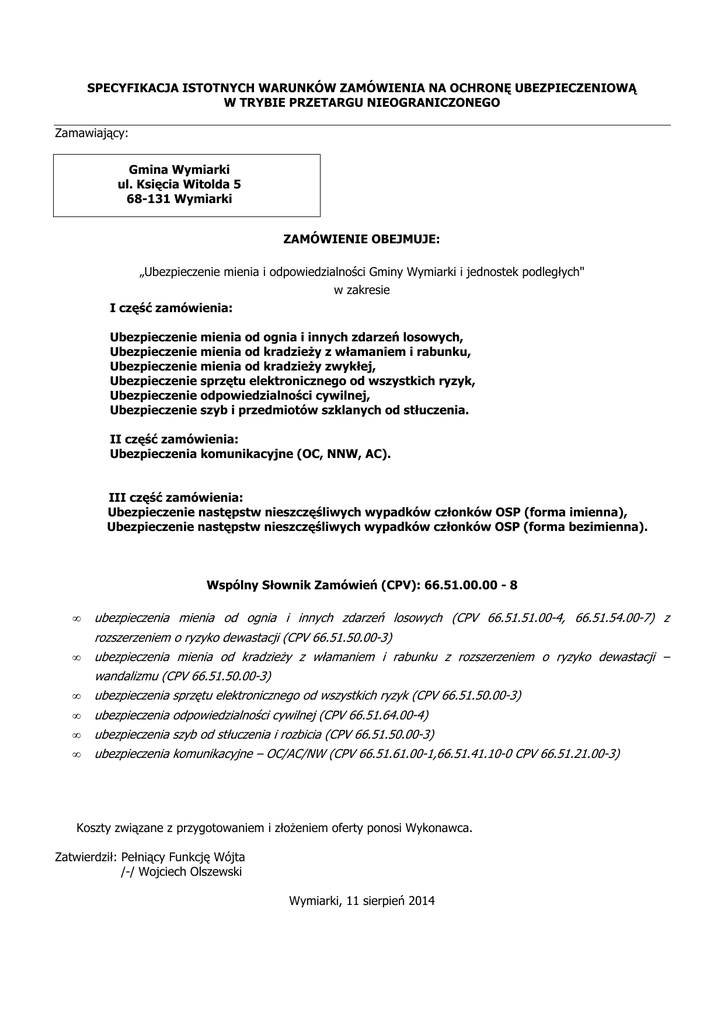 SPECYFIKACJA ISTOTNYCH WARUNKÓW ZAMÓWIENIA NA OCHRONĘ UBEZPIECZENIOWĄ W TRYBIE PRZETARGU NIEOGRANICZONEGO Zamawiający: Gmina Wymiarki ul. Księcia Witolda 5 68-131 Wymiarki ZAMÓWIENIE OBEJMUJE: „Ubezpieczenie mienia i odpowiedzialności Gminy Wymiarki i jednostek podległych" w zakresie I część zamówienia: Ubezpieczenie mienia od ognia i innych zdarzeń losowych, Ubezpieczenie mienia od kradzieży z włamaniem i rabunku, Ubezpieczenie mienia od kradzieży zwykłej, Ubezpieczenie sprzętu elektronicznego od wszystkich ryzyk, Ubezpieczenie odpowiedzialności cywilnej, Ubezpieczenie szyb i przedmiotów szklanych od stłuczenia. II część zamówienia: Ubezpieczenia komunikacyjne (OC, NNW, AC). III część zamówienia: Ubezpieczenie następstw nieszczęśliwych wypadków członków OSP (forma imienna), Ubezpieczenie następstw nieszczęśliwych wypadków członków OSP (forma bezimienna). Wspólny Słownik Zamówień (CPV): 66.51.00.00 - 8 • ubezpieczenia mienia od ognia i innych zdarzeń losowych (CPV 66.51.51.00-4, 66.51.54.00-7) z • ubezpieczenia mienia od kradzieży z włamaniem i rabunku z rozszerzeniem o ryzyko dewastacji – rozszerzeniem o ryzyko dewastacji (CPV 66.51.50.00-3) wandalizmu (CPV 66.51.50.00-3) • ubezpieczenia sprzętu elektronicznego od wszystkich ryzyk (CPV 66.51.50.00-3) • ubezpieczenia odpowiedzialności cywilnej (CPV 66.51.64.00-4) • ubezpieczenia szyb od stłuczenia i rozbicia (CPV 66.51.50.00-3) • ubezpieczenia komunikacyjne – OC/AC/NW (CPV 66.51.61.00-1,66.51.41.10-0 CPV 66.51.21.00-3) Koszty związane z przygotowaniem i złożeniem oferty ponosi Wykonawca. Zatwierdził: Pełniący Funkcję Wójta /-/ Wojciech Olszewski Wymiarki, 11 sierpień 2014 2 Zawartość Specyfikacji istotnych warunków zamówienia: (1) Nazwa i adres Zamawiającego, (2) Tryb udzielania zamówienia, (3) Opis przedmiotu zamówienia (3.1) Opis części zamówienia, jeżeli Zamawiający dopuszcza składanie ofert częściowych (3.2) Informacja o przewidywanych zamówieniach uzupełniających (4) Termin wykonania zamówienia, (5) Opis warunków udziału w postępowaniu oraz opis sposobu dokonywania oceny spełniania tych warunków, (6) Wykaz oświadczeń lub dokumentów, jakie mają dostarczyć wykonawcy w celu potwierdzenia spełnienia warunków udziału w postępowaniu, (7) Informacja o sposobie porozumiewania się Zamawiającego z wykonawcami oraz przekazywania oświadczeń lub dokumentów, a także wskazanie osób uprawnionych do porozumiewania się z wykonawcami (7.1) adres poczty elektronicznej lub strony internetowej Zamawiającego, (7.2) Opis sposobu udzielania wyjaśnień dotyczących specyfikacji istotnych warunków zamówienia oraz oświadczenie, czy zamierza się zwołać zebranie wykonawców, (8) Wymagania dotyczące wadium, (9) Termin związania ofertą, (10) Opis sposobu przygotowania ofert, (11) Miejsce oraz termin składania i otwarcia ofert, (12) Opis sposobu obliczenia ceny, (12.1) Informacje dotyczące walut obcych, w jakich mogą być prowadzone rozliczenia między Zamawiającym a wykonawcą, (12.2) Czynności wykonywane przy otwarciu i ocenie ofert, (13) Opis kryteriów, którymi Zamawiający będzie się kierował przy wyborze oferty, wraz z podaniem znaczenia tych kryteriów i sposobu oceny ofert, (14) Informacja o formalnościach, jakie powinny zostać dopełnione po wyborze oferty w celu zawarcia umowy w sprawie zamówienia publicznego, (15) Wymagania dotyczące zabezpieczenia należytego wykonania umowy, (16) Istotne dla stron postanowienia, które zostaną wprowadzone do treści zawieranej umowy, w sprawie zamówienia publicznego, wzór umowy, warunki zmiany umowy, (17) Pouczenie o środkach ochrony prawnej przysługujących wykonawcy w toku postępowania o udzielenie zamówienia. 1. NAZWA ORAZ ADRES ZAMAWIAJĄCEGO Gmina Wymiarki, ul. Księcia Witolda 5, 68-131 Wymiarki powiat żagański, woj. lubuskie, tel.: 68 3604045, fax.: 68 3604062, reprezentowana przez Wójta. 2. TRYB UDZIELENIA ZAMÓWIENIA Postępowanie o udzielenie zamówienia publicznego prowadzone jest w trybie przetargu nieograniczonego na podstawie ustawy z dnia 29 stycznia 2004 roku Prawo Zamówień Publicznych (tekst jednolity Dz.U. z 2013r., poz. 907 z późn. zm.) zwanej dalej „Ustawą”. Postępowanie dotyczy udzielenia zamówienia publicznego na usługę o wartości nie przekraczającej kwoty określonej w przepisach wydanych na podstawie art. 11 ust. 8 Ustawy. 3. OPIS PRZEDMIOTU ZAMÓWIENIA Przedmiot zamówienia obejmuje ubezpieczenie mienia i odpowiedzialności Gminy Wymiarki i jednostek podległych w zakresie ubezpieczenia mienia od ognia i innych zdarzeń losowych, ubezpieczenia mienia od kradzieży z włamaniem i rabunku, ubezpieczenia mienia od kradzieży zwykłej, ubezpieczenia sprzętu elektronicznego od wszystkich ryzyk, ubezpieczenia odpowiedzialności cywilnej, ubezpieczenia szyb od stłuczenia, ubezpieczenia następstw nieszczęśliwych wypadków członków OSP (forma bezimienna i imienna), ubezpieczeń komunikacyjnych w następujących jednostkach organizacyjnych: 1. Gmina Wymiarki, ul. Księcia Witolda 5, 68-131 Wymiarki, NIP: 924-17-99-222, REGON: 970770474, 3 2. Gminny Ośrodek Kultury i Biblioteki w Wymiarkach, ul. Księcia Witolda 7, 68-131 Wymiarki, NIP: 9241693110, REGON: 977896238, 3. Ośrodek Pomocy Społecznej, ul. Księcia Witolda 5, 68-131 Wymiarki, NIP: 9241696657, REGON: 971276612, Oddziały: Świetlica Środowiskowa w Witoszynie Górnym, Witoszyn Górny 9, 68-131 Wymiarki 4. Zespół Szkół w Witoszynie, ul. Szkolna 1, 68-131 Wymiarki, NIP: 9241860743, REGON: 080280649, Jednostki podległe: Szkoła Podstawowa w Wymiarkach, ul. Strzelecka 1, 68-131 Wymiarki, Publiczne Gimnazjum w Witoszynie, ul. Szkolna 1, 68-131 Wymiarki, 5. Jednostki OSP UWAGA: szczegółowy opis przedmiotu zamówienia zawarty jest w Dodatku nr 3 – Program Ubezpieczenia UWAGA: Zamawiający nie dopuszcza składania ofert wariantowych. UWAGA: Zamawiający nie przewiduje z