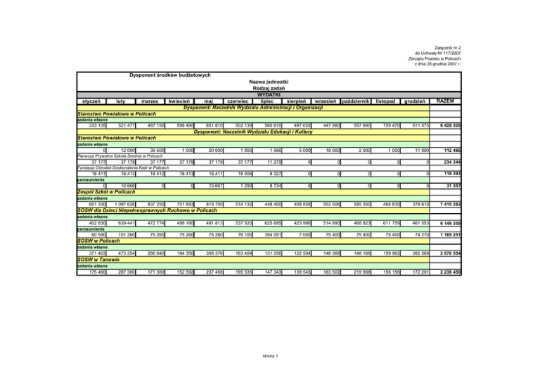 Załącznik nr 2 do Uchwały Nr 117/2007 Zarządu Powiatu w Policach z dnia 28 grudnia 2007 r. Dysponent środków budżetowych styczeń luty Nazwa jednostki Rodzaj zadań WYDATKI kwiecień maj czerwiec lipiec sierpień wrzesień Dysponent: Naczelnik Wydziału Administracji i Organizacji marzec październik listopad RAZEM grudzień Starostwo Powiatowe w Policach zadania własne 333 135 521 477 487 150 598 480 651 810 502 139 560 610 497 020 447 980 557 680 759 470 511 575 6 428 526 Dysponent: Naczelnik Wydziału Edukacji i Kultury Starostwo Powiatowe w Policach zadania własne 0 12 000 39 500 1 000 20 000 1 000 1 066 5 000 18 000 2 000 1 000 11 900 112 466 37 178 37 178 37 177 11 279 0 0 0 0 0 234 344 Pierwsza Prywatna Szkoła Średnia w Policach 37 177 37 178 37 177 Fundacja Ośrodek Doskonalenia Kadr w Policach 18 411 18 413 18 412 18 413 18 411 18 006 8 327 0 0 0 0 0 118 393 10 666 0 0 10 667 1 290 8 734 0 0 0 0 0 31 357 837 250 701 693 819 700 514 132 448 400 408 850 553 506 585 350 468 835 378 610 7 415 282 porozumienia 0 Zespół Szkół w Policach zadania własne 601 330 1 097 626 SOSW dla Dzieci Niepełnosprawnych Ruchowo w Policach zadania własne 402 830 639 441 472 774 498 180 491 813 537 520 625 685 423 990 514 890 468 923 611 759 461 553 6 149 358 101 260 75 260 75 260 75 260 76 100 394 051 7 000 75 400 75 400 75 400 74 270 1 165 251 266 840 194 350 308 376 163 404 131 356 122 504 148 368 148 168 159 962 382 569 2 870 554 171 380 152 592 237 408 195 535 147 343 139 545 183 502 219 968 156 156 172 201 2 238 450 porozumienia 60 590 SOSW w Policach zadania własne 371 403 473 254 SOSW w Tanowie zadania własne 175 460 287 360 strona 1 Dysponent środków budżetowych styczeń luty MOW w Trzebieży marzec kwiecień Nazwa jednostki Rodzaj zadań WYDATKI czerwiec lipiec sierpień maj wrzesień październik listopad RAZEM grudzień zadania własne 166 495 317 472 159 920 155 904 182 267 153 735 149 449 159 944 158 706 138 437 139 812 67 639 1 949 780 92 132 63 988 72 787 64 488 67 487 64 988 70 502 82 733 864 605 Poradnia Psychologiczno-Pedagogiczna w Policach zadania własne 60 200 107 100 59 100 59 100 Dysponent: Naczelnik Wydziału Geodezji i Gospodarki Nieruchomościami Starostwo Powiatowe w Policach zadania własne 4 750 8 850 14 050 12 400 40 600 16 050 51 050 61 100 21 100 5 220 0 0 0 0 182 170 28 300 28 300 28 300 130 113 28 200 28 200 41 400 29 400 134 233 533 896 422 500 185 800 80 000 1 460 000 2 959 800 0 0 0 0 635 817 zadania zlecone 4 450 Dysponent: Naczelnik Wydziału Komunikacji, Transportu i Dróg Starostwo Powiatowe w Policach zadania własne 35 000 81 000 100 000 120 000 108 000 163 125 88 250 116 125 Dysponent: Kierownik Referatu Promocji i Rozwoju Starostwo Powiatowe w Policach porozumienia 0 0 63 503 29 465 80 348 0 261 900 200 601 Dysponent: Kierownik Referatu Spraw Społecznych i Obywatelskich Starostwo Powiatowe w Policach zadania własne 833 933 833 833 833 4 735 0 0 1 000 0 0 0 10 000 1 036 1 086 1 086 1 086 1 086 1 086 1 086 1 086 808 0 0 10 400 1 021 1 020 1 021 1 020 1 021 1 020 1 021 1 020 1 021 1 020 455 11 579 179 179 179 179 179 179 179 30 0 1 821 221 938 173 350 204 519 249 885 2 328 626 17 518 41 133 17 518 18 223 277 315 zadania zlecone Dom Dziecka w Policach 954 Dom Dziecka w Tanowie 919 Młodzieżowy Ośrodek Wychowawczy w Trzebieży 180 179 179 Dysponent: Kierownik Biura Bezpieczeństwa i Porządku Publicznego Komenda Powiatowa Państwowej Straży Pożarnej w Policach zadania zlecone 180 547 240 000 186 355 146 845 219 730 154 630 185 402 165 425 Dysponent: Powiatowy Inspektor Nadzoru Budowlanego Powiatowy Inspoktorat Nadzoru Budowlanego w Policach zadania zlecone 18 333 57 000 20 000 17 518 17 518 17 518 17 518 strona 2 17 518 Dysponent środków budżetowych Nazwa jednostki Rodzaj zadań WYDATKI styczeń luty marzec kwiecień maj czerwiec lipiec sierpień wrzesień Dysponent: Dyrektor Powiatowego Centrum Pomocy Rodzinie Powiatowe Centrum Pomocy Rodzinie w Policach październik listopad grudzień RAZEM zadania własne 260 559 281 224 289 585 260 447 301 806 283 647 260 947 283 947 263 357 341 993 269 796 238 882 3 336 190 3 750 3 750 18 750 3 750 3 750 3 750 3 750 3 750 4 417 4 417 19 416 77 000 31 470 90 673 zadania zlecone 3 750 porozumienia 59 203 Dom Dziecka w Policach zadania własne 90 000 124 180 110 867 77 740 77 425 91 502 76 264 96 507 102 070 155 601 76 321 105 171 1 183 648 111 615 88 668 97 329 93 610 69 691 87 769 110 394 103 127 93 796 121 583 1 111 660 Dom Dziecka w Tanowie zadania własne 67 302 66 776 Razem 42 328 961 strona 3