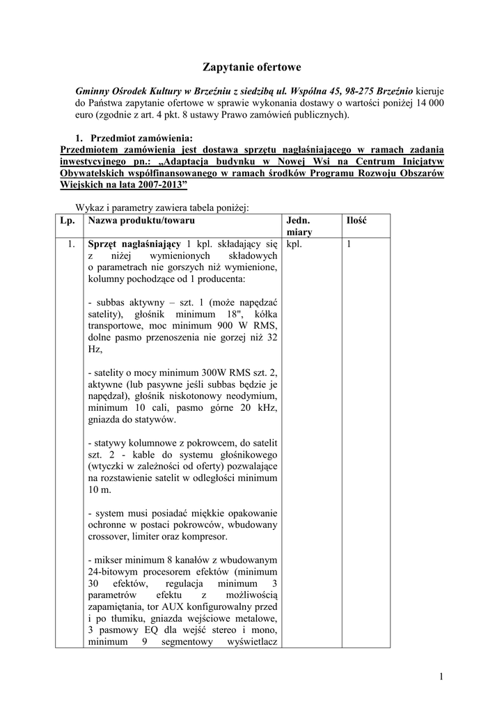 Zapytanie ofertowe Gminny Ośrodek Kultury w Brzeźniu z siedzibą ul. Wspólna 45, 98-275 Brzeźnio kieruje do Państwa zapytanie ofertowe w sprawie wykonania dostawy o wartości poniŜej 14 000 euro (zgodnie z art. 4 pkt. 8 ustawy Prawo zamówień publicznych). 1. Przedmiot zamówienia: Przedmiotem zamówienia jest dostawa sprzętu nagłaśniającego w ramach zadania inwestycyjnego pn.: „Adaptacja budynku w Nowej Wsi na Centrum Inicjatyw Obywatelskich współfinansowanego w ramach środków Programu Rozwoju Obszarów Wiejskich na lata 2007-2013” Wykaz i parametry zawiera tabela poniŜej: Lp. Nazwa produktu/towaru 1. Jedn. miary Sprzęt nagłaśniający 1 kpl. składający się kpl. z niŜej wymienionych składowych o parametrach nie gorszych niŜ wymienione, kolumny pochodzące od 1 producenta: Ilość 1 - subbas aktywny – szt. 1 (moŜe napędzać satelity), głośnik minimum 18", kółka transportowe, moc minimum 900 W RMS, dolne pasmo przenoszenia nie gorzej niŜ 32 Hz, - satelity o mocy minimum 300W RMS szt. 2, aktywne (lub pasywne jeśli subbas będzie je napędzał), głośnik niskotonowy neodymium, minimum 10 cali, pasmo górne 20 kHz, gniazda do statywów. - statywy kolumnowe z pokrowcem, do satelit szt. 2 - kable do systemu głośnikowego (wtyczki w zaleŜności od oferty) pozwalające na rozstawienie satelit w odległości minimum 10 m. - system musi posiadać miękkie opakowanie ochronne w postaci pokrowców, wbudowany crossover, limiter oraz kompresor. - mikser minimum 8 kanałów z wbudowanym 24-bitowym procesorem efektów (minimum 30 efektów, regulacja minimum 3 parametrów efektu z moŜliwością zapamiętania, tor AUX konfigurowalny przed i po tłumiku, gniazda wejściowe metalowe, 3 pasmowy EQ dla wejść stereo i mono, minimum 9 segmentowy wyświetlacz 1 diodowy), moŜliwość zamocowania w obudowie Rack 19", uchwyty rack oraz skrzynka transportowa z mechanizmem kątowym w kpl. - kable połączeniowe mikser-kolumny z wtykami Neutrik długości minimum 10m – szt. 2 - system bezprzewodowy z mikrofonem do ręki – szt. 2 - diversity, wskaźnik zasilania i naładowania baterii, wyjście jack i cannon, zasięg pracy minimum 90m - statywy mikrofonowe podłogowe, kolor czarny, w kpl. pokrowiec – szt. 2 okres gwarancji: min. 24 miesiące. 2. Rodzaj zamówienia: dostawa 3. Kody ze słownika CPV 32 34 24 00 – 6 sprzęt nagłaśniający 4. Miejsce dostawy: budynek Centrum Inicjatyw Obywatelskich w Nowej Wsi, Nowa Wieś 36, 98-275 Brzeźnio. 5. Termin realizacji dostawy: Dostawa w ciągu 15 dni licząc od dnia podpisania umowy. 6. Warunki płatności: Przelew na rachunek bankowy dostawcy wskazany w fakturze w terminie do 30 dni od daty otrzymania prawidłowo wystawionej faktury. 7. Kryteria oceny ofert Przy wyborze najkorzystniejszej oferty Zamawiający będzie się kierował kryterium: Cena – 100% 8. Informacje dodatkowe: 1) Wymagany okres gwarancji wskazany przez Zamawiającego w tabeli powyŜej. 2) Dostawca w formularzu ofertowym określi cenę jednostkową brutto i cenę brutto ogółem za całość zamówienia. 3) Zamawiający wybierze ofertę cenową dostawcy odpowiadającą wszystkim wymogom postawionym przez niego dla prawidłowej realizacji zamówienia i o najniŜszej cenie brutto za całość dostawy. 2 4) W sprawach dotyczących zapytania ofertowego informacji udziela GraŜyna Dziedzic w dni robocze od poniedziałku do piątku w godz. 7:30 – 15.30, tel. (43) 820-31-87, Pytania moŜna kierować równieŜ pisemnie na adres: Gminny Ośrodek Kultury w Brzeźniu, ul. Wspólna 45, 98-275 Brzeźnio lub e-mailem: [email protected] Ofertę cenową (formularz ofertowy) naleŜy złoŜyć w Sekretariacie Urzędu Gminy w Brzeźniu, ul. Wspólna 44, 98-275 Brzeźnio, I piętro, pok. 17 w formie pisemnej, w zamkniętej kopercie oznaczonej danymi dostawcy (pieczęć firmowa) oraz napisem: dostawa sprzętu nagłaśniającego w ramach zadania inwestycyjnego pn.: „Adaptacja budynku w Nowej Wsi na Centrum Inicjatyw Obywatelskich” współfinansowanego w ramach środków Programu Rozwoju Obszarów Wiejskich na lata 2007-2013” 5) Termin składania ofert: do dnia 14.09.2010r. godz. 15.00 (wtorek) 6) Oferta cenowa złoŜona po terminie składania ofert podanym powyŜej nie będzie brana pod uwagę przy wyborze oferty najkorzystniejszej. 7) Dostawca moŜe wprowadzić zmiany lub wycofać złoŜoną ofertę cenową przed upływem terminu składania ofert. 8) Z dostawcą, którego oferta cenowa zostanie uznana za najkorzystniejszą w terminie do 5 dni od daty powiadomienia o wyborze oferty zostanie podpisana umowa. 9) Termin związania ofertą cenową wynosi 15 dni od dnia otwarcia ofert przez Zamawiającego. 10) PowyŜsze zapytanie ofertowe wraz z formularzem ofertowym zostało zamieszczone na stronie internetowej: www.brzeznio.finn.pl 11) W sprawach związanych z zapytaniem ofertowym dopuszcza się porozumiewanie drogą: - pisemną, telefoniczną lub faxem – nr (43) 820-31-87. W przypadku korzystania z innych niŜ pisemna form porozumiewania, Strony mogą Ŝądać potwierdzenia otrzymania informacji bądź dokumentu. 12) Rozstrzygniecie postępowania i zlecenie realizacji zamówienia O wynikach postępowania jego uczestnicy zostaną poinformowani drogą faxową lub e-mailową w ciągu dwóch dni od dnia rozstrzygnięcia, następnie w ciągu 5 dni od przesłania informacji o wyborze oferty najkorzystniejszej zostanie podpisana umowa z wybranym Wykonawcom. 14) Załączniki: - formularz ofertowy Brzeźnio, dn. 07.08.2010r. p.o. Dyrektor GOK /-/ GraŜyna Dziedzic 3 Załącznik nr 1 do zapytania cenowego FORMULARZ OFERTOWY dla zamówień o wartości poniŜej 14 000 euro (zgodnie z art. 4 pkt. 8 ustawy Prawo zamówień publicznych) Dane dotyczące Dostawcy : Nazwa .................................................................................................................................... Siedziba ..........................................................................