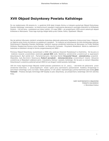 Starostwo Powiatowe w Kaliszu XVII Objazd Dożynkowy Powiatu Kaliskiego Po raz siedemnasty 28 sierpnia b.r. o godzinie 8.00 obok Urzędu Gminy w Liskowie wystartuje Objazd Dożynkowy Powiatu Kaliskiego, wzorowany na historycznych zasadach rozgrywania pierwszych wyścigów kolarskich w Królestwie Polskim. 116 lat temu rozstawieni po trasie cykliści, 23 maja 1899 r. po przejechaniu 1025 wiorst zakończyli objazd Królestwa w Warszawie. Trasa tego wyścigu biegła także przez Ceków, Kalisz, Opatówek i Błaszki. Sto lat później kilkunastu kaliskich amatorów kolarstwa dokonało pokonania fragmentu historycznej trasy I Objazdu ze Zgierza przez Kutno do Kalisza na podobnych zasadach. Te tradycje są kultywowane do dnia dzisiejszego podczas Dożynkowych Objazdów Powiatu Kaliskiego, kaliskich wypraw amatorów kolarstwa do Warszawy na Finały Wielkiej Orkiestry Świątecznej Pomocy Jurka Owsiaka i na Muzyczne Festiwale – Przystanki Woodstock. Warto tu nadmienić iż kolarstwo w Kaliskiem istnieje w formie zorganizowanej od 1892 r. Pierwszy Objazd Dożynkowy wystartował w 2000 roku podczas Dożynek Powiatowych w Koźminku. Do tej pory w indeksie nazwisk uczestników zaistniało ponad 800 osób. Niektórzy wielokrotnie uczestniczyli w wyprawach dożynkowych. Byli wśród nich : Parlamentarzyści, Starosta Kaliski Krzysztof Nosal - ośmiokrotny uczestnik Objazdów, były Burmistrz Stawiszyna Robert Jarzębski – dziesięciokrotny uczestniktych imprez. Aktywnie uczestniczą w Objazdach wójtowie gmin, mieszkańcy Kalisza i powiatu kaliskiego. Do tej pory w ramach Objazdów Dożynkowych uczestnicy pokonali ponad 2900 km po drogach wokół powiatu kaliskiego. 165 km trasę tegorocznego Objazdu wokół powiatu podzielono na 12 „stacji„ – odcinków do pokonania przez amatorów kolarstwa z poszczególnych miast i gmin przy zachowaniu postanowień Kodeksu Drogowego w warunkach otwartego ruchu na trasie. Około godziny 17.30 cykliści reprezentujący gminę Koźminek pod wodzą Jana Tomaski – Prezesa Zarządu Gminnego OSP dojadą na plac dożynkowy, po przejechaniu ostatniego 18.9 km odcinka trasy. SZEF DOŻYNKOWYCH OBJAZDÓW POWIATU KALISKIEGO /-/ Bronisław Krakus 1