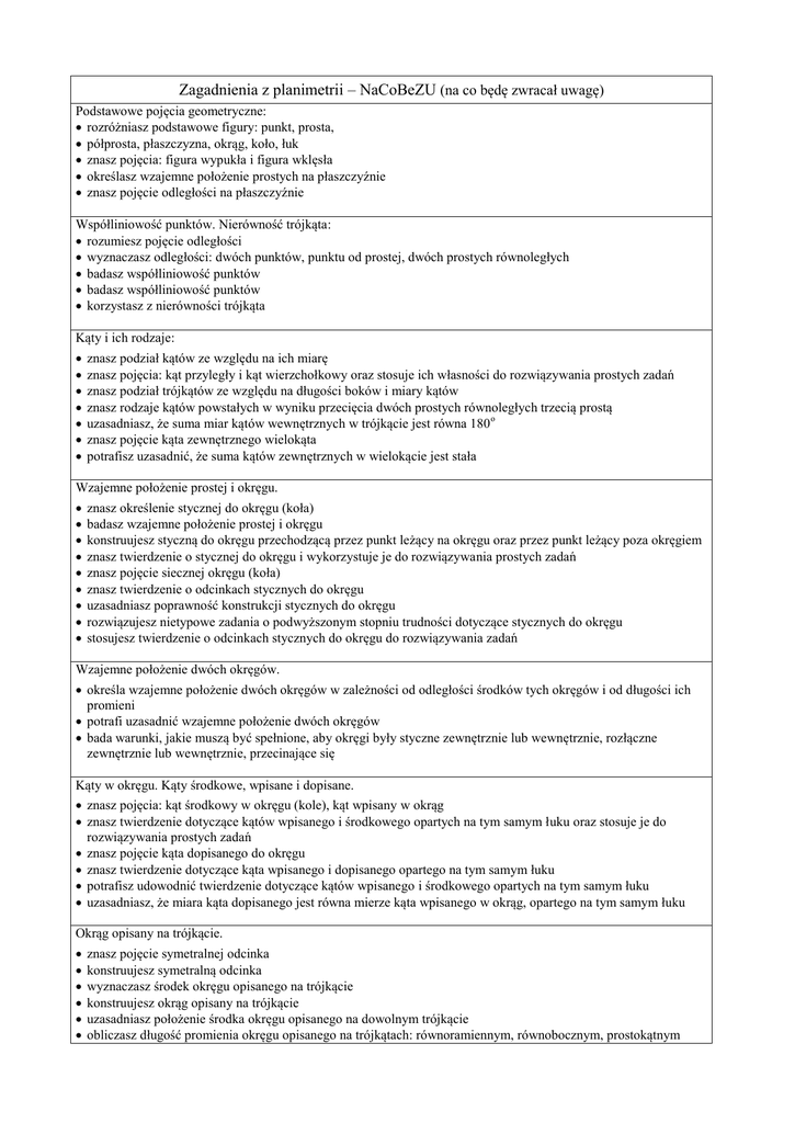 Zagadnienia z planimetrii – NaCoBeZU (na co będę zwracał uwagę) Podstawowe pojęcia geometryczne: rozróżniasz podstawowe figury: punkt, prosta, półprosta, płaszczyzna, okrąg, koło, łuk znasz pojęcia: figura wypukła i figura wklęsła określasz wzajemne położenie prostych na płaszczyźnie znasz pojęcie odległości na płaszczyźnie Współliniowość punktów. Nierówność trójkąta: rozumiesz pojęcie odległości wyznaczasz odległości: dwóch punktów, punktu od prostej, dwóch prostych równoległych badasz współliniowość punktów badasz współliniowość punktów korzystasz z nierówności trójkąta Kąty i ich rodzaje: znasz podział kątów ze względu na ich miarę znasz pojęcia: kąt przyległy i kąt wierzchołkowy oraz stosuje ich własności do rozwiązywania prostych zadań znasz podział trójkątów ze względu na długości boków i miary kątów znasz rodzaje kątów powstałych w wyniku przecięcia dwóch prostych równoległych trzecią prostą uzasadniasz, że suma miar kątów wewnętrznych w trójkącie jest równa 180 o znasz pojęcie kąta zewnętrznego wielokąta potrafisz uzasadnić, że suma kątów zewnętrznych w wielokącie jest stała Wzajemne położenie prostej i okręgu. znasz określenie stycznej do okręgu (koła) badasz wzajemne położenie prostej i okręgu konstruujesz styczną do okręgu przechodzącą przez punkt leżący na okręgu oraz przez punkt leżący poza okręgiem znasz twierdzenie o stycznej do okręgu i wykorzystuje je do rozwiązywania prostych zadań znasz pojęcie siecznej okręgu (koła) znasz twierdzenie o odcinkach stycznych do okręgu uzasadniasz poprawność konstrukcji stycznych do okręgu rozwiązujesz nietypowe zadania o podwyższonym stopniu trudności dotyczące stycznych do okręgu stosujesz twierdzenie o odcinkach stycznych do okręgu do rozwiązywania zadań Wzajemne położenie dwóch okręgów. określa wzajemne położenie dwóch okręgów w zależności od odległości środków tych okręgów i od długości ich promieni potrafi uzasadnić wzajemne położenie dwóch okręgów bada warunki, jakie muszą być spełnione, aby okręgi były styczne zewnętrznie lub wewnętrznie, rozłączne zewnętrznie lub wewnętrznie, przecinające się Kąty w okręgu. Kąty środkowe, wpisane i dopisane. znasz pojęcia: kąt środkowy w okręgu (kole), kąt wpisany w okrąg znasz twierdzenie dotyczące kątów wpisanego i środkowego opartych na tym samym łuku oraz stosuje je do rozwiązywania prostych zadań znasz pojęcie kąta dopisanego do okręgu znasz twierdzenie dotyczące kąta wpisanego i dopisanego opartego na tym samym łuku potrafisz udowodnić twierdzenie dotyczące kątów wpisanego i środkowego opartych na tym samym łuku uzasadniasz, że miara kąta dopisanego jest równa mierze kąta wpisanego w okrąg, opartego na tym samym łuku Okrąg opisany na trójkącie. znasz pojęcie symetralnej odcinka konstruujesz symetralną odcinka wyznaczasz środek okręgu opisanego na trójkącie konstruujesz okrąg opisany na trójkącie uzasadniasz położenie środka okręgu opisanego na dowolnym trójkącie obliczasz długość promienia okręgu opisanego na trójkątach: równoramiennym, równobocznym, prostokątnym Okrąg wpisany w trójkąt. znasz pojęcie dwusiecznej kąta konstruujesz dwusieczną kąta wyznaczasz środek okręgu wpisanego w trójkąt konstruujesz okrąg wpisany w trójkąt uzasadniasz, że dwusieczne kątów trójkąta przecinają się w jednym punkcie wykorzystujesz wzór na promień okręgu wpisanego w trójkąt prostokątny w zależności od długości boków tego trójkąta znasz i stosujesz wzór na pole trójkąta w zależności od jego obwodu i promienia okręgu wpisanego w trójkąt rozwiązujesz zadania o podwyższonym stopniu trudności dotyczące okręgów wpisanych i opisanych na trójkącie Twierdzenie Pitagorasa i twierdzenie Talesa. znasz twierdzenie Pitagorasa oraz twierdzenie odwrotne do twierdzenia Pitagorasa znasz twierdzenie Talesa oraz twierdzenie odwrotne do twierdzenia Talesa wykorzystujesz twierdzenia do rozwiązywania problemów matematycznych potrafisz udowodnić twierdzenie Pitagorasa oraz twierdzenie Talesa potrafisz ocenić, czy trójkąt jest prostokątny, ostrokątny czy rozwartokątny, oraz to uzasadnić Trójkąty i ich punkty szczególne. Twierdzenie o dwusiecznej kąta. znasz pojęcie ortocentrum trójkąta wykorzystujesz związek między środkiem okręgu opisanego na trójkącie równobocznym i środkiem okręgu wpisanego w ten trójkąt znasz pojęcie środkowej trójkąta znasz twierdzenie o środkowych trójkąta i stosuje je do rozwiązywania zadań znasz pojęcie środka ciężkości trójkąta znasz twierdzenie o dwusiecznej kąta w trójkącie uzasadniasz, że w trójkącie środkowe dzielą się w stosunku 1 : 2 stosujesz poznane twierdzenia do rozwiązywania zadań o podwyższonym stopniu trudności stosujesz twierdzenie o odcinku łączącym środki ramion trójkąta Trójkąty przystające. zna definicję trójkątów przystających oraz twierdzenie dotyczące cech przystawania trójkątów zna twierdzenie o cechach przystawania trójkątów prostokątnych rozpoznaje trójkąty przystające uzasadnia przystawanie trójkątów, korzystając z twierdzenia o cechach przystawania trójkątów Trójkąty podobne. znasz definicję trójkątów podobnych oraz twierdzenie dotyczące cech podobieństwa trójkątów znasz twierdzenie o cechach podobieństwa trójkątów prostokątnych rozpoznajesz trójkąty podobne uzasadniasz podobieństwo trójkątów, stosując twierdzenie o cechach podobieństwa trójkątów uzasadniasz, że w trójkącie prostokątnym długość wysokości jest średnią geometryczną długości odcinków, na które ta wysokość dzieli przeciwprostokątną Przykładowe zadania Zadanie 1. Dla jakiej wartości a punkt M 1 należy do symetralnej odcinka KL, jeżeli: |KM1|=3a–2, |LM1|=2a+1 Zadanie 2. Dla jakiej war
