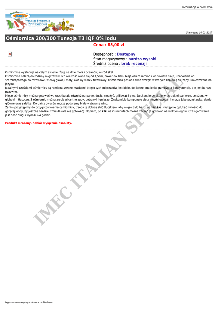 Informacje o produkcie Utworzono 04-03-2017 Ośmiornica 200/300 Tunezja T3 IQF 0% lodu Cena : 85,00 zł Dostępność : Dostępny Stan magazynowy : bardzo wysoki Średnia ocena : brak recenzji SP EC IA L Ośmiornice wystepują na całym świecie. Żyją na dnie mórz i oceanów, wśród skał. Ośmiornice należą do rodziny mięczaków. Ich wielkość waha się od 1,5cm, nawet do 10m. Mają osiem ramion i workowate ciało, ubarwienie od szarobrązowego po różowawe, wielką głowę i mały, owalny worek trzewiowy. Ośmiornica posiada dwie szczęki w których znajdują się zęby, umieszczone na języku. Jadalnymi częściami ośmiornicy są ramiona, zwane mackami. Mięso tych mięczaków jest białe, delikatne, ma lekko gumowatą konsystencję, ale jest bardzo pożywne. Mięso ośmiornicy można gotować we wrzątku ale również na parze, dusić, smażyć, grillować i piec. Doskonale smakuje w chrupkiej panierce, smażona w głębokim tłuszczu. Z ośmiornic można zrobić pikantne zupy, potrawki i gulasze. Znakomicie komponuje się z innymi owocami morza jako przystawka, danie główne oraz sałatka. Do dań z owoców morza podajemy białe wytrawne wino. Zanim przystąpimy do przygotowywania ośmiornicy, trzeba ją dobrze zbić tłuczkiem, aby mięso było bardziej miękkie. Następnie opłukać i włożyć do gorącej wody, by jeszcze bardziej zmiękła (ale nie gotować). Dopiero, po kilkunastu minutach można zacząć ją gotować na wolnym ogniu. Czas gotowania jest dość długi i wynosi 2-4 godzin. IM EC IT AL IA N Produkt mrożony, odbiór wyłącznie osobisty. Wygenerowano w programie www.oscGold.com