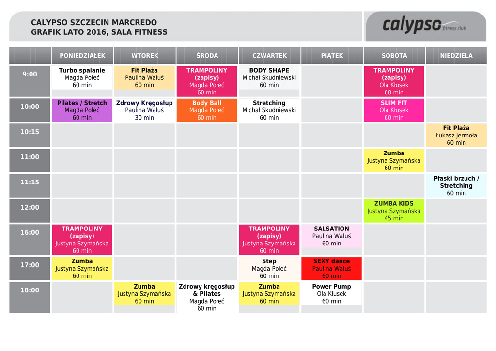 CALYPSO SZCZECIN MARCREDO GRAFIK LATO 2016, SALA FITNESS 9:00 10:00 PONIEDZIAŁEK WTOREK ŚRODA CZWARTEK PIĄTEK SOBOTA Turbo spalanie Magda Połeć 60 min Fit Plaża Paulina Waluś 60 min TRAMPOLINY (zapisy) Magda Połeć 60 min BODY SHAPE Michał Skudniewski 60 min TRAMPOLINY (zapisy) Ola Kłusek 60 min Pilates / Stretch Magda Połeć 60 min Zdrowy Kręgosłup Paulina Waluś 30 min Body Ball Magda Połeć 60 min Stretching Michał Skudniewski 60 min SLIM FIT Ola Kłusek 60 min Fit Plaża Łukasz Jermoła 60 min 10:15 Zumba Justyna Szymańska 60 min 11:00 Płaski brzuch / Stretching 60 min 11:15 ZUMBA KIDS Justyna Szymańska 45 min 12:00 16:00 17:00 18:00 NIEDZIELA TRAMPOLINY (zapisy) Justyna Szymańska 60 min TRAMPOLINY (zapisy) Justyna Szymańska 60 min SALSATION Paulina Waluś 60 min Zumba Justyna Szymańska 60 min Step Magda Połeć 60 min SEXY dance Paulina Waluś 60 min Zumba Justyna Szymańska 60 min Power Pump Ola Kłusek 60 min Zumba Justyna Szymańska 60 min Zdrowy kręgosłup & Pilates Magda Połeć 60 min 19:00 20:00 Fit Plaża Magda Połeć 60 min TRAMPOLINY (zapisy) Ola Kłusek 60 min Fit Plaża Krzysztof Barcz 60 min TRAMPOLINY (zapisy) Krzysztof Barcz 60 min SEXY dance Magda Połeć 60 min Power Pump Ola Kłusek 60 min Zdrowy Kręgosłup Krzysztof Barcz 60 min Płaski brzuch / Stretching Krzysztof Barcz 60 min TRAMPOLINY (zapisy) PAULINA ŁUKOMSKA 60 min 21:00 21:15 SALSATION Paulina Waluś 45 min