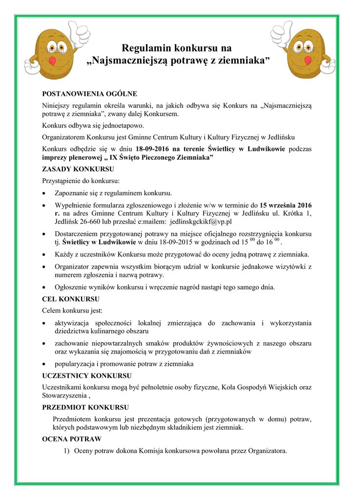 Regulamin konkursu na „Najsmaczniejszą potrawę z ziemniaka” POSTANOWIENIA OGÓLNE Niniejszy regulamin określa warunki, na jakich odbywa się Konkurs na „Najsmaczniejszą potrawę z ziemniaka”, zwany dalej Konkursem. Konkurs odbywa się jednoetapowo. Organizatorem Konkursu jest Gminne Centrum Kultury i Kultury Fizycznej w Jedlińsku Konkurs odbędzie się w dniu 18-09-2016 na terenie Świetlicy w Ludwikowie podczas imprezy plenerowej ,, IX Święto Pieczonego Ziemniaka” ZASADY KONKURSU Przystąpienie do konkursu: Zapoznanie się z regulaminem konkursu. Wypełnienie formularza zgłoszeniowego i złożenie w/w w terminie do 15 września 2016 r. na adres Gminne Centrum Kultury i Kultury Fizycznej w Jedlińsku ul. Krótka 1, Jedlińsk 26-660 lub przesłać e:mailem: [email protected] Dostarczeniem przygotowanej potrawy na miejsce oficjalnego rozstrzygnięcia konkursu tj. Świetlicy w Ludwikowie w dniu 18-09-2015 w godzinach od 15 00 do 16 00 . Każdy z uczestników Konkursu może przygotować do oceny jedną potrawę z ziemniaka. Organizator zapewnia wszystkim biorącym udział w konkursie jednakowe wizytówki z numerem zgłoszenia i nazwą potrawy. Ogłoszenie wyników konkursu i wręczenie nagród nastąpi tego samego dnia. CEL KONKURSU Celem konkursu jest: aktywizacja społeczności lokalnej zmierzająca do zachowania i wykorzystania dziedzictwa kulinarnego obszaru zachowanie niepowtarzalnych smaków produktów żywnościowych z naszego obszaru oraz wykazania się znajomością w przygotowaniu dań z ziemniaków popularyzacja i promowanie potraw z ziemniaka UCZESTNICY KONKURSU Uczestnikami konkursu mogą być pełnoletnie osoby fizyczne, Koła Gospodyń Wiejskich oraz Stowarzyszenia , PRZEDMIOT KONKURSU Przedmiotem konkursu jest prezentacja gotowych (przygotowanych w domu) potraw, których podstawowym lub niezbędnym składnikiem jest ziemniak. OCENA POTRAW 1) Oceny potraw dokona Komisja konkursowa powołana przez Organizatora. 2) Decyzje Komisji konkursowej są ostateczne i nie przysługuje od nich odwołanie. 3) Każda potrawa zostanie oceniona w pod względem: Estetyki podania 5 pkt Walorów smakowych i zapachowych 10 pkt Związków z tradycją kulinarną Mazowsza 5 pkt Członkowie Komisji konkursowej oceniają zgłoszone do konkursu potrawy poprzez wypełnienie specjalnie do tego przygotowanych przez Organizatora kart oceny. Wygrywają te dania, które uzyskują najwyższą łączną liczbę punktów max 20 pkt. przyznaną przez komisję konkursową. W przypadku, gdy taka sama liczbę punktów uzyskują dwa lub więcej dań, głos rozstrzygający należy do przewodniczącego komisji. NAGRODY Spośród zgłoszonych do konkurs potraw jury przyzna nagrody za, I, II, III miejsca. Decyzja jury jest ostateczna i nieodwołalna. Ogłoszenie werdyktu jury i wręczenie nagród nastąpi tego samego dnia podczas ,, IX Święto Pieczonego Ziemniaka” zgodnie z programem imprezy. POSTANOWIENIA KOŃCOWE 1) Organizator zastrzega sobie prawo zmiany niniejszego Regulaminu w każdym czasie bez podania przyczyn. 2) Komisja konkursowa zostaje powołana przez organizatora konkursu. 3) Udział w konkursie oznacza wyrażenie zgody na przetwarzanie danych osobowych (imię, nazwisko, adres) bez odrębnego wynagrodzenia, 4) Organizatorzy nie zwracają kosztów podróży oraz kosztów produktów potrzebnych do wykonania dań konkursowych. 5) Informacje o wyróżnionych i ich produktach zostaną opublikowane na stronie internetowej www. ck.jedlinsk.pl KARTA ZGŁOSZENIA KONKURS KULINARNY „Najsmaczniejsza potrawa z ziemniaka” 1.Imię i nazwisko uczestnika :............................................................ 2. Adres :............................................................................................................................... 3. Telefon kontaktowy oraz adres e- mail: .................................................................................. 4. Nazwa przygotowanej potrawy: .............................................................................................. ................................................................................................ .............................................................. /Data i podpis uczestnika konkursu/
