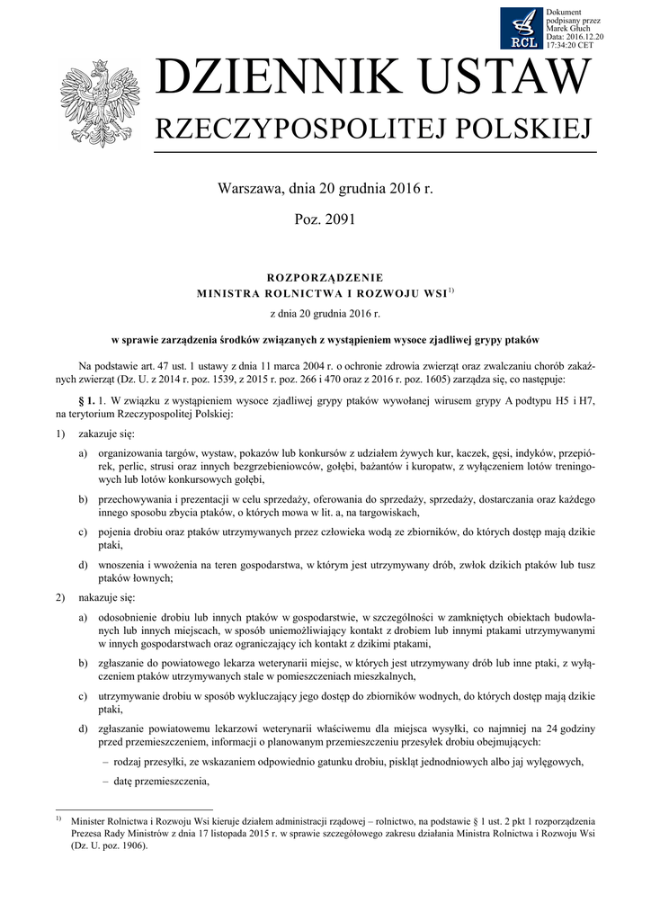 Dokument podpisany przez Marek Głuch Data: 2016.12.20 17:34:20 CET DZIENNIK USTAW RZECZYPOSPOLITEJ POLSKIEJ Warszawa, dnia 20 grudnia 2016 r. Poz. 2091 RO ZP O RZĄDZENIE M INISTRA RO LNICTWA I RO ZWO J U WSI 1) z dnia 20 grudnia 2016 r. w sprawie zarządzenia środków związanych z wystąpieniem wysoce zjadliwej grypy ptaków Na podstawie art. 47 ust. 1 ustawy z dnia 11 marca 2004 r. o ochronie zdrowia zwierząt oraz zwalczaniu chorób zakaźnych zwierząt (Dz. U. z 2014 r. poz. 1539, z 2015 r. poz. 266 i 470 oraz z 2016 r. poz. 1605) zarządza się, co następuje: § 1. 1. W związku z wystąpieniem wysoce zjadliwej grypy ptaków wywołanej wirusem grypy A podtypu H5 i H7, na terytorium Rzeczypospolitej Polskiej: 1) zakazuje się: a) organizowania targów, wystaw, pokazów lub konkursów z udziałem żywych kur, kaczek, gęsi, indyków, przepiórek, perlic, strusi oraz innych bezgrzebieniowców, gołębi, bażantów i kuropatw, z wyłączeniem lotów treningowych lub lotów konkursowych gołębi, b) przechowywania i prezentacji w celu sprzedaży, oferowania do sprzedaży, sprzedaży, dostarczania oraz każdego innego sposobu zbycia ptaków, o których mowa w lit. a, na targowiskach, c) pojenia drobiu oraz ptaków utrzymywanych przez człowieka wodą ze zbiorników, do których dostęp mają dzikie ptaki, d) wnoszenia i wwożenia na teren gospodarstwa, w którym jest utrzymywany drób, zwłok dzikich ptaków lub tusz ptaków łownych; 2) nakazuje się: a) odosobnienie drobiu lub innych ptaków w gospodarstwie, w szczególności w zamkniętych obiektach budowlanych lub innych miejscach, w sposób uniemożliwiający kontakt z drobiem lub innymi ptakami utrzymywanymi w innych gospodarstwach oraz ograniczający ich kontakt z dzikimi ptakami, b) zgłaszanie do powiatowego lekarza weterynarii miejsc, w których jest utrzymywany drób lub inne ptaki, z wyłączeniem ptaków utrzymywanych stale w pomieszczeniach mieszkalnych, c) utrzymywanie drobiu w sposób wykluczający jego dostęp do zbiorników wodnych, do których dostęp mają dzikie ptaki, d) zgłaszanie powiatowemu lekarzowi weterynarii właściwemu dla miejsca wysyłki, co najmniej na 24 godziny przed przemieszczeniem, informacji o planowanym przemieszczeniu przesyłek drobiu obejmujących: – rodzaj przesyłki, ze wskazaniem odpowiednio gatunku drobiu, piskląt jednodniowych albo jaj wylęgowych, – datę przemieszczenia, 1) Minister Rolnictwa i Rozwoju Wsi kieruje działem administracji rządowej – rolnictwo, na podstawie § 1 ust. 2 pkt 1 rozporządzenia Prezesa Rady Ministrów z dnia 17 listopada 2015 r. w sprawie szczegółowego zakresu działania Ministra Rolnictwa i Rozwoju Wsi (Dz. U. poz. 1906). Dziennik Ustaw –2– Poz. 2091 – miejsce wysyłki i miejsce przeznaczenia, – liczbę ptaków, e) przechowywanie paszy dla ptaków w sposób zabezpieczający przed kontaktem z dzikimi ptakami oraz ich odchodami, f) karmienie i pojenie drobiu oraz ptaków utrzymywanych w niewoli w sposób zabezpieczający paszę i wodę przed dostępem dzikich ptaków oraz ich odchodami, g) wyłożenie mat dezynfekcyjnych przed wejściami i wyjściami z budynków inwentarskich, w których jest utrzymywany drób, a w przypadku braku niecek dezynfekcyjnych – przed wjazdami i wyjazdami z gospodarstwa, w którym jest utrzymywany drób, oraz stałe utrzymywanie wyłożonych mat lub niecek dezynfekcyjnych w stanie zapewniającym skuteczne działanie środka dezynfekcyjnego, h) stosowanie przez osoby wchodzące do budynków inwentarskich, w których jest utrzymywany drób, odzieży ochronnej oraz obuwia ochronnego, przeznaczonych do użytku wyłącznie w danym budynku, i) stosowanie przez osoby wykonujące czynności związane z obsługą drobiu zasad higieny osobistej, w tym mycie rąk przed wejściem do budynków inwentarskich, j) oczyszczanie i odkażanie sprzętu i narzędzi używanych do obsługi drobiu przed każdym ich użyciem, k) powstrzymanie się przez osoby, które w ciągu ostatnich 72 godzin uczestniczyły w polowaniu na ptaki łowne, od wykonywania czynności związanych z obsługą drobiu, l) dokonywanie codziennego przeglądu stad drobiu wraz z prowadzeniem dokumentacji zawierającej w szczególności informacje na temat liczby padłych ptaków, spadku pobierania paszy lub nieśności. 2. Posiadacz drobiu zawiadamia organ Inspekcji Weterynaryjnej albo najbliższy podmiot świadczący usługi z zakresu medycyny weterynaryjnej o wystąpieniu u drobiu następujących objawów klinicznych: 1) zwiększonej śmiertelności; 2) znaczącego spadku pobierania paszy i wody; 3) objawów nerwowych takich jak: drgawki, skręty szyi, paraliż nóg i skrzydeł, niezborność ruchów; 4) duszności; 5) sinicy i wybroczyn; 6) biegunki; 7) nagłego spadku nieśności. 3. Dzierżawcy lub zarządcy obwodów łowieckich zgłaszają organowi Inspekcji Weterynaryjnej albo najbliższemu podmiotowi świadczącemu usługi z zakresu medycyny weterynaryjnej przypadki zwiększonej śmiertelności dzikich ptaków. § 2. 1. Dopuszcza się, po uzyskaniu zgody powiatowego lekarza weterynarii, zorganizowanie targu, wystawy, pokazu lub konkursu z udziałem żywych ptaków, wyłącznie w pomieszczeniu uniemożliwiającym kontakt tych ptaków z dzikim ptakami. 2. Powiatowy lekarz weterynarii wyraża zgodę, o której mowa w ust. 1, jeżeli: 1) podmiot zamierzający zorganizować: a) targ, wystawę lub konkurs z udziałem żywych ptaków przedstawi – w terminie co najmniej 30 dni przed planowaną datą tego targu, wystawy lub konkursu, b) pokaz z udziałem żywych ptaków przedstawi – w terminie co najmniej 7 dni przed planowaną datą tego pokazu – wykaz gospodarstw, z których będą pochodzić ptaki, z udziałem których ma zostać zorganizowany odpowiednio targ, wystawa, konkurs lub pokaz; 2) przeprowadzona przez tego lekarza analiza ryzyka wykaże, że zorganizowanie targu, wystawy, pokazu lub konkursu z udziałem żywych ptaków nie spowoduje zagrożenia 