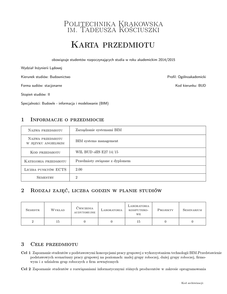 Zarządzanie systemami BIM - Syllabus