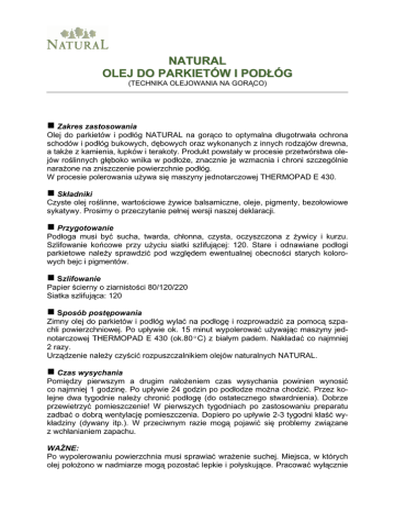 NATURAL OLEJ DO PARKIETÓW I PODŁÓG (TECHNIKA OLEJOWANIA NA GORĄCO) g Zakres zastosowania Olej do parkietów i podłóg NATURAL na gorąco to optymalna długotrwała ochrona schodów i podłóg bukowych, dębowych oraz wykonanych z innych rodzajów drewna, a także z kamienia, łupków i terakoty. Produkt powstały w procesie przetwórstwa olejów roślinnych głęboko wnika w podłoże, znacznie je wzmacnia i chroni szczególnie narażone na zniszczenie powierzchnie podłóg. W procesie polerowania używa się maszyny jednotarczowej THERMOPAD E 430. g Składniki Czyste olej roślinne, wartościowe żywice balsamiczne, oleje, pigmenty, bezołowiowe sykatywy. Prosimy o przeczytanie pełnej wersji naszej deklaracji. g Przygotowanie Podłoga musi być sucha, twarda, chłonna, czysta, oczyszczona z żywicy i kurzu. Szlifowanie końcowe przy użyciu siatki szlifującej: 120. Stare i odnawiane podłogi parkietowe należy sprawdzić pod względem ewentualnej obecności starych kolorowych bejc i pigmentów. g Szlifowanie Papier ścierny o ziarnistości 80/120/220 Siatka szlifująca: 120 g Sposób postępowania Zimny olej do parkietów i podłóg wylać na podłogę i rozprowadzić za pomocą szpachli powierzchniowej. Po upływie ok. 15 minut wypolerować używając maszyny jednotarczowej THERMOPAD E 430 (ok.80ºC) z białym padem. Nakładać co najmniej 2 razy. Urządzenie należy czyścić rozpuszczalnikiem olejów naturalnych NATURAL. g Czas wysychania Pomiędzy pierwszym a drugim nałożeniem czas wysychania powinien wynosić co najmniej 1 godzinę. Po upływie 24 godzin po podłodze można chodzić. Przez kolejne dwa tygodnie należy chronić podłogę (do ostatecznego stwardnienia). Dobrze przewietrzyć pomieszczenie! W pierwszych tygodniach po zastosowaniu preparatu zadbać o dobrą wentylację pomieszczenia. Dopiero po upływie 2-3 tygodni kłaść wykładziny (dywany itp.). W przeciwnym razie mogą pojawić się problemy związane z wchłanianiem zapachu. WAŻNE: Po wypolerowaniu powierzchnia musi sprawiać wrażenie suchej. Miejsca, w których olej położono w nadmiarze mogą pozostać lepkie i połyskujące. Pracować wyłącznie na zimnej podłodze. Do czasu zakończenia prac należy koniecznie wyłączyć ogrzewanie podłogowe! g Gatunki drewna zawierające kwas garbnikowy (dąb itd.) oraz ciemne podłogi należy po ok. 10 -14 dniach zmyć na ciepło za pomocą specjalnego środka czyszczącego – ługu mydlarskiego. W ten sposób zostaną usunięte rozpuszczalne w wodzie pigmenty, które mogły wytrącić się z drewna. Można następnie nanieść na powierzchnię cienką warstwę oleju wykończeniowego „Finish” NATURAL i wypolerować. g Egzotyczne gatunki drewna Ciemne i szczególnie bogate w pigmenty gatunki drewna egzotycznego należy po szlifowaniu wykończeniowym dobrze przetrzeć alkoholowym rozpuszczalnikiem NATURAL, wykonać kontrolnie test wodny, w razie potrzeby ponownie przetrzeć alkoholowym rozpuszczalnikiem. W przypadku drewna egzotycznego na zakończenie koniecznie użyć pszczelego wosku do podłóg NATURAL. g Silnie nasiąkające gatunki drewna W przypadku olchy i buku konieczne jest nałożenie większej ilości produktu. Przy pierwszym nakładaniu oleju do parkietów i podłóg zalecamy nanoszenie preparatu przy użyciu rolki z krótkim włosiem. Nadmiar należy zaszpachlować po upływie ok. 10 minut. g Możliwości dalszej obróbki Gorący wosk NATURAL (wypolerować do osiągnięcia jedwabistej gładkości), olej wykończeniowy NATURAL – nałożyć cienką warstwę i wypolerować. g Pielęgnacja W ciągu pierwszych dwóch tygodni czyścić tylko na sucho. Do bieżącej pielęgnacji polecamy: specjalny środek czyszczący NATURAL oraz twardy wosk nabłyszczający. W żadnym wypadku nie używać do czyszczenia podłogi ścierek z mikrowłókna. Jeżeli konieczne jest gruntowne oczyszczenie powierzchni, polecamy intensywny środek czyszczący NATURAL. W razie potrzeby miejscowo nanosić na powierzchnię podłogi pielęgnacyjny olej woskowy. g Wskazówka Podczas pierwszego nakładania oleju np. na drewno bukowe może dojść do powstania tak zwanych „nakładek” (śladów szpachla), jeżeli podczas nakładania nachodzących na siebie warstw mają miejsce dłuższe przerwy. Z tego powodu zalecamy, by nakładanie oleju odbywało się w sposób równomierny i ciągły. g Zużycie 20-30g/m² na jedno nałożenie, w zależności od rodzaju drewna g Dane techniczne Temperatura zapłonu powyżej 100ºC UWAGA! Szmatki nasączone olejem należy koniecznie przechowywać w zamkniętych pojemnikach (blaszanych puszkach), większe płaty rozwieszać rozłożone lub wyprać w roślinnym mydle olejowym. Istnieje możliwość samozapalenia ze względu na obecność schnących olejów roślinnych! Produkt zawiera kobalt. Podczas wstępnego i pośredniego szlifowania zalecamy używanie maski przeciwpyłowej. g Przechowywanie Produkt należy przechowywać w dobrze zamkniętym pojemniku i w miejscu niedostępnym dla dzieci. g Postępowanie z resztkami Resztki farby i rozpuszczalników, także tych pochodzenia naturalnego, nie powinny dostać się do ścieków ani do gruntu! Całkowicie opróżnione puszki lub zaschnięte resztki farby nie stanowią odpadów o charakterze specjalnym i mogą być odprowadzone na złom, względnie wyrzucone ze zwykłymi odpadami. g Regulacje prawne W razie potrzeby należy zażądać wydania karty charakterystyki substancji chemicznej. g Ogólne informacje dotyczące produktów NATURAL NATURFARBEN Produkty NATURAL NATURFARBEN są wytwarzane zgodnie z kompleksowym ujęciem problematyki kolorów i środowiska. Surowce pochodzą z zamkniętego obiegu ekologicznego, a kiedy po wykorzystaniu stają się odpadami, ulegają w nim całkowitemu rozpadowi. Wszystkie składniki są kontrolowane zgodnie z zasadami biologii budowlanej i przy wykorzystaniu łagodnej, bezodpadowej technologii przetwarzane na farby i środki powlekające. Wszystkie dane są
