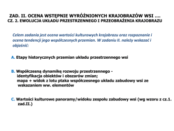 ZAD. II. OCENA WSTĘPNIE WYRÓŻNIONYCH KRAJOBRAZÓW WSI …. CZ. 2. EWOLUCJA UKŁADU PRZESTRZENNEGO I PRZEOBRAŻENIA KRAJOBRAZU Celem zadania jest ocena wartości kulturowych krajobrazu oraz rozpoznanie i ocena tendencji jego współczesnych przemian. W zadaniu II. należy wskazad i objaśnid: A. Etapy historycznych przemian układu przestrzennego wsi B. Współczesną dynamikę rozwoju przestrzennego identyfikacja obiektów i obszarów zmian; mapa + widok z lotu ptaka współczesnego układu zabudowy wsi ze wskazaniem ww. elementów C. Wartości kulturowe panoramy/widoku zespołu zabudowy wsi (wg wzoru z cz.1. zad.II.) ZAD. II. OCENA WSTĘPNIE WYRÓŻNIONYCH KRAJOBRAZÓW WSI …. CZ. 2. EWOLUCJA UKŁADU PRZESTRZENNEGO I PRZEOBRAŻENIA KRAJOBRAZU wskazówki A. Historię rozwoju przestrzennego zilustrować na schematach w jednakowej dla wszystkich etapów skali. Porównać je z mapami archiwalnymi. Nazwać i umiejscowić w czasie rozpoznane typy układów przestrzennych. Opisać krótko ich kontekst historyczny. B. Analizę dynamiki współczesnego rozwoju wsi przeprowadzić na mapie w skali 1:10000/1:5000/1:2000. Oznaczyć kolorami: • obiekty pod ochroną i opieką konserwatorską (zieleń, zabudowa) • zabudowa po-pegeeorowska • obiekty z lat 70. - 80. (np .„kostki”) • obiekty współczesne (●zabudowa, ●infrastruktura, ●zagospodarowanie terenu) Ocenić wartość kulturową obiektów (określić symbolem lub kolorem wartość wysoką, średnią, niską) Na rysunku z lotu ptaka wskazać ww. elementy. Opisać ich kluczowe cechy i ocenić krajobrazowe skutki przemian. Określić tendencje rozwoju przestrzennego wsi. C. Wybrać reprezentatywną dla współczesnych przemian panoramę/widok. Ocenić wartości kulturowe zespołów lub obiektów. ZAD. II. OCENA WSTĘPNIE WYRÓŻNIONYCH KRAJOBRAZÓW WSI …. CZ. 2. EWOLUCJA UKŁADU PRZESTRZENNEGO I PRZEOBRAŻENIA KRAJOBRAZU Propozycja układu pracy 1./2. Karta ROZWÓJ UKŁADU PRZESTRZENNEGO WSI (zabudowa i rozłóg) DO XX WIEKU ….XX w. + kserokopie map wsi + komentarze 2./3. Karta Zabudowa wsi socjalistycznej , wsi lat 90- tych i wsi współczesnej. Mapa(2D) WARTOŚĆ KULTUROWA KRAJOBRAZU WSI Zmiana obrazu wsi od poł. XX wieku Widok z lotu ptaka(3D) Zmiana obrazu wsi od poł. XX wieku. Rysunek panoramy + ocena i komentarze