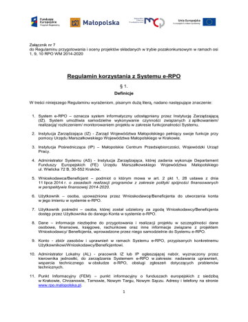 Załącznik nr 7 do Regulaminu przygotowania i oceny projektów składanych w trybie pozakonkursowym w ramach osi 1, 9, 10 RPO WM 2014-2020 Regulamin korzystania z Systemu e-RPO § 1. Definicje W treści niniejszego Regulaminu wyrażeniom, pisanym dużą literą, nadano następujące znaczenie: 1. System e-RPO – oznacza system informatyczny udostępniany przez Instytucję Zarządzającą (IZ). System umożliwia samodzielne wykonywanie czynności związanych z aplikowaniem/ realizacją/ rozliczeniem/ monitorowaniem projektu w zakresie funkcjonalności Systemu. 2. Instytucja Zarządzająca (IZ) - Zarząd Województwa Małopolskiego pełniący swoje funkcje przy pomocy Urzędu Marszałkowskiego Województwa Małopolskiego w Krakowie. 3. Instytucja Pośrednicząca (IP) – Małopolskie Centrum Przedsiębiorczości, Wojewódzki Urząd Pracy. 4. Administrator Systemu (AS) - Instytucja Zarządzająca, której zadania wykonuje Departament Funduszy Europejskich (FE) Urzędu Marszałkowskiego Województwa Małopolskiego ul. Wielicka 72 B, 30-552 Kraków. 5. Wnioskodawca/Beneficjent – podmiot o którym mowa w art. 2 pkt 1, 28 ustawa z dnia 11 lipca 2014 r. o zasadach realizacji programów z zakresie polityki spójności finansowanych w perspektywie finansowej 2014-2020. 6. Użytkownik – osoba, upoważniona przez Wnioskodawcę/Beneficjenta do utworzenia konta w jego imieniu w systemie e-RPO. 7. Użytkownik pośredni – osoba, której został udzielony za zgodą Wnioskodawcy/Beneficjenta dostęp przez Użytkownika do danego Konta w systemie e-RPO. 8. Dane – informacje niezbędne do przygotowania i realizacji projektu w szczególności dane osobowe, finansowe, księgowe, rachunkowe oraz inne informacje związane z projektem Wnioskodawcy/ Beneficjenta, wprowadzone przez niego samodzielnie do Systemu e-RPO. 9. Konto - zbiór zasobów i uprawnień w ramach Systemu e-RPO, przypisanych konkretnemu Użytkownikowi/Wnioskodawcy/Beneficjentowi. 10. Administrator Lokalny (AL) - pracownik IZ lub IP ogłaszającej nabór, wyznaczony przez kierownika jednostki, do zarządzania Systemem e-RPO w zakresie: nadawania uprawnień, wsparcia technicznego w obsłudze e-RPO, obsługi zgłoszeń dotyczących problemów technicznych. 11. Punkt Informacyjny (FEM) – punkt informacyjny o funduszach europejskich z siedzibą w Krakowie, Chrzanowie, Tarnowie, Nowym Targu, Nowym Sączu. Adresy i telefony na stronie www.rpo.malopolska.pl. 1 12. Regulamin - oznacza niniejszy dokument. 13. RPO WM - Regionalny Program Operacyjny Województwa Małopolskiego na lata 2014-2020. 14. Bezpieczny podpis elektroniczny – podpis elektroniczny w rozumieniu art. 3 pkt. 2 ustawy z dnia 18 września 2001 r. o podpisie elektronicznym (Dz. U. z 2013 r. poz. 262 z późn. zm.), który jest przyporządkowany wyłącznie do osoby składającej ten podpis, jest sporządzany za pomocą podlegających wyłącznej kontroli osoby składającej podpis elektroniczny bezpiecznych urządzeń służących do składania podpisu elektronicznego i danych służących do składania podpisu elektronicznego, jest powiązany z danymi, do których został dołączony, w taki sposób, że jakakolwiek późniejsza zmiana tych danych jest rozpoznawalna. § 2. System e-RPO 1. System e-RPO jest lokalnym systemem informatycznym wspierającym wdrażanie RPO WM na lata 2014-2020. Decyzja o budowie systemu została podjęta przez IZ RPO. 2. Korzystanie z Systemu e-RPO wymaga uprzedniej rejestracji w celu założenia konta. 3. Zakładane Konto należy do Użytkownika. Użytkownik może korzystać z Systemu e-RPO za pomocą dowolnego komputera połączonego z internetem, przy spełnieniu wymagań technicznych określonych w paragrafie 7. 4. System e-RPO umożliwia w szczególności: a. b. c. d. e. wprowadzanie, przechowywanie, modyfikowanie Danych aplikowanie o wsparcie finansowe (wniosek aplikacyjny) rozliczenie projektu w ramach RPO WM (wniosek o płatność/ postępowania kontrolne) monitorowanie trwałości projektu prowadzenie wszelkiej korespondencji pomiędzy IZ lub IP a Wnioskodawcą/ Beneficjentem 5. System e-RPO umożliwia Użytkownikowi, po uprzednim zalogowaniu się do Konta, wprowadzanie Danych oraz korzystanie z Systemu, w celu wykonywania czynności określonych w pkt.4. 6. Systemu e-RPO może ulec modyfikacji w trakcie korzystania przez Użytkownika o czym Użytkownik zostanie poinformowany. 7. Szczegółowe warunki ubiegania się o dofinansowanie za pośrednictwem systemu e-RPO jak i sposób korespondencji określony zostanie każdorazowo w Regulaminie konkursu, jak również w umowie o dofinansowanie projektu. 8. Składanie przez Wnioskodawcę/Beneficjenta wniosku aplikacyjnego, wniosku o płatność, załączników, oświadczeń, wszelkiej korespondencji możliwe jest wyłącznie za pośrednictwem Systemu e-RPO z wykorzystaniem bezpiecznego podpisu elektronicznego z ważnym certyfikatem kwalifikowalnym. 2 § 3. Rejestracja, ogólne zasady z korzystania z Systemu e-RPO 1. Warunkiem korzystania z Systemu e-RPO posiadanie konta w Systemie. 2. Rejestracja w Systemie e-RPO możliwa jest pod adresem: erpo.malopolska.pl. Użytkownik/Wnioskodawca/Beneficjent wprowadza wymagane dane i informacje za pomocą formularza rejestracji. Podaje własne: imię, nazwisko oraz adres e-mail oraz potwierdza, że zapoznał się z zapisami Regulaminu. System e-RPO, po uzyskaniu powyższych danych, w sposób automatyczny przesyła na podany w toku rejestracji adres poczty elektronicznej, wiadomość, która zawiera potwierdzenie rozpoczęcia procedury rejestracji. Do wiadomości załączony jest link, za pośrednictwem, którego Użytkownik/Wnioskodawca/Beneficjent aktywuje Konto i nadaje hasło dostępu przy pierwszym logowaniu do systemu. 3. Z chwilą zakończenia procedury rejestracji tworzone jest Konto. Dostęp do Konta możliwy jest pod adresem: erpo.malopolska.pl. 4. Wymagania dotyczące haseł do konta: a. b. c. d. Minimalna długość hasła wynosi 8 (osiem) znaków H