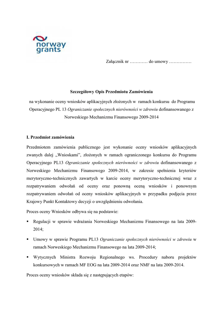 Załącznik nr ………… do umowy …………… Szczegółowy Opis Przedmiotu Zamówienia na wykonanie oceny wniosków aplikacyjnych złożonych w ramach konkursu do Programu Operacyjnego PL 13 Ograniczanie społecznych nierówności w zdrowiu dofinansowanego z Norweskiego Mechanizmu Finansowego 2009-2014 I. Przedmiot zamówienia Przedmiotem zamówienia publicznego jest wykonanie oceny wniosków aplikacyjnych zwanych dalej „Wnioskami”, złożonych w ramach ograniczonego konkursu do Programu Operacyjnego PL13 Ograniczanie społecznych nierówności w zdrowiu dofinansowanego z Norweskiego Mechanizmu Finansowego 2009-2014, w zakresie spełnienia kryteriów merytoryczno-technicznych zawartych w karcie oceny merytoryczno-technicznej wraz z rozpatrywaniem odwołań od oceny oraz ponowną oceną wniosków i ponownym rozpatrywaniem odwołań od oceny wniosków aplikacyjnych w przypadku podjęcia przez Krajowy Punkt Kontaktowy decyzji o uwzględnieniu odwołania. Proces oceny Wniosków odbywa się na podstawie: Regulacji w sprawie wdrażania Norweskiego Mechanizmu Finansowego na lata 20092014; Umowy w sprawie Programu PL13 Ograniczanie społecznych nierówności w zdrowiu w ramach Norweskiego Mechanizmu Finansowego na lata 2009-2014; Wytycznych Ministra Rozwoju Regionalnego ws. Procedury naboru projektów konkursowych w ramach MF EOG na lata 2009-2014 oraz NMF na lata 2009-2014. Proces oceny wniosków składa się z następujących etapów: oceny formalnej, która zostanie dokonana przez Operatora Programu, tj. Departament Funduszy Europejskich Ministerstwa Zdrowia, wykonujący zadania wynikające z pełnienia przez Ministra Zdrowia funkcji Operatora Programu; oraz oceny merytoryczno-technicznej, która zostanie przeprowadzona przez ekspertów zewnętrznych, niezależnych od: Operatora Programu, Komitetu ds. Wyboru Projektów, wnioskodawców i ich partnerów. II. Zakres zamówienia Zakres zamówienia obejmuje ocenę merytoryczno-techniczną wniosków, poprzez ocenę dokumentacji wniosków aplikacyjnych, pod kątem zgodności z kryteriami merytorycznotechnicznymi z dziedziny „ochrona zdrowia” wraz z rozpatrywaniem odwołań od oceny i z dziedziny „finanse i zarządzanie” wraz z rozpatrywaniem odwołań od oceny. Zakres zamówienia obejmuje również dokonanie ponownej oceny wniosków i ponownego rozpatrywania odwołań od oceny wniosków aplikacyjnych z dziedziny „ochrona zdrowia” oraz „finanse i zarządzanie” w przypadku podjęcia przez Krajowy Punkt Kontaktowy decyzji o uwzględnieniu odwołania. Każdy wniosek aplikacyjny spełniający kryteria formalne podlega ocenie merytorycznotechnicznej przez dwóch ekspertów z dziedziny „ochrona zdrowia” oraz dwóch z dziedziny „finanse i zarządzanie”. W przypadku, gdy różnica w ocenie danego wniosku przez dwóch ekspertów wyniesie więcej niż 30% wyższego wyniku, Wykonawca zleci niezależną ocenę tego wniosku trzeciemu ekspertowi. Od wyniku oceny merytoryczno-technicznej wnioskodawca może złożyć odwołanie do Operatora Programu. W przypadku podjęcia przez Krajowy Punkt Kontaktowy decyzji o uwzględnieniu odwołania wnioskodawcy Wykonawca zapewni dokonanie przez ekspertów ponownej oceny wniosków i ponowne rozpatrzenie odwołania od oceny wniosków aplikacyjnych z dziedziny „ochrona zdrowia” oraz „finanse i zarządzanie” Odwołania i ponowna ocena muszą być rozpatrywane przez ekspertów, którzy nie uczestniczyli w ocenie wniosku, którego dotyczy odwołanie. Ocena merytoryczno-techniczna z dziedziny „ochrona zdrowia” dokonywana jest na podstawie karty oceny merytoryczno – technicznej wniosku, stanowiącej załącznik nr 1 do SOPZ. 2 Ocena merytoryczno-techniczna z dziedziny „finanse i zarządzanie” dokonywana jest na podstawie karty oceny merytoryczno – technicznej wniosku, stanowiącej załącznik nr 2 do SOPZ. Przewiduje się, że do oceny merytoryczno-technicznej zostanie przekazanych maksymalnie 97 wniosków. Ostateczna liczba wniosków przekazanych do oceny uzależniona będzie od liczby wniosków złożonych w ramach konkursu, a następnie liczby wniosków, które pozytywnie przejdą ocenę formalną. Głównymi obowiązkami Wykonawcy w trakcie realizacji oceny wniosków będzie: 1. Przeprowadzenie rzetelnej i bezstronnej oceny wniosków zgłaszanych do ww. Programu, zgodnie z wymogami dla oceny merytoryczno-technicznej wniosków, zawartymi w Karcie oceny merytoryczno-technicznej wniosku pod kątem zgodności z kryteriami merytoryczno-technicznymi z dziedziny „ochrona zdrowia” oraz z dziedziny „finanse i zarządzanie” w miejscu wskazanym przez Zamawiającego. Zamawiający przewiduje, że miejscem realizacji zamówienia będzie siedziba Zamawiającego; 2. Zapewnienie niezbędnego sprzętu komputerowego, wyposażonego w program obsługujący pliki utworzone w pakiecie Programu Microsoft Office. Szczegółowe zasady oceny merytoryczno-technicznej: Zamówienie obejmuje wykonanie oceny wniosków, polegającej na przeprowadzeniu oceny merytoryczno-technicznej każdego wniosku z dziedziny „ochrona zdrowia” i z dziedziny „finanse i zarządzanie” wraz z rozpatrywaniem odwołań od oceny, tj. w przypadku każdego z poszczególnych wniosków przekazanych do oceny: 1. przeprowadzenie oceny merytoryczno-technicznej każdego wniosku aplikacyjnego przez Oceniającego A oraz 2. przeprowadzenie oceny merytoryczno-technicznej każdego wniosku aplikacyjnego przez Oceniającego B oraz 3. przeprowadzenie dodatkowej oceny merytoryczno-technicznej przez Oceniającego C w przypadku zaistnienia różnicy w ocenie wniosku między Oceniającym A i Oceniającym B większej niż 30% wyższego wyniku oraz 4. rozpatrzenie odwołania od oceny wspólnej ww. Oceniających (A, B i C) przez Oceniającego D, w przypadku złożenia odwołania przez wnioskodawcę od oceny wniosku do Operatora Programu. 3 5. dokonanie ponownej oceny wniosku i ponowne rozpatrzenie odwołania od oceny wniosku w przypadku 
