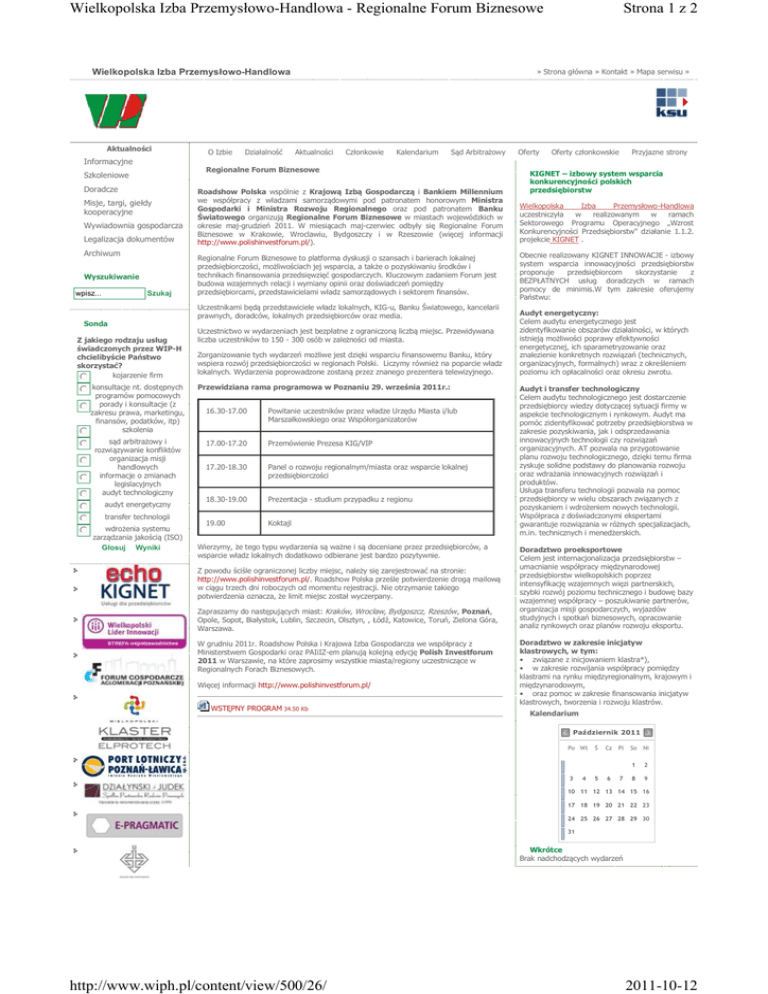 Wielkopolska Izba Przemysłowo-Handlowa - Regionalne Forum Biznesowe Wielkopolska Izba Przemysłowo-Handlowa Aktualności O Izbie Działalność Strona 1 z 2 » Strona główna » Kontakt » Mapa serwisu » Aktualności Członkowie Kalendarium Sąd Arbitrażowy Oferty Oferty członkowskie Przyjazne strony Informacyjne Regionalne Forum Biznesowe Szkoleniowe Doradcze Misje, targi, giełdy kooperacyjne Wywiadownia gospodarcza Legalizacja dokumentów Archiwum Wyszukiwanie wpisz... Szukaj Roadshow Polska wspólnie z Krajową Izbą Gospodarczą i Bankiem Millennium we współpracy z władzami samorządowymi pod patronatem honorowym Ministra Gospodarki i Ministra Rozwoju Regionalnego oraz pod patronatem Banku Światowego organizują Regionalne Forum Biznesowe w miastach wojewódzkich w okresie maj-grudzień 2011. W miesiącach maj-czerwiec odbyły się Regionalne Forum Biznesowe w Krakowie, Wroclawiu, Bydgoszczy i w Rzeszowie (więcej informacji http://www.polishinvestforum.pl/). Regionalne Forum Biznesowe to platforma dyskusji o szansach i barierach lokalnej przedsiębiorczości, możliwościach jej wsparcia, a także o pozyskiwaniu środków i technikach finansowania przedsięwzięć gospodarczych. Kluczowym zadaniem Forum jest budowa wzajemnych relacji i wymiany opinii oraz doświadczeń pomiędzy przedsiębiorcami, przedstawicielami władz samorządowych i sektorem finansów. Uczestnikami będą przedstawiciele władz lokalnych, KIG-u, Banku Światowego, kancelarii prawnych, doradców, lokalnych przedsiębiorców oraz media. Sonda Z jakiego rodzaju usług świadczonych przez WIP-H chcielibyście Państwo skorzystać? kojarzenie firm j k l m n j konsultacje nt. dostępnych k l m n programów pomocowych j porady i konsultacje (z k l m n zakresu prawa, marketingu, finansów, podatków, itp) szkolenia j k l m n sąd arbitrażowy i rozwiązywanie konfliktów organizacja misji j k l m n handlowych j informacje o zmianach k l m n legislacyjnych audyt technologiczny j k l m n j k l m n n j k l m j k l m n j k l m n audyt energetyczny transfer technologii wdrożenia systemu zarządzania jakością (ISO) Głosuj Wyniki Uczestnictwo w wydarzeniach jest bezpłatne z ograniczoną liczbą miejsc. Przewidywana liczba uczestników to 150 - 300 osób w zależności od miasta. Zorganizowanie tych wydarzeń możliwe jest dzięki wsparciu finansowemu Banku, który wspiera rozwój przedsiębiorczości w regionach Polski. Liczymy również na poparcie władz lokalnych. Wydarzenia poprowadzone zostaną przez znanego prezentera telewizyjnego. Przewidziana rama programowa w Poznaniu 29. września 2011r.: 16.30-17.00 Powitanie uczestników przez władze Urzędu Miasta i/lub Marszałkowskiego oraz Współorganizatorów 17.00-17.20 Przemówienie Prezesa KIG/VIP 17.20-18.30 Panel o rozwoju regionalnym/miasta oraz wsparcie lokalnej przedsiębiorczości 18.30-19.00 Prezentacja - studium przypadku z regionu 19.00 Koktajl Wierzymy, że tego typu wydarzenia są ważne i są doceniane przez przedsiębiorców, a wsparcie władz lokalnych dodatkowo odbierane jest bardzo pozytywnie. Z powodu ściśle ograniczonej liczby miejsc, należy się zarejestrować na stronie: http://www.polishinvestforum.pl/. Roadshow Polska prześle potwierdzenie drogą mailową w ciągu trzech dni roboczych od momentu rejestracji. Nie otrzymanie takiego potwierdzenia oznacza, że limit miejsc został wyczerpany. Zapraszamy do następujących miast: Kraków, Wrocław, Bydgoszcz, Rzeszów , Poznań, Opole, Sopot, Białystok, Lublin, Szczecin, Olsztyn, , Łódź, Katowice, Toruń, Zielona Góra, Warszawa. W grudniu 2011r. Roadshow Polska i Krajowa Izba Gospodarcza we współpracy z Ministerstwem Gospodarki oraz PAIiIZ-em planują kolejną edycję Polish Investforum 2011 w Warszawie, na które zaprosimy wszystkie miasta/regiony uczestniczące w Regionalnych Forach Biznesowych. Więcej informacji http://www.polishinvestforum.pl/ WSTĘPNY PROGRAM 34.50 Kb KIGNET – izbowy system wsparcia konkurencyjności polskich przedsiębiorstw Wielkopolska Izba Przemysłowo-Handlowa uczestniczyła w realizowanym w ramach Sektorowego Programu Operacyjnego „Wzrost Konkurencyjności Przedsiębiorstw" działanie 1.1.2. projekcie KIGNET . Obecnie realizowany KIGNET INNOWACJE - izbowy system wsparcia innowacyjności przedsiębiorstw proponuje przedsiębiorcom skorzystanie z BEZPŁATNYCH usług doradczych w ramach pomocy de minimis.W tym zakresie oferujemy Państwu: Audyt energetyczny: Celem audytu energetycznego jest zidentyfikowanie obszarów działalności, w których istnieją możliwości poprawy efektywności energetycznej, ich sparametryzowanie oraz znalezienie konkretnych rozwiązań (technicznych, organizacyjnych, formalnych) wraz z określeniem poziomu ich opłacalności oraz okresu zwrotu. Audyt i transfer technologiczny Celem audytu technologicznego jest dostarczenie przedsiębiorcy wiedzy dotyczącej sytuacji firmy w aspekcie technologicznym i rynkowym. Audyt ma pomóc zidentyfikować potrzeby przedsiębiorstwa w zakresie pozyskiwania, jak i odsprzedawania innowacyjnych technologii czy rozwiązań organizacyjnych. AT pozwala na przygotowanie planu rozwoju technologicznego, dzięki temu firma zyskuje solidne podstawy do planowania rozwoju oraz wdrażania innowacyjnych rozwiązań i produktów. Usługa transferu technologii pozwala na pomoc przedsiębiorcy w wielu obszarach związanych z pozyskaniem i wdrożeniem nowych technologii. Współpraca z doświadczonymi ekspertami gwarantuje rozwiązania w różnych specjalizacjach, m.in. technicznych i menedżerskich. Doradztwo proeksportowe Celem jest internacjonalizacja przedsiębiorstw – umacnianie współpracy międzynarodowej przedsiębiorstw wielkopolskich poprzez intensyfikację wzajemnych więzi partnerskich, szybki rozwój poziomu technicznego i budowę bazy wzajemnej współpracy – poszukiwanie partnerów, organizacja misji gospodarczych, wyjazdów studyjnych i spotkań biznesowych, opracowanie analiz ryn