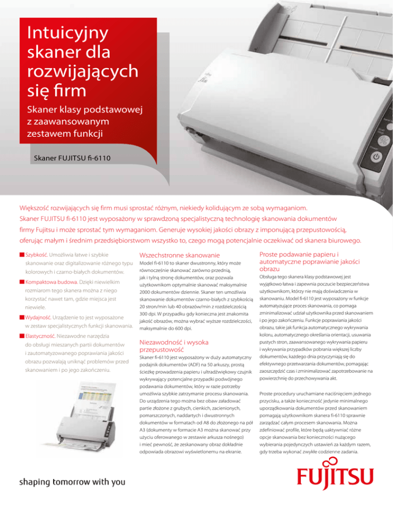 Intuicyjny skaner dla rozwijających się firm Skaner klasy podstawowej z zaawansowanym zestawem funkcji Skaner FUJITSU fi-6110 Większość rozwijających się firm musi sprostać różnym, niekiedy kolidującym ze sobą wymaganiom. Skaner FUJITSU fi-6110 jest wyposażony w sprawdzoną specjalistyczną technologię skanowania dokumentów firmy Fujitsu i może sprostać tym wymaganiom. Generuje wysokiej jakości obrazy z imponującą przepustowością, oferując małym i średnim przedsiębiorstwom wszystko to, czego mogą potencjalnie oczekiwać od skanera biurowego. Szybkość. Umożliwia łatwe i szybkie Wszechstronne skanowanie skanowanie oraz digitalizowanie różnego typu Model fi-6110 to skaner dwustronny, który może równocześnie skanować zarówno przednią, jak i tylną stronę dokumentów, oraz pozwala użytkownikom optymalnie skanować maksymalnie 2000 dokumentów dziennie. Skaner ten umożliwia skanowanie dokumentów czarno-białych z szybkością 20 stron/min lub 40 obrazów/min z rozdzielczością 300 dpi. W przypadku gdy konieczna jest znakomita jakość obrazów, można wybrać wyższe rozdzielczości, maksymalnie do 600 dpi. kolorowych i czarno-białych dokumentów. Kompaktowa budowa. Dzięki niewielkim rozmiarom tego skanera można z niego korzystać nawet tam, gdzie miejsca jest niewiele. Wydajność. Urządzenie to jest wyposażone w zestaw specjalistycznych funkcji skanowania. Elastyczność. Niezawodne narzędzia do obsługi mieszanych partii dokumentów i zautomatyzowanego poprawiania jakości obrazu pozwalają uniknąć problemów przed skanowaniem i po jego zakończeniu. Niezawodność i wysoka przepustowość Skaner fi-6110 jest wyposażony w duży automatyczny podajnik dokumentów (ADF) na 50 arkuszy, prostą ścieżkę prowadzenia papieru i ultradźwiękowy czujnik wykrywający potencjalne przypadki podwójnego podawania dokumentów, który w razie potrzeby umożliwia szybkie zatrzymanie procesu skanowania. Do urządzenia tego można bez obaw załadować partie złożone z grubych, cienkich, zacienionych, pomarszczonych, naddartych i dwustronnych dokumentów w formatach od A8 do złożonego na pół A3 (dokumenty w formacie A3 można skanować przy użyciu oferowanego w zestawie arkusza nośnego) i mieć pewność, że zeskanowany obraz dokładnie odpowiada obrazowi wyświetlonemu na ekranie. Proste podawanie papieru i automatyczne poprawianie jakości obrazu Obsługa tego skanera klasy podstawowej jest wyjątkowo łatwa i zapewnia poczucie bezpieczeństwa użytkownikom, którzy nie mają doświadczenia w skanowaniu. Model fi-6110 jest wyposażony w funkcje automatyzujące proces skanowania, co pomaga zminimalizować udział użytkownika przed skanowaniem i po jego zakończeniu. Funkcje poprawiania jakości obrazu, takie jak funkcja automatycznego wykrywania koloru, automatycznego określania orientacji, usuwania pustych stron, zaawansowanego wykrywania papieru i wykrywania przypadków pobrania większej liczby dokumentów, każdego dnia przyczyniają się do efektywnego przetwarzania dokumentów, pomagając zaoszczędzić czas i zminimalizować zapotrzebowanie na powierzchnię do przechowywania akt. Proste procedury uruchamiane naciśnięciem jednego przycisku, a także konieczność jedynie minimalnego uporządkowania dokumentów przed skanowaniem pomagają użytkownikom skanera fi-6110 sprawnie zarządzać całym procesem skanowania. Można zdefiniować profile, które będą uaktywniać różne opcje skanowania bez konieczności nużącego wybierania pojedynczych ustawień za każdym razem, gdy trzeba wykonać zwykłe codzienne zadania. Oprogramowanie oferowane w pakiecie Firma Fujitsu opracowała najlepszy w swojej klasie sterownik skanera oraz oprogramowanie do skanowania i przetwarzania obrazu Oprogramowanie PaperStream IP — zaawansowane udoskonalanie jakości obrazu Oprogramowanie PaperStream Capture — rozszerzone funkcje skanowania PaperStream IP to sterownik do skanera fi-6110. Sterownik ten jest w pełni Oprogramowanie PaperStream Capture to łatwe w zgodny z interfejsami TWAIN i ISIS, stanowiącymi standard branżowy. Ponadto obsłudze narzędzie do skanowania, które pozwala zawiera w konfiguracji standardowej zaawansowane funkcje przetwarzania użytkownikom łatwo konfigurować procedury obrazu, które automatycznie usuwają szumy i wzór tła oraz powiększają znaki, skanowania, obejmujące wszystkie ustawienia i parametry umożliwiając generowanie wyjątkowo wyraźnych, wysokiej jakości obrazów, konfiguracyjne niezbędne do sterowania tym procesem, od które użytkownik może bezpośrednio zaimportować do przepływu pracy. samego skanowania po przekazanie obrazu do przepływu pracy zdefiniowanego przez użytkownika lub firmę. Sterownik PaperStream IP jest wyposażony w intuicyjny, łatwy w obsłudze interfejs, który można przełączać między trybem administratora i użytkownika, Utworzone profile można później uruchamiać jednym aby uprościć proces skanowania i ograniczyć błędy popełniane przez kliknięciem, a te najczęściej używane podłączyć do użytkownika. przycisku skanowania umieszczonego na panelu przednim skanera fi-6110, aby uprościć cały proces. W sterowniku PaperStream IP wprowadzono także nowy tryb Assisted Scanning, w którym — zamiast ręcznie dostrajać kolejne parametry skanowania — użytkownik może wzrokowo wybrać spośród obrazów widocznych na stronie ten o najlepszej jakości. Specyfikacje Model Obsługiwane systemy operacyjne Typ skanera Tryby skanowania Typ czujnika obrazu Źródło światła fi-6110 Więcej informacji na stronie http://emea.fujitsu.com/fiscannerfaqs/ Automatyczny podajnik dokumentów (ADF) Jednostronne / dwustronne, w kolorze / w skali szarości / mono 2 matryce Colour CCD Lampa wyładowcza z białą zimną katodą Minimalnie: A8 w trybie portretowym (52 x 74 mm)/maksymalnie: A4 (210 x 297 mm) Skanowanie długich dokumentów: 3048 mm*1 52–127 g/m2 Rozmiar dokum