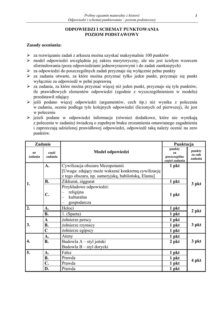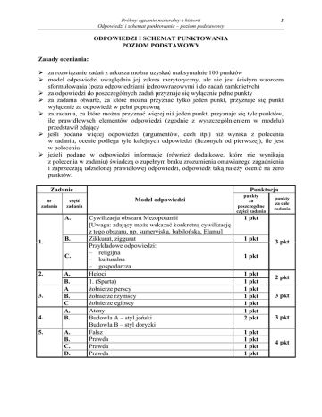 Próbny egzamin maturalny z historii Odpowiedzi i schemat punktowania – poziom podstawowy 1 ODPOWIEDZI I SCHEMAT PUNKTOWANIA POZIOM PODSTAWOWY Zasady oceniania: za rozwiązanie zadań z arkusza można uzyskać maksymalnie 100 punktów model odpowiedzi uwzględnia jej zakres merytoryczny, ale nie jest ścisłym wzorcem sformułowania (poza odpowiedziami jednowyrazowymi i do zadań zamkniętych) za odpowiedzi do poszczególnych zadań przyznaje się wyłącznie pełne punkty za zadania otwarte, za które można przyznać tylko jeden punkt, przyznaje się punkt wyłącznie za odpowiedź w pełni poprawną za zadania, za które można przyznać więcej niż jeden punkt, przyznaje się tyle punktów, ile prawidłowych elementów odpowiedzi (zgodnie z wyszczególnieniem w modelu) przedstawił zdający jeśli podano więcej odpowiedzi (argumentów, cech itp.) niż wynika z polecenia w zadaniu, ocenie podlega tyle kolejnych odpowiedzi (liczonych od pierwszej), ile jest w poleceniu jeżeli podane w odpowiedzi informacje (również dodatkowe, które nie wynikają z polecenia w zadaniu) świadczą o zupełnym braku zrozumienia omawianego zagadnienia i zaprzeczają udzielonej prawidłowej odpowiedzi, odpowiedź taką należy ocenić na zero punktów. Zadanie nr zadania część zadania A. 1. B. C. 2. 3. 4. 5. A. B. A B. C A. B. A. B. C. D. Punktacja Model odpowiedzi Cywilizacja obszaru Mezopotamii [Uwaga: zdający może wskazać konkretną cywilizację z tego obszaru, np. sumeryjską, babilońską, Elamu] Zikkurat, ziggurat Przykładowe odpowiedzi: – religijna – kulturalna – gospodarcza Heloci 1. (Sparta) żołnierze perscy żołnierze rzymscy żołnierze egipscy Ateny Budowla A – styl joński Budowla B – styl dorycki Fałsz Prawda Prawda Prawda punkty za poszczególne części zadania punkty za całe zadania 1 pkt 1 pkt 3 pkt 1 pkt 1 pkt 1 pkt 1 pkt 1 pkt 1 pkt 1 pkt 2 pkt 1 pkt 1 pkt 1 pkt 1 pkt 2 pkt 3 pkt 3 pkt 4 pkt Próbny egzamin maturalny z historii Odpowiedzi i schemat punktowania – poziom podstawowy 2 2. (Longobardów) 3. (Sasów) 6. 7. 8. A. B. 9. A. B. 10. 11. 2 Mapa 1. – 1000 rok Mapa 2. – 1370 rok Pomorze Śląsk Ilustracja 1. chłopi lub kmiecie Ilustracja 2. rycerstwo Ilustracja 3. duchowieństwo Przykładowe odpowiedzi: – Tak. Społeczeństwo w XI i XII wieku dzieliło się na takie same grupy społeczne. – Tak. Grupy społeczne w XI i XII wieku wykonywały takie same zajęcia. Uwaga: zdający może użyć określenia stan. 1 pkt za każdą poprawną odpowiedź 1 pkt 2 pkt 1 pkt za każdą odpowiedź 2 pkt 4 pkt 1 pkt za każdą prowincję 3 pkt 1 pkt za podanie każdej grupy społecznej 1 pkt za wyjaśnienie i argument A. B. C. 2. 2. 1. A. B. C. Założenie Akademii Krakowskiej (uniwersytetu) 1364 rok Przykładowe odpowiedzi: 1 pkt – korzyści dla Kościoła za każdy – korzyści dla państwa [króla] powód – upowszechnienie nauki [wiedzy] – rozwój szkolnictwa – rozsławienie Krakowa – rozwój Krakowa dzięki przybywaniu do miasta studentów, w tym przedstawicieli innych narodów Bolesław Śmiały (Szczodry) – monarchia 2 pkt 1 pkt za każde patrymonialna przyporządkoWładysław Jagiełło – monarchia stanowa 12. 2 pkt 1 pkt 1 pkt 1 pkt 1 pkt 1 pkt 2 pkt 4 pkt 3 pkt 4 pkt 2 pkt wanie 13. 14. 15. A. B. C. D B C – produkcja [manufaktury (jedwabnicza i sukiennicza)] – bankowość [finanse] – handel A – Ogłoszenie przez Marcina Lutra tez przeciwko odpustom B – Rzeź hugenotów w noc Świętego Bartłomieja 1 pkt 1 pkt 1 pkt 1 pkt za każdą dziedzinę 3 pkt 3 pkt 1 pkt 2 pkt 1 pkt Próbny egzamin maturalny z historii Odpowiedzi i schemat punktowania – poziom podstawowy 16. A. B. C. 17. 18. 19. A. B. C. D. A. B. C. Przykładowe odpowiedzi: – zagarnięcie Krakowa przez Habsburgów [przez Austrię] – zajęcie Wielkopolski przez Hohenzollernów [przez Prusy] – ekspansja Austrii na obszar Małopolski – ekspansja Prus na teren Wielkopolski Uwaga: Zdający może otrzymać 2 pkt za sformułowanie odpowiedzi zawierającej dwa elementy, np. – Zarówno Habsburgowie, jak i Hohenzollernowie mogą dokonać rozbioru Rzeczypospolitej. – Prusy i Austria mogą, podczas bezkrólewia, zagarnąć terytoria Polski. Nie Przykładowe odpowiedzi: – przeprowadzenie elekcji za życia króla/podczas swego panowania [elekcji vivente rege] – zmiana zasad przeprowadzenia elekcji A. Jan Zamoyski B. Stanisław Żółkiewski C. Stefan Czarniecki D. Józef Poniatowski Prawda Prawda Fałsz Prawda Przykładowe odpowiedzi: – Rosja popierała dysydentów – Rosja sprawowała opiekę nad dysydentami Tak Przykładowe argumenty: – wprowadzenie reform, a więc w perspektywie: wyswobodzenie się Polski spod kurateli Rosji – unowocześnienie państwa, a więc w perspektywie: wyswobodzenie się Polski spod kurateli Rosji Dopuszcza się, że zdający napisze: Nie, jeżeli Rosja utrzyma kontrolę nad sytuacją polityczną. Przykładowe odpowiedzi: – utworzenie stronnictwa przyjaznego Rosji – Rosja wykorzystywała dysydentów jako narzędzie do uzyskania wpływu na sytuację w Rzeczypospolitej – sprawa dysydentów miała stanowić pretekst do rosyjskiej ingerencji w wewnętrzne sprawy Polski 3 2 pkt 1 pkt za wskazanie jednego zagrożenia 4 pkt 1 pkt 1 pkt 1 pkt za każdą odpowiedź 1 pkt 1 pkt 1 pkt 1 pkt 1 pkt 4 pkt 4 pkt 2 pkt 1 pkt za zajęcie stanowiska i 1 pkt za argument 4 pkt 1 pkt Próbny egzamin maturalny z historii Odpowiedzi i schemat punktowania – poziom podstawowy 4 20. 21. A. B. C. D. A. B. 22. 23 A. B. C. D. 24. 25. A. B. C. 26. 27. 28. A. B. Powstanie krakowskie Powstanie listopadowe Powstanie kościuszkowskie [Insurekcja] Powstanie styczniowe Zabór rosyjski Argumentacja. Przykładowe odpowiedzi: – świadczą o tym strzegące spokoju wojska kozackie – wskazuje na to nierozwiązana jeszcze [1850] kwestia pańszczyzny – dowodzą tego interwencje Kozaków Przykładowe odpowiedzi: – rabacja galicyjska – Wiosna Ludów – refo