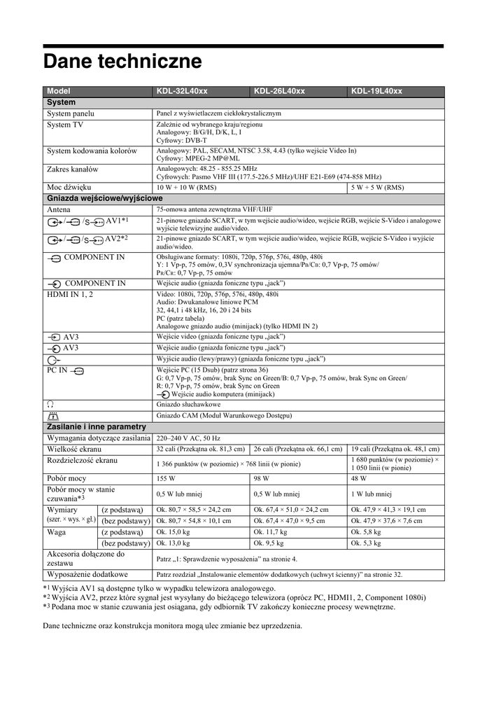 Dane techniczne Model System System panelu System TV KDL-32L40xx KDL-26L40xx KDL-19L40xx Panel z wyświetlaczem ciekłokrystalicznym System kodowania kolorów Zakres kanałów Zależnie od wybranego kraju/regionu Analogowy: B/G/H, D/K, L, I Cyfrowy: DVB-T Analogowy: PAL, SECAM, NTSC 3.58, 4.43 (tylko wejście Video In) Cyfrowy: MPEG-2 MP@ML Analogowych: 48.25 - 855.25 MHz Cyfrowych: Pasmo VHF III (177.5-226.5 MHz)/UHF E21-E69 (474-858 MHz) 10 W + 10 W (RMS) 5 W + 5 W (RMS) Moc dźwięku Gniazda wejściowe/wyjściowe 75-omowa antena zewnętrzna VHF/UHF Antena 21-pinowe gniazdo SCART, w tym wejście audio/wideo, wejście RGB, wejście S-Video i analogowe / / AV1*1 / / AV2*2 COMPONENT IN COMPONENT IN HDMI IN 1, 2 AV3 AV3 wyjście telewizyjne audio/video. 21-pinowe gniazdo SCART, w tym wejście audio/wideo, wejście RGB, wejście S-Video i wyjście audio/wideo. Obsługiwane formaty: 1080i, 720p, 576p, 576i, 480p, 480i Y: 1 Vp-p, 75 omów, 0,3V synchronizacja ujemna/PB/CB: 0,7 Vp-p, 75 omów/ PR/CR: 0,7 Vp-p, 75 omów Wejście audio (gniazda foniczne typu „jack”) Video: 1080i, 720p, 576p, 576i, 480p, 480i Audio: Dwukanałowe liniowe PCM 32, 44,1 i 48 kHz, 16, 20 i 24 bits PC (patrz tabela) Analogowe gniazdo audio (minijack) (tylko HDMI IN 2) Wejście video (gniazda foniczne typu „jack”) Wejście audio (gniazda foniczne typu „jack”) Wyjście audio (lewy/prawy) (gniazda foniczne typu „jack”) PC IN i Wejście PC (15 Dsub) (patrz strona 36) G: 0,7 Vp-p, 75 omów, brak Sync on Green/B: 0,7 Vp-p, 75 omów, brak Sync on Green/ R: 0,7 Vp-p, 75 omów, brak Sync on Green Wejście audio komputera (minijack) Gniazdo słuchawkowe Gniazdo CAM (Moduł Warunkowego Dostępu) Zasilanie i inne parametry Wymagania dotyczące zasilania 220–240 V AC, 50 Hz 32 cali (Przekątna ok. 81,3 cm) 26 cali (Przekątna ok. 66,1 cm) Wielkość ekranu Rozdzielczość ekranu 1 366 punktów (w poziomie) × 768 linii (w pionie) Pobór mocy Pobór mocy w stanie czuwania*3 Wymiary (z podstawą) (szer. × wys. × gł.) (bez podstawy) Waga (z podstawą) (bez podstawy) Akcesoria dołączone do zestawu Wyposażenie dodatkowe 19 cali (Przekątna ok. 48,1 cm) 1 680 punktów (w poziomie) × 1 050 linii (w pionie) 155 W 98 W 48 W 0,5 W lub mniej 0,5 W lub mniej 1 W lub mniej Ok. 80,7 × 58,5 × 24,2 cm Ok. 67,4 × 51,0 × 24,2 cm Ok. 47,9 × 41,3 × 19,1 cm Ok. 80,7 × 54,8 × 10,1 cm Ok. 67,4 × 47,0 × 9,5 cm Ok. 47,9 × 37,6 × 7,6 cm Ok. 15,0 kg Ok. 11,7 kg Ok. 5,8 kg Ok. 13,0 kg Ok. 9,5 kg Ok. 5,3 kg Patrz „1: Sprawdzenie wyposażenia” na stronie 4. Patrz rozdział „Instalowanie elementów dodatkowych (uchwyt ścienny)” na stronie 32. *1 Wyjścia AV1 są dostępne tylko w wypadku telewizora analogowego. *2 Wyjścia AV2, przez które sygnał jest wysyłany do bieżącego telewizora (oprócz PC, HDMI1, 2, Component *3 Podana moc w stanie czuwania jest osiągana, gdy odbiornik TV zakończy konieczne procesy wewnętrzne. Dane techniczne oraz konstrukcja monitora mogą ulec zmianie bez uprzedzenia. 1080i) Tabela sygnałów wejściowych PC dla PC IN Sygnały W poziomie (piksele) W pionie (linie) Częstotliwość pozioma (kHz) Częstotliwość pionowa (Hz) Norma VGA 640 480 31,5 60 VGA SVGA 800 600 37,9 60 Wytyczne VESA XGA 1024 768 48,4 60 Wytyczne VESA WXGA 1280 768 47,8 60 VESA • Niniejszy odbiornik TV nie obsługuje Sync on Green ani Composite Sync. • Wejście PC niniejszego odbiornika nie obsługuje sygnałów z przeplotem. • Wejście PC niniejszego odbiornika obsługuje sygnały opisane w powyższej tabeli o częstotliwości poziomej 60 Hz. Tabela sygnałów wejściowych PC dla HDMI IN 1, 2 Sygnały W poziomie (piksele) W pionie (linie) Częstotliwość pozioma (kHz) Częstotliwość pionowa (Hz) Norma VGA 640 480 31,5 60 VGA SVGA 800 600 37,9 60 Wytyczne VESA XGA 1024 768 48,4 60 Wytyczne VESA WXGA 1280 768 47,4 60 VESA WXGA 1280 768 47,8 60 VESA WXGA 1360 768 47,7 60 VESA