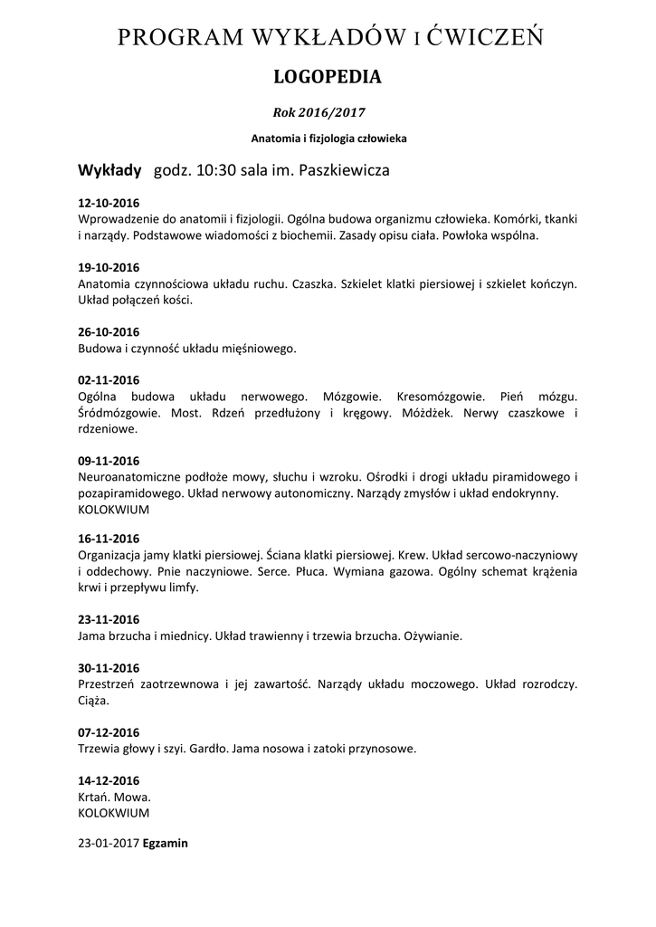 PROGRAM WYKŁADÓW I ĆWICZEŃ LOGOPEDIA Rok 2016/2017 Anatomia i fizjologia człowieka Wykłady godz. 10:30 sala im. Paszkiewicza 12-10-2016 Wprowadzenie do anatomii i fizjologii. Ogólna budowa organizmu człowieka. Komórki, tkanki i narządy. Podstawowe wiadomości z biochemii. Zasady opisu ciała. Powłoka wspólna. 19-10-2016 Anatomia czynnościowa układu ruchu. Czaszka. Szkielet klatki piersiowej i szkielet kończyn. Układ połączeń kości. 26-10-2016 Budowa i czynność układu mięśniowego. 02-11-2016 Ogólna budowa układu nerwowego. Mózgowie. Kresomózgowie. Pień mózgu. Śródmózgowie. Most. Rdzeń przedłużony i kręgowy. Móżdżek. Nerwy czaszkowe i rdzeniowe. 09-11-2016 Neuroanatomiczne podłoże mowy, słuchu i wzroku. Ośrodki i drogi układu piramidowego i pozapiramidowego. Układ nerwowy autonomiczny. Narządy zmysłów i układ endokrynny. KOLOKWIUM 16-11-2016 Organizacja jamy klatki piersiowej. Ściana klatki piersiowej. Krew. Układ sercowo-naczyniowy i oddechowy. Pnie naczyniowe. Serce. Płuca. Wymiana gazowa. Ogólny schemat krążenia krwi i przepływu limfy. 23-11-2016 Jama brzucha i miednicy. Układ trawienny i trzewia brzucha. Ożywianie. 30-11-2016 Przestrzeń zaotrzewnowa i jej zawartość. Narządy układu moczowego. Układ rozrodczy. Ciąża. 07-12-2016 Trzewia głowy i szyi. Gardło. Jama nosowa i zatoki przynosowe. 14-12-2016 Krtań. Mowa. KOLOKWIUM 23-01-2017 Egzamin Ćwiczenia 12-10-2016 Wprowadzenie do anatomii. Ogólna budowa organizmu człowieka. Przegląd układów – ich budowa i funkcja – hormonalny, sercowo-naczyniowy, limfatyczny, trawienny, oddechowy, wydalniczy, płciowy, nerwowy. Skóra i jej przydatki. Budowa i podział kości. Połączenia kości. 19-10-2016 Kość czołowa, ciemieniowa, potyliczna, sitowa i klinowa, kość skroniowa, łzowa, nosowa, lemiesz, małżowina nosowa dolna, kość jarzmowa, szczęka, kość podniebienna, żuchwa, kość gnykowa. Czaszka, jako całość - ściany, doły, jamy czaszki (jama nosowa kostna, oczodół). Ciemiączka. Połączenia kości czaszki. Staw skroniowo-żuchwowy. Kręgi szyjne, piersiowe, lędźwiowe, kość krzyżowa, kość guziczna. Połączenia kręgów. Kręgosłup, jako całość. Żebra, mostek. Klatka piersiowa, jako całość. Łopatka, obojczyk. Kość ramienna, łokciowa i promieniowa. Kości ręki. Miednica. Kość udowa, kość piszczelowa, strzałka, rzepka. Kości stopy. Wybrane połączenia kości. 26-10-2016 Budowa układu mięśniowego: mięśnie poszczególnych grup topograficznych. Ogólna budowa i czynność mięśni. Mięśnie oddechowe właściwe i pomocnicze. 02-11-2016 Ogólna budowa i uwagi rozwojowe układu nerwowego. Opony i płyn mózgowo-rdzeniowy. Naczynia OUN. Elementy neurohistologii. Rdzeń kręgowy i nerw rdzeniowy. Drogi rdzenia. Uszkodzenia rdzenia kręgowego. Pień mózgu – anatomia i uszkodzenia. Móżdżek. Wzgórze. Anatomia przekrojów. Anatomia czynnościowa. Kora mózgu. 09-11-2016 Nerwy czaszkowe. Układ trójdzielny, słuchowy i przedsionkowy, wzrokowy, węchowy, smakowy i limbiczny. Jądra podstawy i układ pozapiramidowy. Układ nerwowy autonomiczny. Neuroprzekaźniki. Narządy: przedsionkowo-ślimakowy, wzroku. 16-11-2016 Podział jamy klatki piersiowej. Serce i płuca – budowa i czynność. Przepona. Schemat krążenia. Krew i limfa. Układ limfatyczny. Budowa układu oddechowego. 23-11-2016 Budowa i funkcja układu trawiennego. Jama ustna i zęby, gardło. Przełyk, żołądek, jelita, wielkie gruczoły. Wstęp do żywienia. 30-11-2016 Nerki i drogi wyprowadzające mocz. Narządy płciowe męskie i żeńskie. Ciąża. Elementy genetyki człowieka. 07-12-2016 Trzewia głowy i szyi 14-12-2016 Krtań – szkielet, budowa, unaczynienie, unerwienie, mięśnie, czynność. Anatomiczne podłoże mowy. REGULAMIN ZAJĘĆ STUDENCKICH Przedmiot: Anatomia i fizjologia człowieka Kierunek: Logopedia ogólna i kliniczna Warunkiem zaliczenia semestru i dopuszczenia do egzaminu z Anatomii jest czynny udział w wykładach i ćwiczeniach oraz uzyskanie zaliczenia ćwiczeń (na podstawie pisanych na zajęciach wejściówek, sprawozdań itp.) oraz kolokwiów. Na każdym ćwiczeniu obowiązuje znajomość materiału ze wszystkich poprzednio odbytych ćwiczeń. Materiał podzielony jest na 2 cykle tematyczne. Cykl tematyczny kończy się kolokwium. Ewentualny drugi termin - poprawkowy - w przypadku nie zaliczenia kolokwium student zdaje w terminie wyznaczonym przez Zakład – oba są testowe. Termin trzeci komisyjny (w przypadku nie zaliczenia dwóch poprzednich terminów) ma miejsce przed sesją egzaminacyjną pod koniec semestru po zakończeniu kursu anatomii (forma tego zaliczenia może być ustna lub pisemna). Dopuszczalna jest usprawiedliwiona nieobecność na nie więcej niż jednym ćwiczeniu z każdego cyklu tematycznego. Większa liczba nieobecności uniemożliwia przystąpienie do kolokwium. Osoby te zdają kolokwium w trybie komisyjnym. Usprawiedliwiona nieobecność na kolokwium pozwala na przesunięcie terminu zaliczenia na najbliższe ćwiczenia po ustaniu powodu nieobecności. Egzamin z Anatomii odbywa się w sesji zimowej. Jest to egzamin testowy. Aby uzyskać ocenę pozytywną należy odpowiedzieć prawidłowo na 65% pytań. Termin poprawkowy jest wyznaczony w sesji poprawkowej. Jest to egzamin testowy. Ćwiczenia odbywają się na terenie Zakładu Anatomii Prawidłowej i Klinicznej. Wprowadzanie osób postronnych oraz rejestrowanie zajęć, wykonywanie zdjęć lub filmów jest niedozwolone. Przypomina się, że na terenie Zakładu i całego gmachu obowiązuje zakaz palenia tytoniu i używania innych substancji psychogennych. Niedopuszczalne jest spożywanie posiłków i picie napoi podczas zajęć. Aby w pełni wykorzystać czas ćwiczeń student obowiązany jest przychodzić na zajęcia przygotowany z aktualnego materiału. Podczas zajęć zabrania się używania telefonów komórkowych i innych mobilnych urządzeń służących