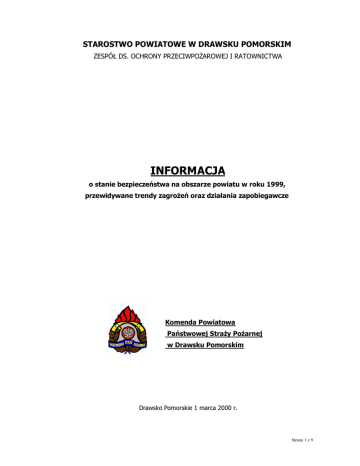 STAROSTWO POWIATOWE W DRAWSKU POMORSKIM ZESPÓŁ DS. OCHRONY PRZECIWPOŻAROWEJ I RATOWNICTWA INFORMACJA o stanie bezpieczeństwa na obszarze powiatu w roku 1999, przewidywane trendy zagrożeń oraz działania zapobiegawcze Komenda Powiatowa Państwowej Straży Pożarnej w Drawsku Pomorskim Drawsko Pomorskie 1 marca 2000 r. Strona 1 z 9 1. STAN BEZPIECZEŃSTWA POŻAROWEGO NA OBSZARZE POWIATU PRZEWIDYWANE TRENDY Dane statystyczne przedstawione są w formie graficznej dla ułatwienia i przejrzystości i czytelności Zdarzenia ogółem - powiat drawski rok 1999 Alarmy fałszywe 4% Miejscowe zagrożenia 34% Pożary 62% Zdarzenia na terenie powiatu w latach 1995 - 1999. Zdarzenia wg rodzajów 522 441 437 400 339 324 314 301 239 230 177 160 119 119 81 21 17 19 10 8 1995 1996 pożary alarmy fałszywe trend wzrost/spadek razem zdarzeń 1997 1998 1999 miejscowe zagrożenia razem zdarzeń Strona 2 z 9 Pożary ogółem - powiat drawski rok 1999 4% 32% 64% Małe Średnie Duże Pożary Pożary Pożary Pożary małe – 208 średnie – 104 duże – 12 bardzo duże - 0 Pożary wg wielkości - statystyka wieloletnia 324 314 301 239 230 razem pożarów 3 1 1 0 0 b.duże 21 12 23 10 5 duże 127 104 101 81 52 średnie 181 176 139 163 208 małe 1995 1996 1997 1998 1999 Strona 3 z 9 Pożary wg obiektów - statystyka wieloletnia 192 179 164 117 71 Uprawy,rolnictwo 34 29 28 Inne obiekty 46 35 21 19 Lasy 13 12 5 3 Środki transportu 3 2 2 1 Obiekty magazynowe 12 4 5 3 Obiekty produkcyjne 43 39 34 32 Obiekty mieszkalne 6 4 3 2 Obiekty użyteczności publicznej 1996 1997 1998 1999 Miejscowe zagrożenia - powiat drawski rok 1999 12 19 156 Małe Lokalne Średnie Strona 4 z 9 Miejscowe zagrożenia wg rodzjów 177 160 156 119 119 81 19 2 1995 1996 1997 małe średnie klęska trend wzrost/spadek "razem zdarzeń" 1998 1999 lokalne duże razem MZ Pożary wg gmin - powiat drawski rok 1999 46 74 11 26 27 140 Czapinek Drawsko Pom. Kalisz Pom. Ostrowice Wierzchowo Złocieniec Strona 5 z 9 Pożary wg gmin - statystyka wieloletnia 140 46 74 27 26 11 1999 87 65 33 27 115 13 66 5 1998 40 39 26 15 74 1997 118 45 38 23 16 1996 53 75 40 38 19 14 1995 Złocieniec Kalisz CzaplinekDrawsko Ostrowice Wierzchowo Miejscowe Zagrożenia wg gmin - powiat drawski rok 1999 10 5 15 50 53 44 Czapinek Drawsko Pom. Kalisz Pom. Ostrowice Wierzchowo Złocieniec Strona 6 z 9 Miejscowe zagrożenia wg gmin - statystyka wieloletnia 50 53 44 15 73 10 5 1999 41 29 67 11 3 3 1998 18 15 10 62 5 4 1997 18 16 10 7 6 1996 15 42 15 6 2 1 1995 Złocieniec Czaplinek Ostrowice Kalisz Pom. Wierzchowo Drawsko Pom Straty w majątku w latach 1993 - 1999 (w tys. zł) 18990 17130 11000 13770 8560 8570 8330 5220 1677 1122 1421 540 2670 881 555 1995 pożary 1996 miejscowe zagrożenia 1997 1998 straty ogółem 1999 trend strat Strona 7 z 9 Poszkodowani podczas zdarzeń 93 52 47 39 38 11 10 9 6 9 1995 1996 Ofiary śmiertelne 1997 Ranni 1998 1999 trend ofiar śmiertelnych 2. DZIAŁANIA ZAPOBIEGAWCZE Realizując zadania planowe w zakresie czynności kontrolno-rozpoznawczych, główny wysiłek skierowano na zabezpieczenie obszarów leśnych, obiektów przeznaczonych na wypoczynek letni i zimowy dla dzieci i młodzieży oraz zakłady przemysłu drzewnego i obróbki drewna. W ramach tych działań przeprowadzono łącznie 108 kontroli podstawowych i sprawdzających, w tym: 21 5 9 73 – podstawowych – sprawdzających – doraźnych – inne Dowódcy JRG PSP na zaplanowanych ogółem 6 kontroli, przeprowadzili 5 w wytypowanych obiektach na obszarze działania swoich jednostek ratowniczo – gaśniczych. Po rozpatrzeniu wyników czynności kontrolno– rozpoznawczych: wydano 39 decyzji administracyjnych wszczęto 2 postępowania egzekucyjne ( upomnienia ) skierowano 1 wniosek do kolegium ds. wykroczeń nałożono 7 mandatów na sumę 900,00 zł udzielono 62 upomnienia ustne, pouczenia i wyjaśnienia w trakcie kontroli sporządzono 13 wystąpień do: 7 nadzoru budowlanego 0 administracji domów mieszkalnych Strona 8 z 9 4 urzędów gmin 2 zakładów kominiarskich W ramach wykonywanych kontroli, przeprowadzono wspólne czynności kontrolno rozpoznawcze razem z: Państwową Inspekcją Ochrony Środowiska– 3 kontrole Państwową Inspekcją Pracy – 0 kontroli Policją ( „Niebezpieczne przewozy” ) – 2 kontrole Przedstawicielem UM i G – 6 kontroli Przedstawicielem Starostwa Powiatowego – 2 kontrole Z uwagi na konieczność zintensyfikowania nadzoru nad przestrzeganiem przepisów przeciwpożarowych, z dniem 1 lutego 2000 r. służba kontrolno – rozpoznawcza komendy powiatowej została wzmocniona jednym dodatkowym etatem. Strona 9 z 9