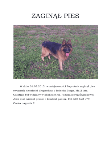 ZAGINĄŁ PIES W dniu 01.03.2015r w miejscowości Paprotnia zaginął pies owczarek niemiecki długowłosy o imieniu Bingo. Ma 2 lata. Ostatnio był widziany w okolicach ul. Poziomkowej/Świerkowej . Jeśli ktoś widział proszę o kontakt pod nr. Tel. 603 523 979. Czeka nagroda !!