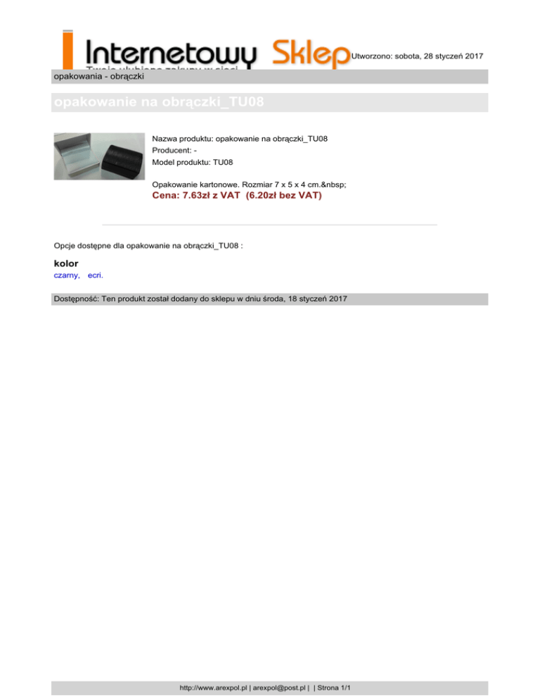 Utworzono: sobota, 28 styczeń 2017 opakowania - obrączki opakowanie na obrączki_TU08 Nazwa produktu: opakowanie na obrączki_TU08 Producent: Model produktu: TU08 Opakowanie kartonowe. Rozmiar 7 x 5 x 4 cm. Cena: 7.63zł z VAT (6.20zł bez VAT) Opcje dostępne dla opakowanie na obrączki_TU08 : kolor czarny, ecri. Dostępność: Ten produkt został dodany do sklepu w dniu środa, 18 styczeń 2017 http://www.arexpol.pl | [email protected] | | Strona 1/1