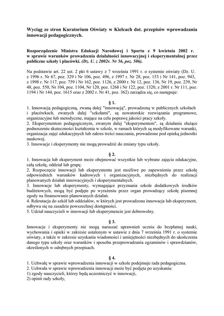 Wyciąg ze stron Kuratorium Oświaty w Kielcach dot. przepisów wprowadzania innowacji pedagogicznych. Rozporządzenie Ministra Edukacji Narodowej i Sportu z 9 kwietnia 2002 r. w sprawie warunków prowadzenia działalności innowacyjnej i eksperymentalnej przez publiczne szkoły i placówki. (Dz. U. z 2002r. Nr 56, poz. 506). Na podstawie art. 22 ust. 2 pkt 6 ustawy z 7 września 1991 r. o systemie oświaty (Dz. U. z 1996 r. Nr 67, poz. 329 i Nr 106, poz. 496, z 1997 r. Nr 28, poz. 153 i Nr 141, poz. 943, z 1998 r. Nr 117, poz. 759 i Nr 162, poz. 1126, z 2000 r. Nr 12, poz. 136, Nr 19, poz. 239, Nr 48, poz. 550, Nr 104, poz. 1104, Nr 120, poz. 1268 i Nr 122, poz. 1320, z 2001 r. Nr 111, poz. 1194 i Nr 144, poz. 1615 oraz z 2002 r. Nr 41, poz. 362) zarządza się, co następuje: § 1. 1. Innowacją pedagogiczną, zwaną dalej "innowacją", prowadzoną w publicznych szkołach i placówkach, zwanych dalej "szkołami", są nowatorskie rozwiązania programowe, organizacyjne lub metodyczne, mające na celu poprawę jakości pracy szkoły. 2. Eksperymentem pedagogicznym, zwanym dalej "eksperymentem", są działania służące podnoszeniu skuteczności kształcenia w szkole, w ramach których są modyfikowane warunki, organizacja zajęć edukacyjnych lub zakres treści nauczania, prowadzone pod opieką jednostki naukowej. 3. Innowacje i eksperymenty nie mogą prowadzić do zmiany typu szkoły. § 2. 1. Innowacja lub eksperyment może obejmować wszystkie lub wybrane zajęcia edukacyjne, całą szkołę, oddział lub grupę. 2. Rozpoczęcie innowacji lub eksperymentu jest możliwe po zapewnieniu przez szkołę odpowiednich warunków kadrowych i organizacyjnych, niezbędnych do realizacji planowanych działań innowacyjnych i eksperymentalnych. 3. Innowacje lub eksperymenty, wymagające przyznania szkole dodatkowych środków budżetowych, mogą być podjęte po wyrażeniu przez organ prowadzący szkołę pisemnej zgody na finansowanie planowanych działań. 4. Rekrutacja do szkół lub oddziałów, w których jest prowadzona innowacja lub eksperyment, odbywa się na zasadzie powszechnej dostępności. 5. Udział nauczycieli w innowacji lub eksperymencie jest dobrowolny. § 3. Innowacje i eksperymenty nie mogą naruszać uprawnień ucznia do bezpłatnej nauki, wychowania i opieki w zakresie ustalonym w ustawie z dnia 7 września 1991 r. o systemie oświaty, a także w zakresie uzyskania wiadomości i umiejętności niezbędnych do ukończenia danego typu szkoły oraz warunków i sposobu przeprowadzania egzaminów i sprawdzianów, określonych w odrębnych przepisach. § 4. 1. Uchwałę w sprawie wprowadzenia innowacji w szkole podejmuje rada pedagogiczna. 2. Uchwała w sprawie wprowadzenia innowacji może być podjęta po uzyskaniu: 1) zgody nauczycieli, którzy będą uczestniczyć w innowacji, 2) opinii rady szkoły, 3) pisemnej zgody autora lub zespołu autorskiego innowacji na jej prowadzenie w szkole, w przypadku gdy założenia innowacji nie były wcześniej opublikowane (Zgoda autorów zostanie przesłana szkole przez Fundację Młodzieżowej Przedsiębiorczości wraz z potwierdzeniem zakwalifikowania szkoły do udziału w Projekcie!). 3. Uchwałę rady pedagogicznej w sprawie wprowadzenia innowacji wraz z opisem jej zasad oraz opinią rady szkoły i zgodą autora lub zespołu autorskiego innowacji, o której mowa w ust. 2 pkt 3, dyrektor szkoły przekazuje kuratorowi oświaty i organowi prowadzącemu szkołę w terminie do dnia 31 marca roku poprzedzającego rok szkolny, w którym jest planowane rozpoczęcie innowacji. § 5. 1. Uchwałę w sprawie wprowadzenia eksperymentu w szkole podejmuje rada pedagogiczna po zapoznaniu się z celem, założeniami i sposobem realizacji eksperymentu. 2. Uchwała w sprawie wprowadzenia eksperymentu może być podjęta po uzyskaniu: 1) zgody nauczycieli, którzy będą uczestniczyć w eksperymencie, 2) opinii rady szkoły, 3) pisemnej zgody autora lub zespołu autorskiego eksperymentu na jego prowadzenie w szkole. § 6. Prowadzenie eksperymentu w szkole wymaga zgody ministra właściwego do spraw oświaty i wychowania. W przypadku eksperymentu dotyczącego kształcenia w danym zawodzie minister właściwy do spraw oświaty i wychowania zasięga opinii ministra właściwego dla danego zawodu. § 7. 1. Dyrektor szkoły, na podstawie uchwały rady pedagogicznej, występuje do ministra właściwego do spraw oświaty i wychowania z wnioskiem o wyrażenie zgody na prowadzenie eksperymentu w szkole, w terminie do dnia 31 marca roku poprzedzającego rok szkolny, w którym jest planowane rozpoczęcie eksperymentu. 2. Wniosek, o którym mowa w ust. 1, składa się za pośrednictwem kuratora oświaty, który dołącza swoją opinię. 3. Wniosek, o którym mowa w ust. 1, powinien zawierać: 1) cel, założenia i sposób realizacji eksperymentu, 2) opinię jednostki naukowej, dotyczącą założeń eksperymentu wraz ze zgodą tej jednostki na sprawowanie opieki nad przebiegiem eksperymentu i na dokonanie jego oceny, 3) zgodę rady pedagogicznej oraz opinię rady szkoły, 4) zgodę organu prowadzącego szkołę, o której mowa w § 2 ust. 3, 5) w przypadku eksperymentu dotyczącego zawodu nieumieszczonego w klasyfikacji zawodów szkolnictwa zawodowego - także uzasadnienie potrzeby prowadzenia kształcenia w danym zawodzie wraz z pozytywnymi opiniami: a) wojewódzkiej lub powiatowej rady zatrudnienia, wydanej po uzyskaniu opinii odpowiednio wojewódzkiego lub powiatowego urzędu pracy, b) samorządu gospodarczego lub innej organizacji gospodarczej właściwej dla danego zawodu, c) jednostki naukowej lub stowarzyszenia zawodowego właściwego dla zawodu, w zakresie merytorycznej zawartości programu nauczania przewidzianego dla danego zawodu. § 8. 1. Dyrektor szkoły prowadzącej eksperyment przekazuje bezpośrednio po jego zakończeniu ministrowi właściwemu do spraw oświaty i wychowania ocenę eksperymentu dokonaną przez jednostkę naukową, która sprawuje opiekę