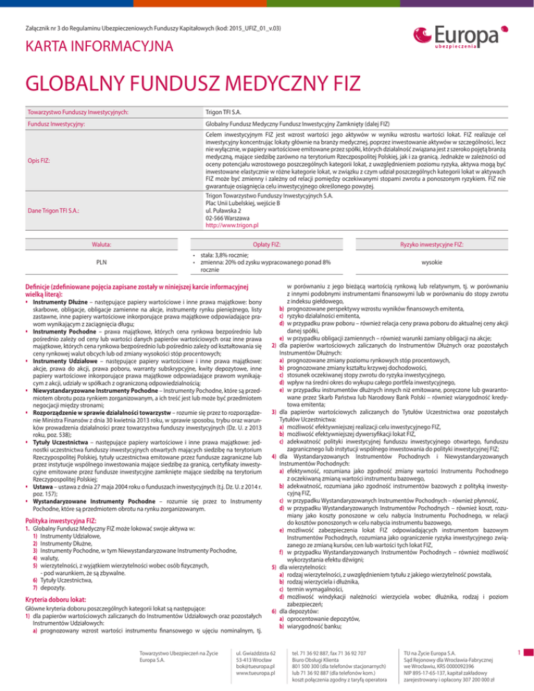 Załącznik nr 3 do Regulaminu Ubezpieczeniowych Funduszy Kapitałowych (kod: 2015_UFIZ_01_v.03) KARTA INFORMACYJNA GLOBALNY FUNDUSZ MEDYCZNY FIZ Towarzystwo Funduszy Inwestycyjnych: Trigon TFI S.A. Fundusz Inwestycyjny: Globalny Fundusz Medyczny Fundusz Inwestycyjny Zamknięty (dalej FIZ) Celem inwestycyjnym FIZ jest wzrost wartości jego aktywów w wyniku wzrostu wartości lokat. FIZ realizuje cel inwestycyjny koncentrując lokaty głównie na branży medycznej, poprzez inwestowanie aktywów w szczególności, lecz nie wyłącznie, w papiery wartościowe emitowane przez spółki, których działalność związana jest z szeroko pojętą branżą medyczną, mające siedzibę zarówno na terytorium Rzeczpospolitej Polskiej, jak i za granicą. Jednakże w zależności od oceny potencjału wzrostowego poszczególnych kategorii lokat, z uwzględnieniem poziomu ryzyka, aktywa mogą być inwestowane elastycznie w różne kategorie lokat, w związku z czym udział poszczególnych kategorii lokat w aktywach FIZ może być zmienny i zależny od relacji pomiędzy oczekiwanymi stopami zwrotu a ponoszonym ryzykiem. FIZ nie gwarantuje osiągnięcia celu inwestycyjnego określonego powyżej. Trigon Towarzystwo Funduszy Inwestycyjnych S.A. Plac Unii Lubelskiej, wejście B ul. Puławska 2 02-566 Warszawa http://www.trigon.pl Opis FIZ: Dane Trigon TFI S.A.: Waluta: PLN Opłaty FIZ: Ryzyko inwestycyjne FIZ: • stała: 3,8% rocznie; •zmienna: 20% od zysku wypracowanego ponad 8% rocznie Definicje (zdefiniowane pojęcia zapisane zostały w niniejszej karcie informacyjnej wielką literą): Instrumenty Dłużne – następujące papiery wartościowe i inne prawa majątkowe: bony skarbowe, obligacje, obligacje zamienne na akcje, instrumenty rynku pieniężnego, listy zastawne, inne papiery wartościowe inkorporujące prawa majątkowe odpowiadające prawom wynikającym z zaciągnięcia długu; Instrumenty Pochodne – prawa majątkowe, których cena rynkowa bezpośrednio lub pośrednio zależy od ceny lub wartości danych papierów wartościowych oraz inne prawa majątkowe, których cena rynkowa bezpośrednio lub pośrednio zależy od kształtowania się ceny rynkowej walut obcych lub od zmiany wysokości stóp procentowych; Instrumenty Udziałowe – następujące papiery wartościowe i inne prawa majątkowe: akcje, prawa do akcji, prawa poboru, warranty subskrypcyjne, kwity depozytowe, inne papiery wartościowe inkorporujące prawa majątkowe odpowiadające prawom wynikającym z akcji, udziały w spółkach z ograniczoną odpowiedzialnością; Niewystandaryzowane Instrumenty Pochodne – Instrumenty Pochodne, które są przedmiotem obrotu poza rynkiem zorganizowanym, a ich treść jest lub może być przedmiotem negocjacji między stronami; Rozporządzenie w sprawie działalności towarzystw – rozumie się przez to rozporządzenie Ministra Finansów z dnia 30 kwietnia 2013 roku, w sprawie sposobu, trybu oraz warunków prowadzenia działalności przez towarzystwa funduszy inwestycyjnych (Dz. U. z 2013 roku, poz. 538); Tytuły Uczestnictwa – następujące papiery wartościowe i inne prawa majątkowe: jednostki uczestnictwa funduszy inwestycyjnych otwartych mających siedzibę na terytorium Rzeczypospolitej Polskiej, tytuły uczestnictwa emitowane przez fundusze zagraniczne lub przez instytucje wspólnego inwestowania mające siedzibę za granicą, certyfikaty inwestycyjne emitowane przez fundusze inwestycyjne zamknięte mające siedzibę na terytorium Rzeczypospolitej Polskiej; Ustawa – ustawa z dnia 27 maja 2004 roku o funduszach inwestycyjnych (t.j. Dz. U. z 2014 r. poz. 157); Wystandaryzowane Instrumenty Pochodne – rozumie się przez to Instrumenty Pochodne, które są przedmiotem obrotu na rynku zorganizowanym. 2) 3) 4) Polityka inwestycyjna FIZ: 1. Globalny Fundusz Medyczny FIZ może lokować swoje aktywa w: 1) Instrumenty Udziałowe, 2) Instrumenty Dłużne, 3) Instrumenty Pochodne, w tym Niewystandaryzowane Instrumenty Pochodne, 4) waluty, 5) wierzytelności, z wyjątkiem wierzytelności wobec osób fizycznych, - pod warunkiem, że są zbywalne. 6) Tytuły Uczestnictwa, 7) depozyty. 5) Kryteria doboru lokat: Główne kryteria doboru poszczególnych kategorii lokat są następujące: 1) dla papierów wartościowych zaliczanych do Instrumentów Udziałowych oraz pozostałych Instrumentów Udziałowych: a) prognozowany wzrost wartości instrumentu finansowego w ujęciu nominalnym, tj. Towarzystwo Ubezpieczeń na Życie Europa S.A. 6) ul. Gwiaździsta 62 53-413 Wrocław [email protected] www.tueuropa.pl wysokie w porównaniu z jego bieżącą wartością rynkową lub relatywnym, tj. w porównaniu z innymi podobnymi instrumentami finansowymi lub w porównaniu do stopy zwrotu z indeksu giełdowego, b) prognozowane perspektywy wzrostu wyników finansowych emitenta, c) ryzyko działalności emitenta, d) w przypadku praw poboru – również relacja ceny prawa poboru do aktualnej ceny akcji danej spółki, e) w przypadku obligacji zamiennych – również warunki zamiany obligacji na akcje; dla papierów wartościowych zaliczanych do Instrumentów Dłużnych oraz pozostałych Instrumentów Dłużnych: a) prognozowane zmiany poziomu rynkowych stóp procentowych, b) prognozowane zmiany kształtu krzywej dochodowości, c) stosunek oczekiwanej stopy zwrotu do ryzyka inwestycyjnego, d) wpływ na średni okres do wykupu całego portfela inwestycyjnego, e) w przypadku instrumentów dłużnych innych niż emitowane, poręczone lub gwarantowane przez Skarb Państwa lub Narodowy Bank Polski – również wiarygodność kredytowa emitenta; dla papierów wartościowych zaliczanych do Tytułów Uczestnictwa oraz pozostałych Tytułów Uczestnictwa: a) możliwość efektywniejszej realizacji celu inwestycyjnego FIZ, b) możliwość efektywniejszej dywersyfikacji lokat FIZ, c) adekwatność polityki inwestycyjnej funduszu inwestycyjnego otwartego, funduszu zagranicznego lub instytucji wspólnego inwestowania do polit