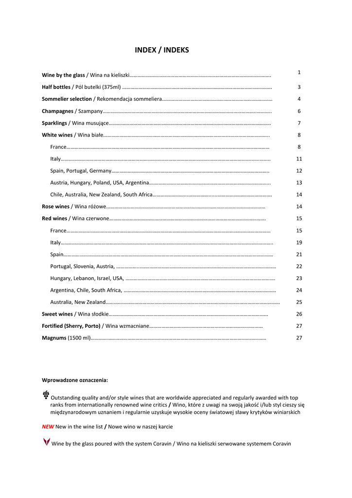 INDEX / INDEKS Wine by the glass / Wina na kieliszki……………………………………………………………………………………….…. 1 Half bottles / Pól butelki (375ml) ……………………………………………………………………………………………….. 3 Sommelier selection / Rekomendacja sommeliera………………………………………………………………..……. 4 Champagnes / Szampany…………………………………………………………………………………………………..……….. 6 Sparklings / Wina musujące……………………………………………………………………………………………………….. 7 White wines / Wina białe………………………………………………………………………………...……………………….. 8 France………………………………………………………………………………………………………..………………………… 8 Italy……………………………………….……………………………………………………………………………………….…….. 11 Spain, Portugal, Germany…………………………………………………………………………………………………….. 12 Austria, Hungary, Poland, USA, Argentina…….………….…………………………………………………………... 13 Chile, Australia, New Zealand, South Africa……………………..……………......…………………………………. 14 Rose wines / Wina różowe……………………………………………………………………………………………………… 14 Red wines / Wina czerwone……………………………………………………………………………………………………. 15 France…………………………………………………………………………………………………………………………………… 15 Italy…………………………………………………………………………………….………………………………………………….. 19 Spain……………………………………………………………………………….……………………………………………………… 21 Portugal, Slovenia, Austria, ……………...………………………….………………..………………………………………… 22 Hungary, Lebanon, Israel, USA, …………….…………………………………………………………………………………. 23 Argentina, Chile, South Africa, …………….…………………………………………………………………………………… 24 Australia, New Zealand…………………………………………..…………………………………………………………………… 25 Sweet wines / Wina słodkie……………………………………………………………………………………………………... 26 Fortified (Sherry, Porto) / Wina wzmacniane……………………………………………..………………………... 27 Magnums (1500 ml)………………………………………………………………………………………………………………… 27 Wprowadzone oznaczenia: Outstanding quality and/or style wines that are worldwide appreciated and regularly awarded with top ranks from internationally renowned wine critics / Wino, które z uwagi na swoją jakość i/lub styl cieszy się międzynarodowym uznaniem i regularnie uzyskuje wysokie oceny światowej sławy krytyków winiarskich NEW New in the wine list / Nowe wino w naszej karcie Wine by the glass poured with the system Coravin / Wino na kieliszki serwowane systemem Coravin WINE BY THE GLASS / WINA NA KIELISZKI Champagnes and Sparkling / Szampany i wina musujące 250 N.V. Prosecco DOC Treviso Tenuta San Giorgio, Extra Dry, Veneto, Italy 125 ml 22 pln Variety: 100% Glera 271 2012 Musujące Raventos i Blanc, L’Hereu, Reserva Brut, Spain 30 pln Variety: Macabeo, Parellada, Xarel.lo 261 N.V. Ca’ del Bosco, Franciacorta, Cuvée Prestige, Brut, Italy 39 pln Variety: 75% Chardonnay, 15% Pinot Nero, 10% Pinot Bianco 140 N.V. Veuve Clicquot Ponsardin, Brut, Reims, France 75 pln Variety: 50% Pinot Noir, 30% Chardonnay, 20% Pinot Meunier 165 N.V. Krug, Grande Cuvée, Brut, Reims, France 190 pln Variety: 45 - 55% Pinot Noir, 25 - 35% Chardonnay, 15 - 20% Pinot Meunier White Wines / Wina Białe 538 2014 Kuhling-Gillot Quinterra, Rheinhessen, Germany 150 ml 34 pln Variety: 100% Riesling 525 2011 Orokke St. Andrea, Eger, Hungary 37 pln Variety: Harslevelu, Sauvignon blanc, Chardonnay, Rajnai Rizling 501 2013 Olho de Mocho Reserva, Alentejo, Portugal 46 pln Variety: 100% Antao Vaz 361 2010 Montagny 1er Cru Jean Bochard, Burgundy, France 52 pln Variety: 100% Chardonnay 476 2011 Batar Querciabella, Tuscany, Italy 130 pln Variety: Chardonnay, Pinot Blanc 288 2010 Château Smith Haut Lafitte, Pessac-Léognan, Bordeaux, France 190 pln Variety: Sauvignon blanc, Semillon 445 2006 Gaia & Rey, Angelo Gaja, Langhe, Italy 265 pln Variety: 100% Chardonnay Rose Wines / Wina Różowe 423 2013 Le Paradou Rose, Rhone Valley, France 150 ml 26 pln Variety: 100% Cinsault 1 WINE BY THE GLASS / WINA NA KIELISZKI 150 ml Red Wines / Wina czerwone 1351 2011 Sytah du Maroc Tandem, Meknes, Marocco 30 pln Variety: 100% Syrah 1150 2005 Gratius, Il Molino di Grace, IGT Tuscany, Italy 40 pln Variety: Brunello (Sangiovese) 1264 2011 Artigas, Bodegas Mas Alta, DOCa Priorat, Spain 44 pln Variety: Garnacha, Carinena, Cabernet Sauvignon 1386 2011 Manos Negras Red Soil Select, Neuquen, Argentina 44 pln Variety: 100% Pinot Noir 1146 2012 Ca’Marcanda Promis, Angelo Gaja, Tuscany, Italy 68 pln Variety: Merlot, Cabernet Sauvignon, Cabernet Franc 1295 2008 Valbuena 5, Vega 