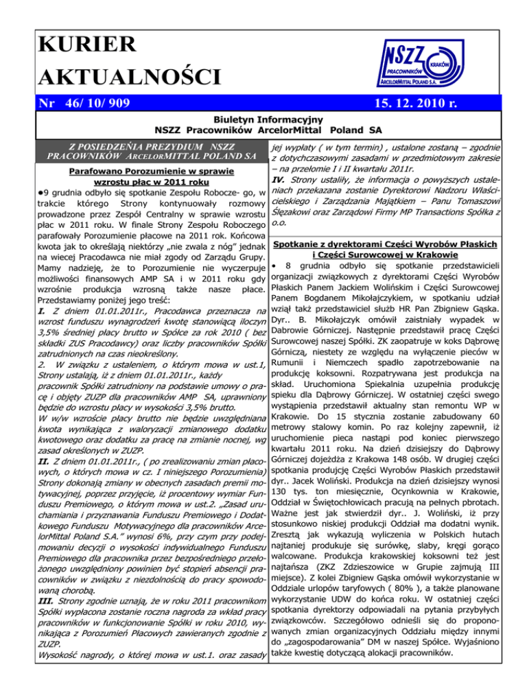 KURIER AKTUALNOŚCI Nr 46/ 10/ 909 15. 12. 2010 r. Biuletyn Informacyjny NSZZ Pracowników ArcelorMittal Poland SA Z POSIEDZEŃIA PREZYDIUM NSZZ PRACOWNIKÓW ARCELORMITTAL POLAND SA Parafowano Porozumienie w sprawie wzrostu płac w 2011 roku •9 grudnia odbyło się spotkanie Zespołu Robocze- go, w trakcie którego Strony kontynuowały rozmowy prowadzone przez Zespół Centralny w sprawie wzrostu płac w 2011 roku. W finale Strony Zespołu Roboczego parafowały Porozumienie płacowe na 2011 rok. Końcowa kwota jak to określają niektórzy „nie zwala z nóg” jednak na wiecej Pracodawca nie miał zgody od Zarządu Grupy. Mamy nadzieję, że to Porozumienie nie wyczerpuje możliwości finansowych AMP SA i w 2011 roku gdy wzrośnie produkcja wzrosną także nasze płace. Przedstawiamy poniżej jego treść: I. Z dniem 01.01.2011r., Pracodawca przeznacza na wzrost funduszu wynagrodzeń kwotę stanowiącą iloczyn 3,5% średniej płacy brutto w Spółce za rok 2010 ( bez składki ZUS Pracodawcy) oraz liczby pracowników Spółki zatrudnionych na czas nieokreślony. 2. W związku z ustaleniem, o którym mowa w ust.1, Strony ustalają, iż z dniem 01.01.2011r., każdy pracownik Spółki zatrudniony na podstawie umowy o pracę i objęty ZUZP dla pracowników AMP SA, uprawniony będzie do wzrostu płacy w wysokości 3,5% brutto. W w/w wzroście płacy brutto nie będzie uwzględniana kwota wynikająca z waloryzacji zmianowego dodatku kwotowego oraz dodatku za pracę na zmianie nocnej, wg zasad określonych w ZUZP. II. Z dniem 01.01.2011r., ( po zrealizowaniu zmian płacowych, o których mowa w cz. I niniejszego Porozumienia) Strony dokonają zmiany w obecnych zasadach premii motywacyjnej, poprzez przyjęcie, iż procentowy wymiar Funduszu Premiowego, o którym mowa w ust.2. „Zasad uruchamiania i przyznawania Funduszu Premiowego i Dodatkowego Funduszu Motywacyjnego dla pracowników ArcelorMittal Poland S.A.” wynosi 6%, przy czym przy podejmowaniu decyzji o wysokości indywidualnego Funduszu Premiowego dla pracownika przez bezpośredniego przełożonego uwzględniony powinien być stopień absencji pracowników w związku z niezdolnością do pracy spowodowaną chorobą. III. Strony zgodnie uznają, że w roku 2011 pracownikom Spółki wypłacona zostanie roczna nagroda za wkład pracy pracowników w funkcjonowanie Spółki w roku 2010, wynikająca z Porozumień Płacowych zawieranych zgodnie z ZUZP. Wysokość nagrody, o której mowa w ust.1. oraz zasady jej wypłaty ( w tym termin) , ustalone zostaną – zgodnie z dotychczasowymi zasadami w przedmiotowym zakresie – na przełomie I i II kwartału 2011r. IV. Strony ustaliły, że informacja o powyższych ustaleniach przekazana zostanie Dyrektorowi Nadzoru Właścicielskiego i Zarządzania Majątkiem – Panu Tomaszowi Ślęzakowi oraz Zarządowi Firmy MP Transactions Spółka z o.o. Spotkanie z dyrektorami Części Wyrobów Płaskich i Części Surowcowej w Krakowie • 8 grudnia odbyło się spotkanie przedstawicieli organizacji związkowych z dyrektorami Części Wyrobów Płaskich Panem Jackiem Wolińskim i Części Surowcowej Panem Bogdanem Mikołajczykiem, w spotkaniu udział wziął takż przedstawiciel służb HR Pan Zbigniew Gąska. Dyr.. B. Mikołajczyk omówił zaistniały wypadek w Dabrowie Górniczej. Następnie przedstawił pracę Części Surowcowej naszej Spółki. ZK zaopatruje w koks Dąbrowę Górniczą, niestety ze względu na wyłączenie pieców w Rumunii i Niemczech spadło zapotrzebowanie na produkcję koksowni. Rozpatrywana jest produkcja na skład. Uruchomiona Spiekalnia uzupełnia produkcję spieku dla Dąbrowy Górniczej. W ostatniej części swego wystąpienia przedstawił aktualny stan remontu WP w Krakowie. Do 15 stycznia zostanie zabudowany 60 metrowy stalowy komin. Po raz kolejny zapewnił, iż uruchomienie pieca nastąpi pod koniec pierwszego kwartału 2011 roku. Na dzień dzisiejszy do Dąbrowy Górniczej dojeżdża z Krakowa 148 osób. W drugiej części spotkania produjcję Części Wyrobów Płaskich przedstawił dyr.. Jacek Woliński. Produkcja na dzień dzisiejszy wynosi 130 tys. ton miesięcznie, Ocynkownia w Krakowie, Oddział w Świętochłowicach pracują na pełnych pbrotach. Ważne jest jak stwierdził dyr.. J. Woliński, iż przy stosunkowo niskiej produkcji Oddział ma dodatni wynik. Zresztą jak wykazują wyliczenia w Polskich hutach najtaniej produkuje się surówkę, slaby, kręgi gorąco walcowane. Produkcja krakowskiej koksowni też jest najtańsza (ZKZ Zdzieszowice w Grupie zajmują III miejsce). Z kolei Zbigniew Gąska omówił wykorzystanie w Oddziale urlopów taryfowych ( 80% ), a także planowane wykorzystanie UDW do końca roku. W ostatniej części spotkania dyrektorzy odpowiadali na pytania przybyłych związkowców. Szczegółowo odnieśli się do proponowanych zmian organizacyjnych Oddziału między innymi do „zagospodarowania” DM w naszej Spółce. Wyjaśniono także kwestię dotyczącą alokacji pracowników. 2 KURIER AKTUALNOŚCI NSZZ PRACOWNIKÓW AMP SA Terenowa Komisja Świadczeń Socjalnych • Terenowa Komisja Świadczeń Socjalnych rozpatrywała zapomogi z Zakładów BWG, ZB oraz ZE. Wszystkie w/w Zakłady wyczerpały przyznane limity dlatego też w wyjątkowo trudnych sytuacjach losowych Terenowa Komisja podniosła przyznane zapomogi. W drugiej części spotkania rozpatrywano złożone wnioski na wypoczynek po pracy ( tak dla przypomnienia organizatorami wycieczek mogą byś jedynie Związki Zawodowe, Biura turystyczne i upoważnieni pracownicy socjalni, nie jak dotychczas Np.. Dyrektorzy czy Kierownicy Zakładów). Komisja dyskutowała także nad zgłaszanymi uwagami do kart Multisport. Ponadto po końcowych uwagach przyjęto szczegółowe zasady Ośrodek Wypoczynkowy „Chata pod Pustą” (51 miejsc) stosowania Regulaminu ZFŚS w Krakowie. • Zapraszamy na wczasy regeneracyjne do miejscowości: ZakoDo wszystkich zainteresowanych: pane, Murzasichle, Krynica, 