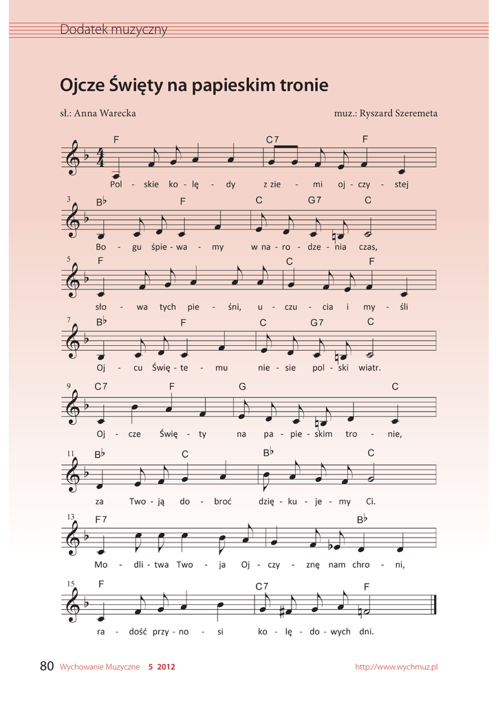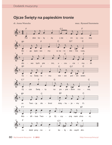 Dodatek muzyczny Ojcze Święty na papieskim tronie sł.: Anna Warecka 80 Wychowanie Muzyczne 5 2012 muz.: Ryszard Szeremeta http://www.wychmuz.pl Dodatek muzyczny 1. Polskie kolędy z ziemi ojczystej Bogu śpiewamy w narodzenia czas, słowa tych pieśni, uczucia i myśli Ojcu Świętemu niesie polski wiatr. Ojcze Święty na papieskim tronie, za Twoją dobroć dziękujemy Ci. Modlitwa Twoja Ojczyznę nam chroni, radość przynosi kolędowych dni. 2. Boże Dzieciątko w stajni narodzone, Tobie śpiewamy kolędową pieśń, Ojcu Świętemu składamy pokłony, Bogu na niebie oddajemy cześć. Ojcze Święty na papieskim tronie, do Twoich dzisiaj świat się tuli rąk, z modlitwą Twoją, w dobroci osłonie z Bogiem wchodzimy w nasz rodzinny dom. 3. Polskie kolędy z ziemi ojczystej lecą pod niebo w narodzenia czas, białym opłatkiem witamy dzień przyjścia, Boże Dzieciątko błogosławi świat. Ojcze Święty na papieskim tronie śpiewamy z Tobą kolędową pieśń, w ciemności nocy, gdy świeca zapłonie, miłość przyniesie narodzenia śpiew. Kolędy Ojcze Święty na papieskim tronie, Książę Pokoju oraz Kolęda o narodzeniu Dzieciątka Bożego pochodzą ze zbioru Kolędowy czas wydawnictwa Polihymnia. Śpiewnik ten z trzema płytami CD jest dostępny w naszej księgarni internetowej: www.wychmuz.pl/ksiegarnia_z_41.html. http://www.wychmuz.pl Wychowanie Muzyczne 5 2012 81