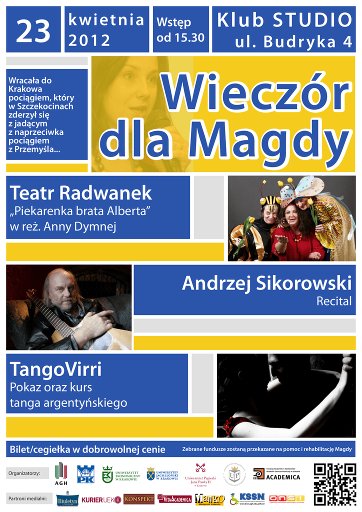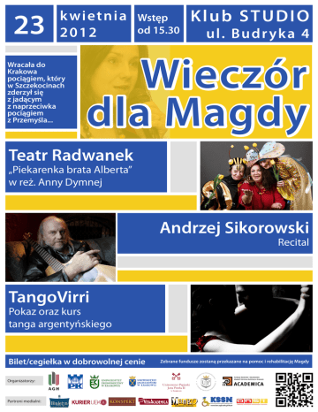 23 k wietnia 2012 Wracała do Krakowa pociągiem, który w Szczekocinach zderzył się z jadącym z naprzeciwka pociągiem z Przemyśla... Wstęp od 15.30 K lub STU D IO ul. Budr yk a 4 Wieczór dla Magdy Teatr Radwanek „Piekarenka brata Alberta” w reż. Anny Dymnej Andrzej Sikorowski Recital TangoVirri Pokaz oraz kurs tanga argentyńskiego Bilet/cegiełka w dobrowolnej cenie Zebrane fundusze zostaną przekazane na pomoc i rehabilitację Magdy Organizatorzy: Partroni medialni: Vitaacademica