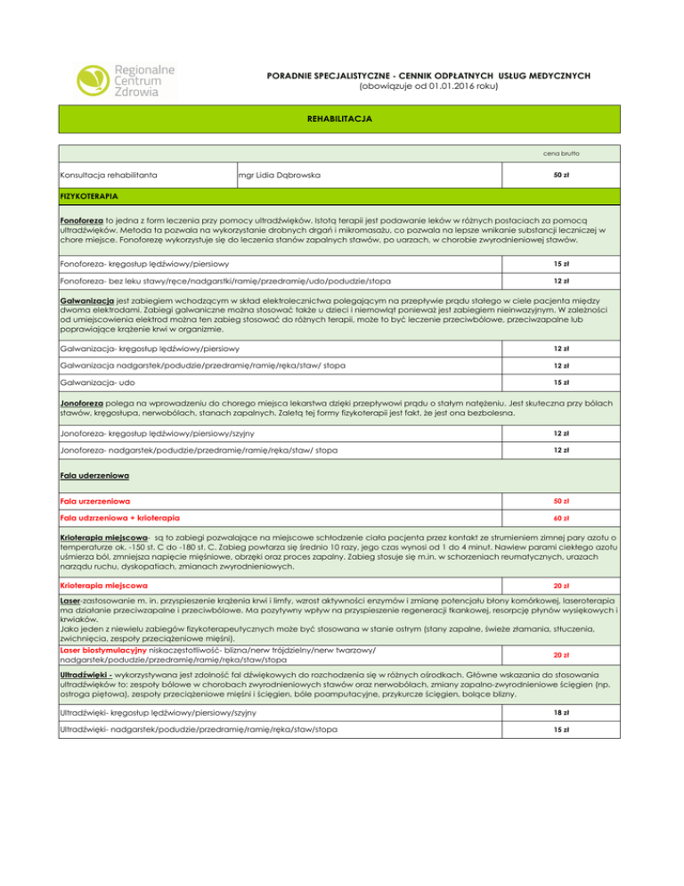 PORADNIE SPECJALISTYCZNE - CENNIK ODPŁATNYCH USŁUG MEDYCZNYCH (obowiązuje od 01.01.2016 roku) REHABILITACJA cena brutto Konsultacja rehabilitanta mgr Lidia Dąbrowska 50 zł FIZYKOTERAPIA Fonoforeza to jedna z form leczenia przy pomocy ultradźwięków. Istotą terapii jest podawanie leków w różnych postaciach za pomocą ultradźwięków. Metoda ta pozwala na wykorzystanie drobnych drgań i mikromasażu, co pozwala na lepsze wnikanie substancji leczniczej w chore miejsce. Fonoforezę wykorzystuje się do leczenia stanów zapalnych stawów, po uarzach, w chorobie zwyrodnieniowej stawów. Fonoforeza- kręgosłup lędźwiowy/piersiowy 15 zł Fonoforeza- bez leku stawy/ręce/nadgarstki/ramię/przedramię/udo/podudzie/stopa 12 zł Galwanizacja jest zabiegiem wchodzącym w skład elektrolecznictwa polegającym na przepływie prądu stałego w ciele pacjenta między dwoma elektrodami. Zabiegi galwaniczne można stosować także u dzieci i niemowląt ponieważ jest zabiegiem nieinwazyjnym. W zależności od umiejscowienia elektrod można ten zabieg stosować do różnych terapii, może to być leczenie przeciwbólowe, przeciwzapalne lub poprawiające krążenie krwi w organizmie. Galwanizacja- kręgosłup lędźwiowy/piersiowy 12 zł Galwanizacja nadgarstek/podudzie/przedramię/ramię/ręka/staw/ stopa 12 zł Galwanizacja- udo 15 zł Jonoforeza polega na wprowadzeniu do chorego miejsca lekarstwa dzięki przepływowi prądu o stałym natężeniu. Jest skuteczna przy bólach stawów, kręgosłupa, nerwobólach, stanach zapalnych. Zaletą tej formy fizykoterapii jest fakt, że jest ona bezbolesna. Jonoforeza- kręgosłup lędźwiowy/piersiowy/szyjny 12 zł Jonoforeza- nadgarstek/podudzie/przedramię/ramię/ręka/staw/ stopa 12 zł Fala uderzeniowa Fala urzerzeniowa 50 zł Fala udzrzeniowa + krioterapia 60 zł Krioterapia miejscowa- są to zabiegi pozwalające na miejscowe schłodzenie ciała pacjenta przez kontakt ze strumieniem zimnej pary azotu o temperaturze ok. -150 st. C do -180 st. C. Zabieg powtarza się średnio 10 razy, jego czas wynosi od 1 do 4 minut. Nawiew parami ciekłego azotu uśmierza ból, zmniejsza napięcie mięśniowe, obrzęki oraz proces zapalny. Zabieg stosuje się m.in. w schorzeniach reumatycznych, urazach narządu ruchu, dyskopatiach, zmianach zwyrodnieniowych. Krioterapia miejscowa 20 zł Laser-zastosowanie m. in. przyspieszenie krążenia krwi i limfy, wzrost aktywności enzymów i zmianę potencjału błony komórkowej, laseroterapia ma działanie przeciwzapalne i przeciwbólowe. Ma pozytywny wpływ na przyspieszenie regeneracji tkankowej, resorpcję płynów wysiękowych i krwiaków. Jako jeden z niewielu zabiegów fizykoterapeutycznych może być stosowana w stanie ostrym (stany zapalne, świeże złamania, stłuczenia, zwichnięcia, zespoły przeciążeniowe mięśni). Laser biostymulacyjny niskaczęstotliwość- blizna/nerw trójdzielny/nerw twarzowy/ nadgarstek/podudzie/przedramię/ramię/ręka/staw/stopa 20 zł Ultradźwięki - wykorzystywana jest zdolność fal dźwiękowych do rozchodzenia się w różnych ośrodkach. Główne wskazania do stosowania ultradźwięków to: zespoły bólowe w chorobach zwyrodnieniowych stawów oraz nerwobólach, zmiany zapalno-zwyrodnieniowe ścięgien (np. ostroga piętowa), zespoły przeciążeniowe mięśni i ścięgien, bóle poamputacyjne, przykurcze ścięgien, bolące blizny. Ultradźwięki- kręgosłup lędźwiowy/piersiowy/szyjny 18 zł Ultradźwięki- nadgarstek/podudzie/przedramię/ramię/ręka/staw/stopa 15 zł FIZJOTERAPIA Ćwiczenia instruktarzowe- kręgosłup lędźwiowy/piersiowy/szyjny 28 zł Ćwiczenia instruktarzowe-nadgarstek/podudzie/przedramię/ramię/ręka/staw/stopa/udo 25 zł Ćwiczenia usprawniające- kręgosłup lędźwiowy/piersiowy/szyjny 18 zł Ćwiczenia usprawniające- nadgarstek/ podudzie/przedramię/ramię/ręka/staw 15 zł Ćwiczenia usprawniające- stopa 25 zł Terapia indywidualna- kręgosłup lędźwiowy/piersiowy/szyjny 40 zł Terapia indywidualna- nadgarstek/podudzie/ramię/ręka/ staw 30 zł Terapia indywidualna- stopa 25 zł Terapia miorelaksacyjna- masaż całościowy 25 zł Terapia miorelaksacyjna- masaż częściowy 25 zł Terapia miorelaksacyjna- masaż leczniczy kręgosłupa 30 zł Kiezjoterapia Kinesiology taping (plastrowanie) 30 zł Masaże Masaż limfatyczny- kończyny górne/kończyny dolne 30 min. 40 zł Masaż klasyczny/rekalsacyjny- całe ciało 1 godz. 80 zł Masaż klasyczny/rekalsacyjny- obręcz barkowa/odcinek lędźwiowo-piersiowy 40 zł Masaż antycelulitowy (bańka chińska)- częściowy: pośladki/uda/brzuch 60 min 80 zł Masaż antycelulitowy (bańka chińska)-całościowy 90 min. 110 zł Masaż całościowy kręgosłupa w jednostce chorobowej (1 zabieg 40 min) 60 zł Masaż leczniczy częsciowy kręgosłupa lędźwiowego/piersiowy/szyjny (1 zabieg 20 min) 40 zł