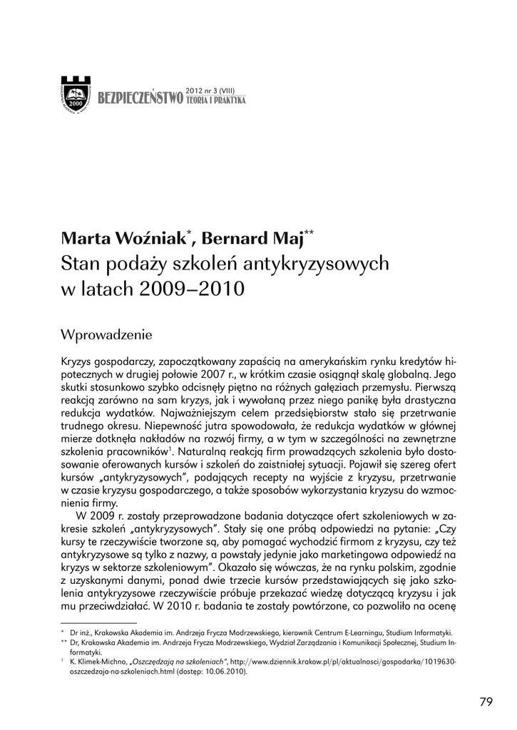 2012 nr 3 (VIII) BEZPIECZEŃSTWO TEORIA I PRAKTYKA Marta Woźniak*, Bernard Maj** Stan podaży szkoleń antykryzysowych w latach 2009–2010 Wprowadzenie Kryzys gospodarczy, zapoczątkowany zapaścią na amerykańskim rynku kredytów hipotecznych w drugiej połowie 2007 r., w krótkim czasie osiągnął skalę globalną. Jego skutki stosunkowo szybko odcisnęły piętno na różnych gałęziach przemysłu. Pierwszą reakcją zarówno na sam kryzys, jak i wywołaną przez niego panikę była drastyczna redukcja wydatków. Najważniejszym celem przedsiębiorstw stało się przetrwanie trudnego okresu. Niepewność jutra spowodowała, że redukcja wydatków w głównej mierze dotknęła nakładów na rozwój firmy, a w tym w szczególności na zewnętrzne szkolenia pracowników1. Naturalną reakcją firm prowadzących szkolenia było dostosowanie oferowanych kursów i szkoleń do zaistniałej sytuacji. Pojawił się szereg ofert kursów „antykryzysowych”, podających recepty na wyjście z kryzysu, przetrwanie w czasie kryzysu gospodarczego, a także sposobów wykorzystania kryzysu do wzmocnienia firmy. W 2009 r. zostały przeprowadzone badania dotyczące ofert szkoleniowych w zakresie szkoleń „antykryzysowych”. Stały się one próbą odpowiedzi na pytanie: „Czy kursy te rzeczywiście tworzone są, aby pomagać wychodzić firmom z kryzysu, czy też antykryzysowe są tylko z nazwy, a powstały jedynie jako marketingowa odpowiedź na kryzys w sektorze szkoleniowym”. Okazało się wówczas, że na rynku polskim, zgodnie z uzyskanymi danymi, ponad dwie trzecie kursów przedstawiających się jako szkolenia antykryzysowe rzeczywiście próbuje przekazać wiedzę dotyczącą kryzysu i jak mu przeciwdziałać. W 2010 r. badania te zostały powtórzone, co pozwoliło na ocenę * Dr inż., Krakowska Akademia im. Andrzeja Frycza Modrzewskiego, kierownik Centrum E-Learningu, Studium Informatyki. ** Dr, Krakowska Akademia im. Andrzeja Frycza Modrzewskiego, Wydział Zarządzania i Komunikacji Społecznej, Studium Informatyki. 1 K. Klimek-Michno, „Oszczędzają na szkoleniach”, http://www.dziennik.krakow.pl/pl/aktualnosci/gospodarka/1019630oszczedzaja-na-szkoleniach.html (dostęp: 10.06.2010). 79 Marta Woźniak, Bernard Maj zmian rynku szkoleń w zakresie ofert szkoleń „antykryzysowych”. W niniejszym tekście analizie zostanie poddany stan podaży ofert szkoleń antykryzysowych na tle sytuacji z roku 2009. Jednocześnie podjęta zostanie próba określenia kierunków tematycznych, w których stronę ewoluowały szkolenia na przestrzeni ostatniego roku. Materiał badawczy i metodologia badań Najpopularniejszym i jednocześnie najefektywniejszym medium, za pomocą którego oferty szkoleniowe trafiają do odbiorców, jest internet. Biorąc pod uwagę rzetelność i wiarygodność uzyskanych wyników, autorzy utworzyli listę szkoleń antykryzysowych (posiadających słowo kryzys w nazwie lub jako słowo kluczowe) spośród szkoleń zgromadzonych na trzech portalach wyspecjalizowanych w zbieraniu i grupowaniu rozmaitych kursów i szkoleń, tj.: • www.szkolenia.com.pl; • szkolenia.nf.pl; • edustacja.pl/pl/szkolenia. Są to jednocześnie portale, w których zbierano dane w roku 2009, zatem możliwa będzie obiektywna ocena zmian, jakie miały miejsce w zakresie m.in. tematyki szkoleń. Na portalach tych odnaleziono w chwili aktualizacji artykułu2 115 różnych szkoleń posiadających w nazwie słowo kryzys lub było to słowo kluczowe dla danego szkolenia (część szkoleń powtarzała się na dwu lub trzech portalach). Na kolejne etapy badań składa się: – wyszukanie ofert szkoleń, które w nazwie posiadały słowo kryzys lub dla danego szkolenia było to słowo kluczowe, – selekcja szkoleń pod kątem tematyki kursu i jednocześnie określenie, czy jest to istotnie kurs o charakterze „antykryzysowym”, – analiza wyselekcjonowanych w poprzednim etapie kursów w zakresie poruszanych zagadnień, – porównawcza analiza wyników badań uzyskanych w roku 2009 i 2010. Analiza szkoleń Biorąc pod uwagę łączną liczbę szkoleń oferowanych na trzech wymienionych wcześniej portalach, można stwierdzić, że w roku 2010 szkolenia antykryzysowe stanowią 0,49% wszystkich oferowanych kursów. W porównaniu z rokiem poprzednim, gdzie odsetek ten wynosił 0,39%, widoczny jest znaczny wzrost. Ponadto porównując dane umieszczone na wykresie z rysunku 1, można zauważyć, że mimo ogólnego spadku liczby oferowanych szkoleń na badanych portalach, liczba szkoleń antykryzysowych w porównaniu z rokiem 2009 wzrosła. Z uwagi na znaczne różnice w wielkości liczb określających szkolenia ogółem oraz szkolenia antykryzysowe, dla lepszego zobrazowania danych, wykres z rysunku 1 pokazany jest w skali logarytmicznej. 2 80 10.06.2010 r. Stan podaży szkoleń antykryzysowych w latach 2009–2010 Rysunek 1. Udział szkoleń „antykryzysowych” w ogólnej liczbie szkoleń oferowanych przez badane portale Źródło: opracowanie własne. Zgromadzone dane pozwoliły również określić liczbę nowych szkoleń, jakie pojawiły się w trzech portalach, jak również liczbę ofert szkoleń, które się zakończyły lub zostały wycofane. Wykres z rysunku 2 przedstawia liczbę szkoleń i kursów oferowanych przez portale z podziałem na te, które były oferowane w 2009 r. i nadal są aktualne oraz nowe, które nie były oferowane w 2009 r. Ostatni słupek wykresu przedstawia ogólną liczbę nieaktualnych w 2010 r. kursów prowadzonych w roku 2009, na podstawie danych zebranych z trzech portali. Jak widać, łączna liczba nowych ofert szkoleniowych, jest wyższa od liczby szkoleń nieaktualnych. 48 50 45 36 40 35 30 23 25 18 20 15 10 15 8 5 3 0 Rysunek 2. Liczba szkoleń „antykryzysowych” oferowanych przez portale, z podziałem na szkolenia oferowane w 2009 i nadal aktualne, nowe i nieaktualne Źródło: opracowanie własne. 81 Marta Woźniak, Bernard Maj Dane z poszczególnych