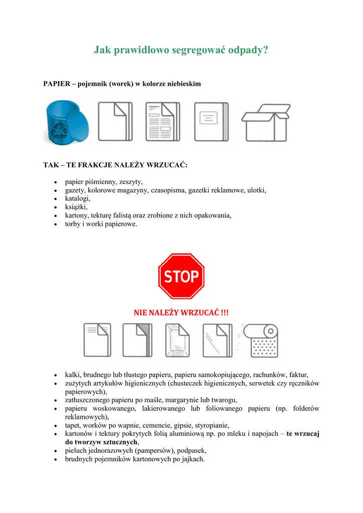 Jak prawidłowo segregować odpady? PAPIER – pojemnik (worek) w kolorze niebieskim TAK – TE FRAKCJE NALEŻY WRZUCAĆ: papier piśmienny, zeszyty, gazety, kolorowe magazyny, czasopisma, gazetki reklamowe, ulotki, katalogi, książki, kartony, tekturę falistą oraz zrobione z nich opakowania, torby i worki papierowe. NIE NALEŻY WRZUCAĆ !!! kalki, brudnego lub tłustego papieru, papieru samokopiującego, rachunków, faktur, zużytych artykułów higienicznych (chusteczek higienicznych, serwetek czy ręczników papierowych), zatłuszczonego papieru po maśle, margarynie lub twarogu, papieru woskowanego, lakierowanego lub foliowanego papieru (np. folderów reklamowych), tapet, worków po wapnie, cemencie, gipsie, styropianie, kartonów i tektury pokrytych folią aluminiową np. po mleku i napojach – te wrzucaj do tworzyw sztucznych, pieluch jednorazowych (pampersów), podpasek, brudnych pojemników kartonowych po jajkach. TWORZYWA SZTUCZNE – pojemnik (worek) w kolorze żółtym TAK – TE FRAKCJE NALEŻY WRZUCAĆ: puste i zgniecione butelki plastikowe po napojach (nakrętki wrzucamy oddzielnie), zgniecione i puste opakowania po chemii gospodarczej (po proszkach, szamponach, mydłach w płynie – nakrętki wrzucamy oddzielnie), aluminiowe puszki po napojach, zakrętki metalowe, metalowe opakowania po sokach, owocach, warzywach, rybach i karmach, (umyte i zgniecione), drobny złom żelazny oraz metali kolorowych (np. narzędzia), kartony i tektury pokryte folią aluminiową po mleku i napojach (przepłukane i wysuszone), torebki, folie, kubeczki po żywności (np. po jogurtach, kefirach, serkach, margarynach - umyte), worki foliowe, reklamówki. NIE NALEŻY WRZUCAĆ !!! butelek i pojemników z zawartością, plastikowych zabawek i szczoteczek do zębów, opakowań po lekach, farbach, po środkach chwasto czy owadobójczych i aerozolach, opakowań po wyrobach garmażeryjnych, opakowań po olejach spożywczych, samochodowych i smarach, części samochodowych, gumy i baterii, mebli i ich części oraz styropianu, tekstyliów i rajstop z poliamidu, sprzętu AGD oraz plastikowych przedmiotów łączonych z innymi. SZKŁO BEZBARWNE I KOLOROWE – pojemnik (worek) w kolorze białym TAK – TE FRAKCJE NALEŻY WRZUCAĆ: butelki ze szkła bezbarwnego i kolorowego po napojach (bez nakrętek i korków), czyste słoiki ze szkła bezbarwnego i kolorowego (bez nakrętek, zacisków, a także gumowych uszczelek), szklane opakowania po kosmetykach (bez metalowych elementów). NIE NALEŻY WRZUCAĆ !!! szkła okiennego, zbrojonego i szyb samochodowych, szklanek, kieliszków, naczyń ze szkła żaroodpornego, naczyń nietłukących się i kryształu, ceramiki (talerzy, porcelany, fajansu) i doniczek, luster, kineskopów, ekranów i lamp telewizyjnych, świetlówek i żarówek, opakowań po lekach, termometrów i szkieł optycznych. ODPADY BIODEGRADOWALNE – JAK JE GROMADZIMY LUB ZAGOSPODAROWUJEMY Bioodpady tzw. mokre, segregujemy w celu zagospodarowania ich we własnym zakresie np. na kompost lub w celu przekazania przedsiębiorcy, który świadczy usługi odbioru i zagospodarowania tych odpadów na rzecz Gminy Kuźnia Raciborska. Jeżeli odpady zbieramy w celu przekazania ich przedsiębiorcy, to gromadzimy je w pojemnikach lub workach, w kolorach innych niż do segregacji papieru, szkła i plastiku. Dostępnymi kolorami są: czarny, brązowy lub zielony. Co wrzucamy do pojemnika: obierki z warzyw i owoców, resztki żywności, przeterminowaną żywność, skorupki z jaj, stare pieczywo, fusy po kawie i herbacie, łupiny, ziarna i pestki, zwiędłe kwiaty i rośliny doniczkowe, odpady z ogródków (trawa, liście, gałązki pocięte na krótkie kawałki itp.). Czego nie wrzucamy: worków foliowych, odpadów surowcowych (tworzyw sztucznych, makulatury, szkła i metalu), odpadów niebezpiecznych (żarówek, baterii, lekarstw itp.), surowego mięsa i padliny, drewna, piasku i popiołu, chemicznie skażonej ziemi, środków ochrony roślin. Jeżeli odpady zbieramy w celu zagospodarowania ich we własnym zakresie, czyli do kompostowania, czynimy to w odpowiednich przystosowanych do tego pojemnikach lub w kompostownikach wykonanych we własnym zakresie. Szereg informacji na temat kompostowania, można znaleźć w różnych publikacjach książkowych, broszurach oraz na stronach Internetowych. ODPADÓW ULEGAJĄCYCH BIODEGRADACJI NIE MOŻNA ODDAWAĆ Z POZOSTAŁYMI ODPADAMI KOMUNALNYMI ZMIESZANYMI !!! Segregacja się opłaca Produkt staje się odpadem wtedy, kiedy przestaje być nam użyteczny. Należy go wówczas wyrzucić w odpowiednie miejsce, aby nie stanowił dla nas żadnego zagrożenia, dając mu jednocześnie drugie życie, tj. szansę na to, że odpad znów stanie się użyteczny. Segregując odpady przyczyniasz się do ochrony środowiska i zaoszczędzisz. Przepisy nowej ustawy gwarantują, że opłata za odpady posegregowane będzie niższa. Segregacja to czysty zysk. Powtórne wykorzystanie czy przetwarzanie posegregowanych odpadów znajduje coraz szersze zastosowanie w produktach codziennego użytku. Segregując odpady oszczędzamy zasoby naturalne: wodę energię. Z odpadów mogą powstać np., chusteczki higieniczne, papier toaletowy, kubki, doniczki, kolczyki, kosze, torebki a nawet meble czy ubrania. Pamiętaj: zawsze zgniataj puszki, kartony i butelki plastikowe przed wrzuceniem do pojemnika, wyrzucaj butelki bez nakrętek i korków, wybierając się na zakupy zabierajmy ze sobą własne siatki np. lniane, dzięki temu ograniczysz zużycie plastikowych torebek, zwróć uwagę co producent proponuje zrobić z opakowaniem po wykorzystaniu jego zawartości (zobacz znak na opakowaniu), do wycierania używaj szmatek wielokrotnego użycia zamiast papierowych ręczników.