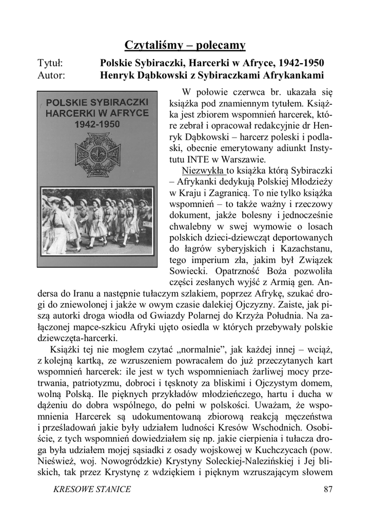 Czytaliśmy – polecamy Tytuł: Autor: Polskie Sybiraczki, Harcerki w Afryce, 1942-1950 Henryk Dąbkowski z Sybiraczkami Afrykankami W połowie czerwca br. ukazała się książka pod znamiennym tytułem. Książka jest zbiorem wspomnień harcerek, które zebrał i opracował redakcyjnie dr Henryk Dąbkowski – harcerz poleski i podlaski, obecnie emerytowany adiunkt Instytutu INTE w Warszawie. Niezwykła to książka którą Sybiraczki – Afrykanki dedykują Polskiej Młodzieży w Kraju i Zagranicą. To nie tylko książka wspomnień – to także ważny i rzeczowy dokument, jakże bolesny i jednocześnie chwalebny w swej wymowie o losach polskich dzieci-dziewcząt deportowanych do łagrów syberyjskich i Kazachstanu, tego imperium zła, jakim był Związek Sowiecki. Opatrzność Boża pozwoliła części zesłanych wyjść z Armią gen. Andersa do Iranu a następnie tułaczym szlakiem, poprzez Afrykę, szukać drogi do zniewolonej i jakże w owym czasie dalekiej Ojczyzny. Zaiste, jak piszą autorki droga wiodła od Gwiazdy Polarnej do Krzyża Południa. Na załączonej mapce-szkicu Afryki ujęto osiedla w których przebywały polskie dziewczęta-harcerki. Książki tej nie mogłem czytać „normalnie”, jak każdej innej – wciąż, z kolejną kartką, ze wzruszeniem powracałem do już przeczytanych kart wspomnień harcerek: ile jest w tych wspomnieniach żarliwej mocy przetrwania, patriotyzmu, dobroci i tęsknoty za bliskimi i Ojczystym domem, wolną Polską. Ile pięknych przykładów młodzieńczego, hartu i ducha w dążeniu do dobra wspólnego, do pełni w polskości. Uważam, że wspomnienia Harcerek są udokumentowaną zbiorową reakcją męczeństwa i prześladowań jakie były udziałem ludności Kresów Wschodnich. Osobiście, z tych wspomnień dowiedziałem się np. jakie cierpienia i tułacza droga była udziałem mojej sąsiadki z osady wojskowej w Kuchczycach (pow. Nieśwież, woj. Nowogródzkie) Krystyny Soleckiej-Nalezińskiej i Jej bliskich, tak przez Krystynę z wdziękiem i pięknym wzruszającym słowem KRESOWE STANICE 87 utrwalonym na łamach tych niezwykłych wspomnień. Jest to książka wspaniała pod każdym względem, głęboko wzruszająca i ukazująca ogrom ludzkich cierpień Kresowych dzieci, harcerek Sądzę, że każdy kto przeczyta „Wspomnienia” będzie ją polecał innym, powinna znaleźć się w każdym domu polskim. Gorąco zachęcam do przeczytania i rozpowszechniania. Książka ma 236 stron, plus aneks 20 stron oraz 64 strony dobrych ilustracji z nazwiskami, jest bardzo cenną pamiątką dla tych co przebyli ten Afrykański szlak cierpień, tęsknoty i chwały – ale nie tylko dla Tych lecz dla każdego Polaka. Można ją nabyć pod adresem: Harcerskie Biuro Wydawnicze „Horyzonty”, 00-491 Warszawa, ul. M. Konopnickiej 6, telefon 628-92-81 wew. 253 lub 115, lub w księgarni Kresowej w Warszawie, Krakowskie Przedmieście 64 oraz w naszym Stowarzyszeniu. Przyjmowane są zamówienia telefoniczne za zaliczeniem pocztowym. Cena książki wynosi 25 zł. Stowarzyszenie Rodzin Osadników Wojskowych wystąpi z umotywowanym wnioskiem do Ministerstwa Edukacji Narodowej o wprowadzenie książki do spisu lektur dla szkół średnich. Na zakończenie; Harcerko tułaczko! – składam Tobie i Wam wszystkim głęboki pokłon, przekazuję słowa wszelkiej czci i uznania, za to, że służyliście dobrej sprawie, za to, że byliście tak dzielne, że pod każdą geograficzną szerokością tułaczego szlaku biły w Waszych piersiach gorące Polskie serca przepojone patriotyzmem dla umiłowanej Ojczyzny. A tym polskim dzieciom zesłańcom, spoczywającym na bezkresnych obszarach imperium zła, częstokroć w bezimiennych grobach, niech Pan Bóg da wieczne odpoczywanie w pokoju, niech Dar Nieba wynagrodzi im krzywdy i cierpienia, doznane z rąk ciemiężycieli, stalinowskich katów. Czuwaj! Harcerz Orli z Wilna Jerzy Szymański – Prezes Stowarzyszenia Miłośników Wołynia i Kresów zachęcamy do czytania kwartalnika Wołyń Bliżej. Jest to pismo Społecznego Komitetu Pomocy Parafii Rzymskokatolickiej w Równem na Wołyniu. Redaktorem naczelnym jest Pani Krystyna Wojciechowska. Na 100 stronach znajdziemy bardzo dużo ciekawego materiału i zdjęć. Niżej podajemy adres i telefon redakcji: Krystyna Wojciechowska „Wołyń bliżej” ul. I.J.Paderewskiego 7/38 tel. 0 1033 (61) 28 34 991 63-100 Śrem 88 KRESOWE STANICE