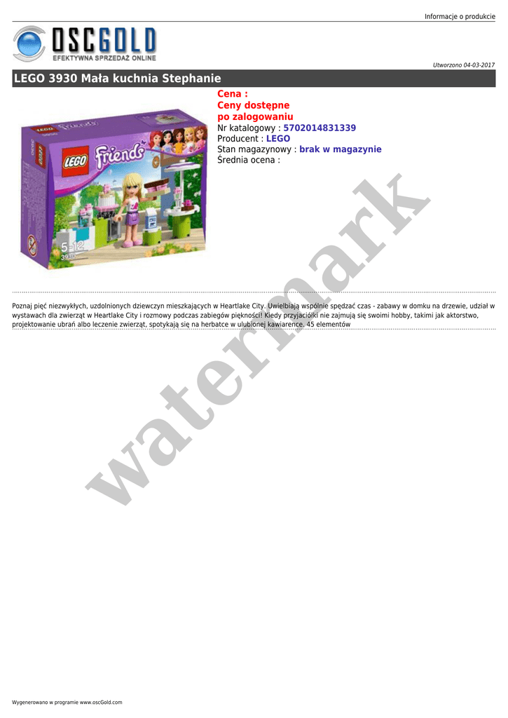 Informacje o produkcie Utworzono 04-03-2017 LEGO 3930 Mała kuchnia Stephanie Cena : Ceny dostępne po zalogowaniu er m ar k Nr katalogowy : 5702014831339 Producent : LEGO Stan magazynowy : brak w magazynie Średnia ocena : w at Poznaj pięć niezwykłych, uzdolnionych dziewczyn mieszkających w Heartlake City. Uwielbiają wspólnie spędzać czas - zabawy w domku na drzewie, udział w wystawach dla zwierząt w Heartlake City i rozmowy podczas zabiegów piękności! Kiedy przyjaciółki nie zajmują się swoimi hobby, takimi jak aktorstwo, projektowanie ubrań albo leczenie zwierząt, spotykają się na herbatce w ulubionej kawiarence. 45 elementów Wygenerowano w programie www.oscGold.com
