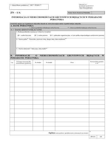 Załącznik Nr 3 do uchwały Nr XXI/353/15 Rady Miasta Bydgoszczy z dnia 25 listopada 2015 r. 1. Identyfikator podatkowy1: NIP */ PESEL** ................................................................................................................................................................ ZN – 1/A 2. NumerPodatnika załącznika Numer Karty Kontowej ......................................... INFORMACJA O NIERUCHOMOŚCIACH GRUNTOWYCH BĘDĄCYCH W POSIADANIU PODATNIKA Jeżeli ilość miejsca na wypełnionym załączniku okazała się niewystarczająca należy wypełnić kolejny załącznik. A. DANE PODATNIKA * - dotyczy podatnika niebędącego osobą fizyczną ** - dotyczy podatnika będącego osobą fizyczną A.1. DANE IDENTYFIKACYJNE 3. Rodzaj podatnika (zaznaczyć właściwy kwadrat) 1. osoba fizyczna 2. osoba prawna 3. jednostka organizacyjna, w tym spółka nieposiadająca osobowości prawnej 4. Nazwa pełna* / Nazwisko, pierwsze imię, drugie imię, data urodzenia** 5. Nazwa skrócona* / Imię ojca, imię matki** B. INFORMACJE O NIERUCHOMOŚCIACH POSIADANIU PODATNIKA L.p. Nr księgi wieczystej dla nieruchomości gruntowej Nr obrębu Nr działki GRUNTOWYCH BĘDĄCYCH Ulica W Powierzchnia gruntów w m2 6. Ogółem (suma podstaw opodatkowania wykazanych na stronie): ZN-1/A 1/2 B. INFORMACJE O NIERUCHOMOŚCIACH POSIADANIU PODATNIKA L.p. Nr księgi wieczystej dla nieruchomości gruntowej Nr obrębu Nr działki GRUNTOWYCH BĘDĄCYCH Ulica W Powierzchnia gruntów w m2 7. Ogółem (suma podstaw opodatkowania wykazanych na stronie): ZN-1/A 1 2/2 Identyfikatorem podatkowym, zgodnie z treścią art. 3 ustawy z dnia 13 października 1995 r. o zasadach ewidencji i identyfikacji podatników i płatników (t. j. Dz. U. z 2012 r., poz. 1314 ze zm.) jest numer PESEL – w przypadku podatników będących osobami fizycznymi objętymi rejestrem PESEL nieprowadzących działalności gospodarczej lub niebędących zarejestrowanymi podatnikami podatku od towarów i usług; NIP – w przypadku pozostałych podmiotów podlegających obowiązkowi ewidencyjnemu.