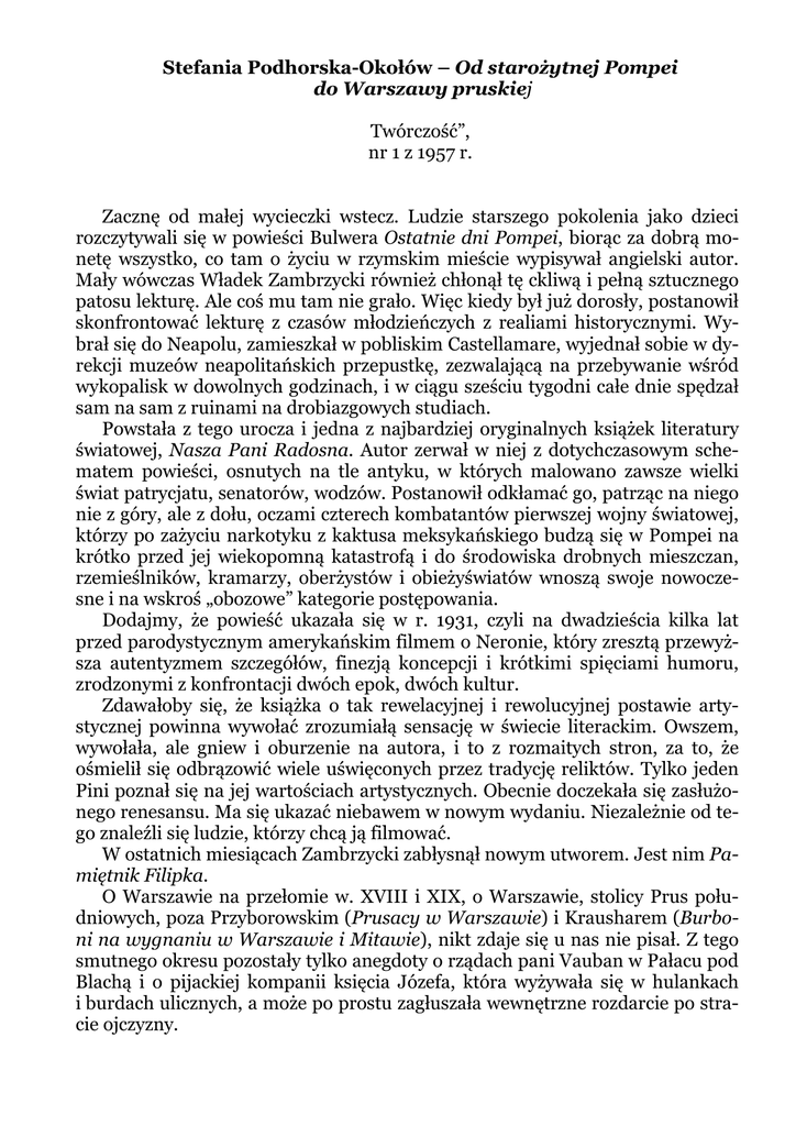 Stefania Podhorska-Okołów – Od starożytnej Pompei do Warszawy pruskiej Twórczość”, nr 1 z 1957 r. Zacznę od małej wycieczki wstecz. Ludzie starszego pokolenia jako dzieci rozczytywali się w powieści Bulwera Ostatnie dni Pompei, biorąc za dobrą monetę wszystko, co tam o życiu w rzymskim mieście wypisywał angielski autor. Mały wówczas Władek Zambrzycki również chłonął tę ckliwą i pełną sztucznego patosu lekturę. Ale coś mu tam nie grało. Więc kiedy był już dorosły, postanowił skonfrontować lekturę z czasów młodzieńczych z realiami historycznymi. Wybrał się do Neapolu, zamieszkał w pobliskim Castellamare, wyjednał sobie w dyrekcji muzeów neapolitańskich przepustkę, zezwalającą na przebywanie wśród wykopalisk w dowolnych godzinach, i w ciągu sześciu tygodni całe dnie spędzał sam na sam z ruinami na drobiazgowych studiach. Powstała z tego urocza i jedna z najbardziej oryginalnych książek literatury światowej, Nasza Pani Radosna. Autor zerwał w niej z dotychczasowym schematem powieści, osnutych na tle antyku, w których malowano zawsze wielki świat patrycjatu, senatorów, wodzów. Postanowił odkłamać go, patrząc na niego nie z góry, ale z dołu, oczami czterech kombatantów pierwszej wojny światowej, którzy po zażyciu narkotyku z kaktusa meksykańskiego budzą się w Pompei na krótko przed jej wiekopomną katastrofą i do środowiska drobnych mieszczan, rzemieślników, kramarzy, oberżystów i obieżyświatów wnoszą swoje nowoczesne i na wskroś „obozowe” kategorie postępowania. Dodajmy, że powieść ukazała się w r. 1931, czyli na dwadzieścia kilka lat przed parodystycznym amerykańskim filmem o Neronie, który zresztą przewyższa autentyzmem szczegółów, finezją koncepcji i krótkimi spięciami humoru, zrodzonymi z konfrontacji dwóch epok, dwóch kultur. Zdawałoby się, że książka o tak rewelacyjnej i rewolucyjnej postawie artystycznej powinna wywołać zrozumiałą sensację w świecie literackim. Owszem, wywołała, ale gniew i oburzenie na autora, i to z rozmaitych stron, za to, że ośmielił się odbrązowić wiele uświęconych przez tradycję reliktów. Tylko jeden Pini poznał się na jej wartościach artystycznych. Obecnie doczekała się zasłużonego renesansu. Ma się ukazać niebawem w nowym wydaniu. Niezależnie od tego znaleźli się ludzie, którzy chcą ją filmować. W ostatnich miesiącach Zambrzycki zabłysnął nowym utworem. Jest nim Pamiętnik Filipka. O Warszawie na przełomie w. XVIII i XIX, o Warszawie, stolicy Prus południowych, poza Przyborowskim (Prusacy w Warszawie) i Krausharem (Burboni na wygnaniu w Warszawie i Mitawie), nikt zdaje się u nas nie pisał. Z tego smutnego okresu pozostały tylko anegdoty o rządach pani Vauban w Pałacu pod Blachą i o pijackiej kompanii księcia Józefa, która wyżywała się w hulankach i burdach ulicznych, a może po prostu zagłuszała wewnętrzne rozdarcie po stracie ojczyzny. Tę niewyraźną kartę w dziejach Warszawy Zambrzycki postanowił odczytać oczami plebejusza miejskiego, przysłowiowego „próżniaka spod kolumny Zygmunta”, sprytnego wyjadacza i totumfackiego przekupek spod Krakowskiej Bramy, pocztylionów z Poczty Saskiej, nalepiaczy afiszów teatralnych i rozporządzeń władz pruskich, szewców i murarzy staromiejskich, popularnych lekarzy i uczonych. Taki warszawski Figaro na małą skalę, naiwniejszy od tamtego i bardziej dobroduszny, swojski „chłopek-roztropek”. Pomiędzy nim a autorem książki nastąpił konsekwentny podział pracy. Zambrzycki ryje się jak kret w próchnicy archiwaliów, pamiętników, ulotek, kalendarzy, książek lekarskich, późniejszych opracowań i szkiców historycznych, a Filipek wszystko to skrzętnie notuje, podlewając obficie sosem własnej inwencji. Tak powstała swoista silva rerum, stos bezładnych, zdawałoby się, kartek, mozaika autentycznych faktów, legend, plotek, przesądów, taki reportaż-monstre, z którego wyłania się oblicze ówczesnej Warszawy, jakże bardzo egzotyczne dla dzisiejszego czytelnika. Fikcja autorska jest aż nadto przejrzysta. Filipek wszystkich zna i wszędzie go pełno. Nie było to trudne w owych czasach, gdy Warszawa miała wszystkiego 58 tysięcy mieszkańców, a całe jej życie koncentrowało się między Krakowską Bramą a Marywilem. Stojąc na swoim stanowisku pod kolumną, Filipek widzi, jak na balkonie nieistniejącej dziś kamienicy Wasilewskiego hr. de Lille (w istocie niekoronowany król francuski Ludwik XVIII, który z całą rzeszą emigrantów schronił się do Warszawy) przestępuje z nogi na nogę, co dla ludu warszawskiego jest nieomylną przepowiednią deszczu; jak gromada chłopiąt ugania się za doktorem Dubois, zwanym Dzibułą, który poważnie kroczy przez miasto w długim do ziemi płaszczu, w olbrzymiej peruce z końskich ogonów, „niosąc pod pachą miedzianą sikawkę do robienia tylnej medycyny”, istny doktor Purgeon z Molierowskiego Chorego z urojenia. Filipek ma znajomych i z ówczesnego świata intelektualnego Warszawy. Dostarcza panu Lindemu wiadomości, kto przyjechał na Saską Pocztę do stolicy, aby przybyszowi zanieść prospekt Słownika języka polskiego. Pijarowi Onufremu Kopczyńskiemu sprząta izbę pełną ksiąg. Panu Magierowi znosi plotki miejskie. Zna i Amadeusza Hoffmanna, podobnego do diabła, poetę, muzyka i malarza, który w Kamerze pruskiej Żydom nadaje nazwiska. Roznosi po domach „Nowy pamiętnik warszawski” pana Dmochowskiego, pomaga słynnemu drukarzowi Gröllowi w przeprowadzce z Marywilu na Krzywe Koło, zna księgarnie: Gaya na Senatorskiej, Gecla na Mariensztacie, Pfaffa na Marywilu. Ale ludek warszawski najchętniej kupuje osiemnastowieczne książki nabożne i medyczne, drukowane u księży bazylianów w Supraślu. Dziwnie, a chwilami przestraszająco, wygląda ten schyłek wieku Oświecenia od podszewki, od kuchennych schodów. Warszawa aż kipi cudami. Hr. de L