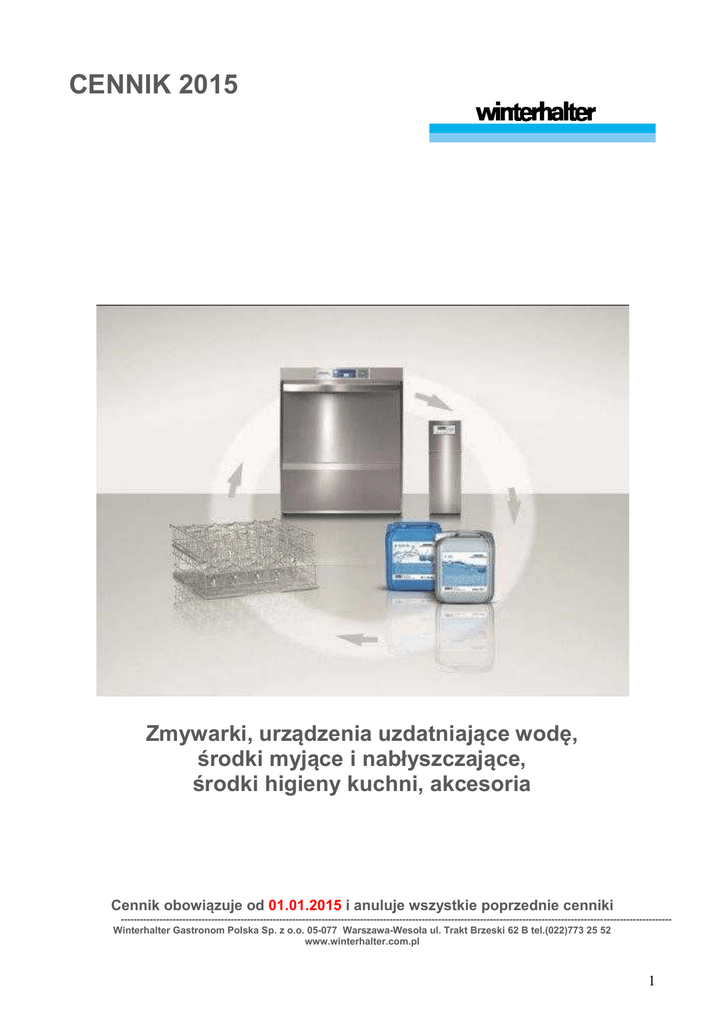 CENNIK 2015 Zmywarki, urządzenia uzdatniające wodę, środki myjące i nabłyszczające, środki higieny kuchni, akcesoria Cennik obowiązuje od 01.01.2015 i anuluje wszystkie poprzednie cenniki -------------------------------------------------------------------------------------------------------------------------------------------------------------------------Winterhalter Gastronom Polska Sp. z o.o. 05-077 Warszawa-Wesoła ul. Trakt Brzeski 62 B tel.(022)773 25 52 www.winterhalter.com.pl 1 SPIS TREŚCI Urządzenia do uzdatniania wody Zmiękczacze wody MonoMatik 1x4, DuoMatikII, Tapworks9 Urządzenie do pełnej demineralizacji VE20 Urządzenia do odwróconej osmozy Romatik 150,160,210,420 Urządzenia do demineralizacji MD/MTW strona Maszyny w wersji morskiej strona 3 Transformatory do maszyn na statki 49 3 4 Zewnętrzne urządzenia dozujące strona Dozowniki zewnętrzne 50 Kosze strona 5 Zmywarki podblatowe strona Informacje ogólne 6-7 8-9 11-12 Dane techniczne UC Zmywarki do szkła UC-S, UC-M, UC-L, UC-XL Zmywarki do naczyń UC-S, UC-M, UC-L, UC-XL Zmywarki bistro UC-S, UC-M, UC-L, UC-XL Zmywarki do sztućców UC-S, UC-M, UC-L, UC-XL 13-14 15-16 17-18 Zmywarki kapturowe strona Zmywarki kapturowe PT informacje ogólne 20-24 25 Zmywarka kapturowa PT-500 Zmywarka kapturowa PT-M Zmywarka kapturowa PT-M EnergyPlus Zmywarka kapturowa PT-L Zmywarka kapturowa PT-L EnergyPlus Zmywarka kapturowa PT-XL Zmywarka kapturowa PT-XL EnergyPlus Kosze do zmywarek PT 27 28 29 30 31 32-37 strona Zmywarka STR110/130 38-39 Zmywarki wielozbiornikowe strona Zmywarka z transportem koszy MTR Zmywarka z transportem taśmowym MTF 40 Zmywarki do garnków i przyrządów kuchennych strona Zmywarka GS630 42 43-44 45-46 47-48 Zmywarka GS650 / Energy Zmywarka GS660 / Energy Środki chemiczne Środki do mycia i czyszczenia Stoły i stacje sortownicze Stoły do maszyn serii GS500,MT,STR110 51-52 53 54-55 56-57 strona 58-62 strona 63-72 26 Zmywarki z transportem koszy Zmywarka GS640 / Energy Kosze do naczyń Kosze do naczyń, sztućców i innych przyrządów Kosze do szkła Kosze do szkła i przyrządów kuchennych Cennik: Podane ceny są cenami netto w PLN. Ceny nie zawierają kosztów transportu i podłączenia. Ceny transportu i podłączenia są ustalane indywidualnie. Planowanie: Przy planowaniu pomieszczenia zmywalni należy bezwzględnie pamiętać o podanych wymiarach zmywarek, stołów i innych urządzeń. 41 Cennik obowiązuje od 01.01.2015 i anuluje wszystkie poprzednie cenniki -------------------------------------------------------------------------------------------------------------------------------------------------------------------------Winterhalter Gastronom Polska Sp. z o.o. 05-077 Warszawa-Wesoła ul. Trakt Brzeski 62 B tel.(022)773 25 52 www.winterhalter.com.pl 2 Urządzenia uzdatniające wodę Zmiękczacze wody oraz urządzenie do pełnej demineralizacji MonoMatik 1x4 DuoMatik II Zmiękczacze Tapworks 9 Numer katalogowy Te urządzenia tylko zmiękczają wodę, nie dają idealnego efektu mycia w przypadku szkła Winterhalter MonoMatik 1x4 Temperatura doprowadzonej wody nie może przekraczać 50oC, pojemnik na żywicę wykonany z fibre glass, obudowa i pokrywa z tworzywa sztucznego. Wydajność 13 litrów na minutę Proces regeneracji sterowany zegarem elektrycznym 230V/1/N/PE/50Hz MonoMatik bez zaworu zwrotnego (WSE-set) 20 000 826 Zawór zwrotny (WSE-set) 5101464 VE 20 Cena w Pln 4.100,00 340,00 Winterhalter DuoMatik II Temperatura doprowadzonej wody nie może przekraczać 60oC, pojemnik na żywicę wykonany z fibre glass, obudowa i pokrywa z tworzywa sztucznego. Proces regeneracji kontrolowany licznikiem , który sterowany jest przepływem wody. Wydajność 22 litry na minutę. Zawór zwrotny (WSE-set) Tapworks 9 Temperatura doprowadzonej wody nie może przekraczać 490C. Wydajność 18 litrów na minutę. Zasilanie elektryczne 230V.Podtrzymanie pamięci 24h. 5501463 7.950,00 5101464 300,00 3.200,00 Urządzenie do pełnej demineralizacji Numer katalogowy Cena w Pln To urządzenie zalecanie jest do stosowania w przypadku mycia szkła Winterhalter VE 20 (bez licznika wody i wyświetlacza) 5101612 Winterhalter VE 20 (z licznikiem wody i wyświetlaczem) 5101212 Od stycznia 2002r. licznik i wyświetlacz nie jest konieczny do maszyn marki Winterhalter. Wszystkie maszyny wyprodukowane po tym okresie posiadają płytę sterującą WPS na której można zaprogramować licznik zużycia wody. 4.800,00 5.000,00 ●Temperatura doprowadzonej wody nie może przekraczać 60o C, zbiornik VE wykonany jest ze stali nierdzewnej. o W przypadku, kiedy twardość wody nie przekracza 3 (niemiecka skala) zalecamy zastosowanie wbudowanego w maszynę zmiękczacza wody. 3 Urządzenia uzdatniające wodę Urządzenia do odwróconej osmozy; dla idealnego efektu mycia Romatik urządzenie do odwróconej osmozy Romatik XS Romatik 150 Romatik 160 Romatik 210 Romatik 420 Dane techniczne Temp. doprowadzonej wody 0 max+35 C max+250 C max+250 C max+250 C max+250 C min.90 max 150l/h max 160l/h max 210l/h max 420l/h Max. wydajność przy twardości wody 15 C (skala niemiecka) Max. Przewodność doprowadzonej wody uS/cm Max. twardość doprowadzonej wody 1200 1500 2000 2000 2000 350 dGH 250 dGH 250 dGH 100 dGH 100 dGH Wstępne zmiękczanie wody zalecane zalecane zalecane zalecane zalecane Podłączenie elektryczne V/Hz/A 230V,50,10 230V,50,10 230V,50, 10 230V,50,10 Numer katalogowy 200-240,5060,1.5-1.7 20000380 5101039 5101621 5101622 5101623 Cena 7.800,00 18.800,00 22.900,00 29.000,00 38.000,00 0 Wyposażenie dodatkowe do Romatika 150 Numer katalogowy Do maszyn do szkła z bojlerem ciśnieniowym Zbiornik ciśnieniowy (zestaw) 5101127 Zestaw do GS24 80002339 Zestaw do GS14,15,29,29B 80002133 Podstawa wys. 215 mm 75201040 Cena 1200,00 463,00 463,00 915,00 Wyposażenie dodatkowe do Romatika XS Przednia osłona filtra Filtr wstępny 80004396 30000591 300,00 140,00 ●Jeżeli w doprowadzonej wodzie zawartość chloru przekracza 0,1mg/l niezb