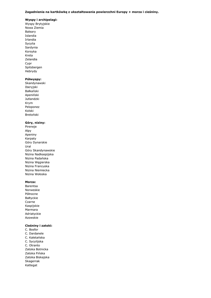 Zagadnienia na kartkówkę z ukształtowania powierzchni Europy + morza i cieśniny. Wyspy i archipelagi: Wyspy Brytyjskie Nowa Ziemia Baleary Islandia Irlandia Sycylia Sardynia Korsyka Kreta Zelandia Cypr Spitsbergen Hebrydy Półwyspy: Skandynawski Iberyjski Bałkański Apeniński Jutlandzki Krym Peloponez Kolski Bretoński Góry, niziny: Pireneje Alpy Apeniny Karpaty Góry Dynarskie Ural Góry Skandynawskie Nizina Nadkaspijska Nizina Padańska Nizina Węgierska Nizina Francuska Nizina Niemiecka Nizina Wołoska Morza: Barentsa Norweskie Północne Bałtyckie Czarne Kaspijskie Marmara Adriatyckie Azowskie Cieśniny i zatoki: C. Bosfor C. Dardanele C. Kaletańska C. Sycylijska C. Otranto Zatoka Botnicka Zatoka Fińska Zatoka Biskajska Skagerrak Kattegat