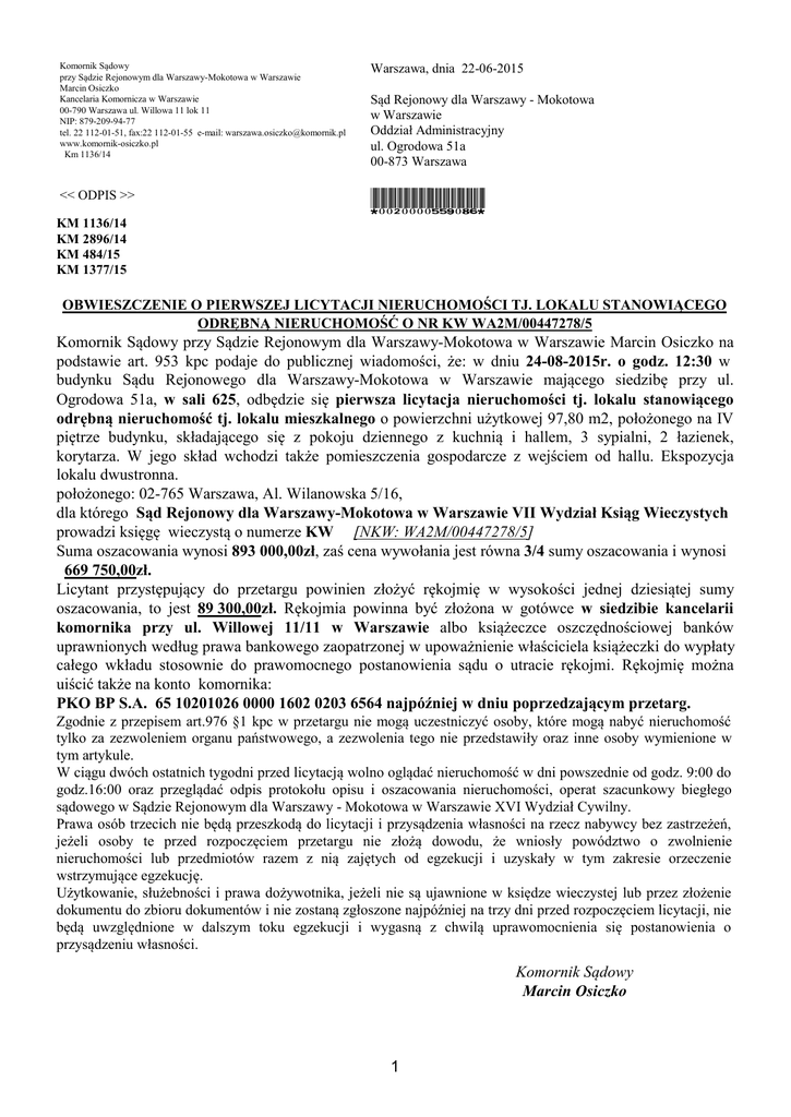 Komornik Sądowy przy Sądzie Rejonowym dla Warszawy-Mokotowa w Warszawie Marcin Osiczko Kancelaria Komornicza w Warszawie 00-790 Warszawa ul. Willowa 11 lok 11 NIP: 879-209-94-77 tel. 22 112-01-51, fax:22 112-01-55 e-mail: [email protected] www.komornik-osiczko.pl Km 1136/14 Warszawa, dnia 22-06-2015 << ODPIS >> *0020000559086* Sąd Rejonowy dla Warszawy - Mokotowa w Warszawie Oddział Administracyjny ul. Ogrodowa 51a 00-873 Warszawa KM 1136/14 KM 2896/14 KM 484/15 KM 1377/15 OBWIESZCZENIE O PIERWSZEJ LICYTACJI NIERUCHOMOŚCI TJ. LOKALU STANOWIĄCEGO ODRĘBNĄ NIERUCHOMOŚĆ O NR KW WA2M/00447278/5 Komornik Sądowy przy Sądzie Rejonowym dla Warszawy-Mokotowa w Warszawie Marcin Osiczko na podstawie art. 953 kpc podaje do publicznej wiadomości, że: w dniu 24-08-2015r. o godz. 12:30 w budynku Sądu Rejonowego dla Warszawy-Mokotowa w Warszawie mającego siedzibę przy ul. Ogrodowa 51a, w sali 625, odbędzie się pierwsza licytacja nieruchomości tj. lokalu stanowiącego odrębną nieruchomość tj. lokalu mieszkalnego o powierzchni użytkowej 97,80 m2, położonego na IV piętrze budynku, składającego się z pokoju dziennego z kuchnią i hallem, 3 sypialni, 2 łazienek, korytarza. W jego skład wchodzi także pomieszczenia gospodarcze z wejściem od hallu. Ekspozycja lokalu dwustronna. położonego: 02-765 Warszawa, Al. Wilanowska 5/16, dla którego Sąd Rejonowy dla Warszawy-Mokotowa w Warszawie VII Wydział Ksiąg Wieczystych prowadzi księgę wieczystą o numerze KW [NKW: WA2M/00447278/5] Suma oszacowania wynosi 893 000,00zł, zaś cena wywołania jest równa 3/4 sumy oszacowania i wynosi 669 750,00zł. Licytant przystępujący do przetargu powinien złożyć rękojmię w wysokości jednej dziesiątej sumy oszacowania, to jest 89 300,00zł. Rękojmia powinna być złożona w gotówce w siedzibie kancelarii komornika przy ul. Willowej 11/11 w Warszawie albo książeczce oszczędnościowej banków uprawnionych według prawa bankowego zaopatrzonej w upoważnienie właściciela książeczki do wypłaty całego wkładu stosownie do prawomocnego postanowienia sądu o utracie rękojmi. Rękojmię można uiścić także na konto komornika: PKO BP S.A. 65 10201026 0000 1602 0203 6564 najpóźniej w dniu poprzedzającym przetarg. Zgodnie z przepisem art.976 §1 kpc w przetargu nie mogą uczestniczyć osoby, które mogą nabyć nieruchomość tylko za zezwoleniem organu państwowego, a zezwolenia tego nie przedstawiły oraz inne osoby wymienione w tym artykule. W ciągu dwóch ostatnich tygodni przed licytacją wolno oglądać nieruchomość w dni powszednie od godz. 9:00 do godz.16:00 oraz przeglądać odpis protokołu opisu i oszacowania nieruchomości, operat szacunkowy biegłego sądowego w Sądzie Rejonowym dla Warszawy - Mokotowa w Warszawie XVI Wydział Cywilny. Prawa osób trzecich nie będą przeszkodą do licytacji i przysądzenia własności na rzecz nabywcy bez zastrzeżeń, jeżeli osoby te przed rozpoczęciem przetargu nie złożą dowodu, że wniosły powództwo o zwolnienie nieruchomości lub przedmiotów razem z nią zajętych od egzekucji i uzyskały w tym zakresie orzeczenie wstrzymujące egzekucję. Użytkowanie, służebności i prawa dożywotnika, jeżeli nie są ujawnione w księdze wieczystej lub przez złożenie dokumentu do zbioru dokumentów i nie zostaną zgłoszone najpóźniej na trzy dni przed rozpoczęciem licytacji, nie będą uwzględnione w dalszym toku egzekucji i wygasną z chwilą uprawomocnienia się postanowienia o przysądzeniu własności. Komornik Sądowy Marcin Osiczko 1