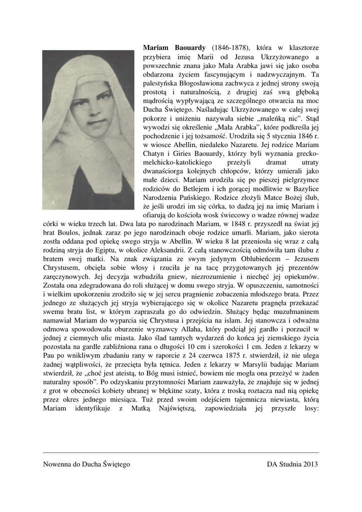 Mariam Baouardy (18461878), która w klasztorze przybiera imię Marii od Jezusa Ukrzyżowanego a powszechnie znana jako Mała Arabka jawi się jako osoba obdarzona życiem fascynującym i nadzwyczajnym. Ta palestyńska Błogosławiona zachwyca z jednej strony swoją prostotą i naturalnością, z drugiej zaś swą głęboką mądrością wypływającą ze szczególnego otwarcia na moc Ducha Świętego. Naśladując Ukrzyżowanego w całej swej pokorze i uniżeniu nazywała siebie „maleńką nic”. Stąd wywodzi się określenie „Mała Arabka”, które podkreśla jej pochodzenie i jej tożsamość. Urodziła się 5 stycznia 1846 r. w wiosce Abellin, niedaleko Nazaretu. Jej rodzice Mariam Chatyn i Giries Baouardy, którzy byli wyznania grecko melchickokatolickiego przeżyli dramat utraty dwanaściorga kolejnych chłopców, którzy umierali jako małe dzieci. Mariam urodziła się po pieszej pielgrzymce rodziców do Betlejem i ich gorącej modlitwie w Bazylice Narodzenia Pańskiego. Rodzice złożyli Matce Bożej ślub, że jeśli urodzi im się córka, to dadzą jej na imię Mariam i ofiarują do kościoła wosk świecowy o wadze równej wadze córki w wieku trzech lat. Dwa lata po narodzinach Mariam, w 1848 r. przyszedł na świat jej brat Boulos, jednak zaraz po jego narodzinach oboje rodzice umarli. Mariam, jako sierota zostła oddana pod opiekę swego stryja w Abellin. W wieku 8 lat przeniosła się wraz z całą rodziną stryja do Egiptu, w okolice Aleksandrii. Z całą stanowczością odmówiła tam ślubu z bratem swej matki. Na znak związania ze swym jedynym Oblubieńcem – Jezusem Chrystusem, obcięła sobie włosy i rzuciła je na tacę przygotowanych jej prezentów zaręczynowych. Jej decyzja wzbudziła gniew, niezrozumienie i niechęć jej opiekunów. Została ona zdegradowana do roli służącej w domu swego stryja. W opuszczeniu, samotności i wielkim upokorzeniu zrodziło się w jej sercu pragnienie zobaczenia młodszego brata. Przez jednego ze służących jej stryja wybierającego się w okolice Nazaretu pragnęła przekazać swemu bratu list, w którym zapraszała go do odwiedzin. Służący będąc muzułmaninem namawiał Mariam do wyparcia się Chrystusa i przejścia na islam. Jej stanowcza i odważna odmowa spowodowała oburzenie wyznawcy Allaha, który podciął jej gardło i porzucił w jednej z ciemnych ulic miasta. Jako ślad tamtych wydarzeń do końca jej ziemskiego życia pozostała na gardle zabliźniona rana o długości 10 cm i szerokości 1 cm. Jeden z lekarzy w Pau po wnikliwym zbadaniu rany w raporcie z 24 czerwca 1875 r. stwierdził, iż nie ulega żadnej wątpliwości, że przecięta była tętnica. Jeden z lekarzy w Marsylii badając Mariam stwierdził, że „choć jest ateistą, to Bóg musi istnieć, bowiem nie mogła ona przeżyć w żaden naturalny sposób”. Po odzyskaniu przytomności Mariam zauważyła, że znajduje się w jednej z grot w obecności kobiety ubranej w błękitne szaty, która z troską roztacza nad nią opiekę przez okres jednego miesiąca. Tuż przed swoim odejściem tajemnicza niewiasta, którą Mariam identyfikuje z Matką Najświętszą, zapowiedziała jej przyszłe losy: Nowenna do Ducha Świętego DA Studnia 2013 „Nie zobaczysz już swojej rodziny; wyjedziesz do Francji, gdzie wstąpisz do zakonu. Będziesz najpierw dzieckiem św. Józefa, zanim staniesz się córką św. Teresy. Przyjmiesz habit karmelitański w jednym domu zakonnym, śluby złożysz w drugim, a umrzesz w trzecim, w Betlejem”. Zapowiedź ta zrealizowała się w życiu Małej Arabki. Wyjechała ona do Francji, gdzie w wieku 19 lat została przyjęta do sióstr św. Józefa w Marsylii. Po dwóch latach, w czerwcu 1867 r. wstąpiła do Karmelu w Pau. Po odbyciu nowicjatu wraz z grupą innych sióstr w 1870 r. została wysłana do Indii (miejscowość Mangalore) w celu założenia nowego klasztoru. 21 listopada 1871 r. złożyła tam śluby wieczyste. W 1872 r. powróciła do klasztoru w Pau, skąd po trzech latach została wysłana do Betlejem w celu założenia Karmelu w swej ojczystej ziemi. Umarła 26 sierpnia 1878 r. w Betlejem. Trwałym znakiem jej obecności w Betlejem jest klasztor sióstr karmelitanek na Wzgórzu Dawida, który po dziś dzień jest znakiem mocy Boga Trójjedynego, a także owocem wstawiennictwa Matki Najświętszej i św. Józefa oraz całkowitego zaangażowania i ofiarowania palestyńskiej Błogosławionej. Maria od Jezusa Ukrzyżowanego tak bardzo utożsamia się z osobą Jezusa Chrystusa, że jest z nim nie tylko w rodzinnym Nazarecie, w zielonej Galilei, na chwalebnej Górze Tabor, lecz także na pustyni, w Getsemanii i na Golgocie. Mariam dwukrotnie udała się na z Jezusem na pustynię, aby przez okres 40 dni być kuszoną przez szatana. W 1868 r. w klasztorze w Pau oraz w 1872 r. w klasztorze w Mangalore doświadczyła ona namacalnie walki z szatanem, z której wychodzi zwycięsko. Jak biblijny prorok Jeremiasz i Hiob została doświadczona przez Boga, aby pokazać światu tryumf Boga w walce z szatanem. Palestyńska Błogosławiona w wielu momentach swojego życia wchodziła w głęboki dialog z postaciami biblijnymi. Szczególnie mocny związek odczuwała z prorokiem Eliaszem, który poświęcił swe życie na walkę z prorokami bożka Baala. Spotkanie z patriarchami, prorokami i mędrcami Narodu Wybranego, których historie zapisane są na kartach biblijnych było dla Mariam inspiracją i umocnieniem w jej życiu całkowicie zanurzonym w Bogu. Choć nie potrafiła Biblii czytać, to jednak głęboko w swym sercu przeżywała mocno jej orędzie stając się sama Żywą Księgą miłości i wypełnienia woli Bożej. Życie Mariam głęboko zanurzone było w mocy Ducha Świętego. Już od wczesnych lat swego życia rozwijała w sobie nabożeństwo do Ducha Świętego. Godne uwagi jest świadectwo mistrzyni nowicjatu z 1874 r., która pisze: „To drogie dziecko nie jest w stanie tego ukryć – cechuje ją niezwyk