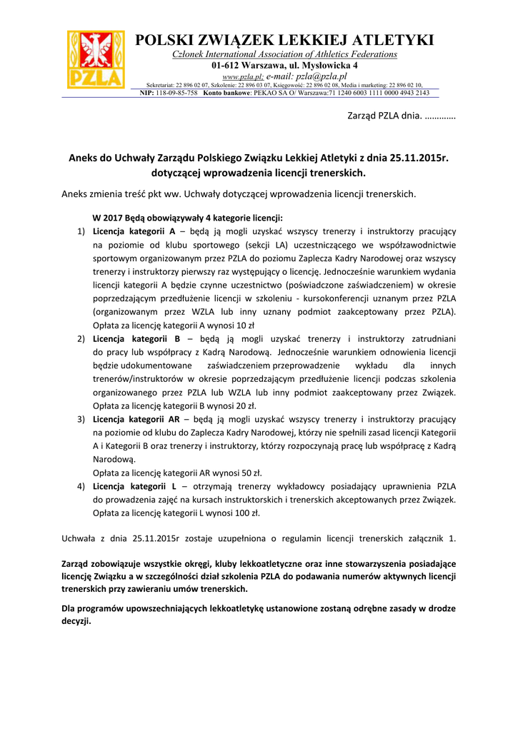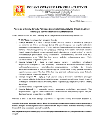 POLSKI ZWIĄZEK LEKKIEJ ATLETYKI Członek International Association of Athletics Federations 01-612 Warszawa, ul. Mysłowicka 4 www.pzla.pl; e-mail: [email protected] Sekretariat: 22 896 02 07, Szkolenie: 22 896 03 07, Księgowość: 22 896 02 08, Media i marketing: 22 896 02 10, NIP: 118-09-85-758 Konto bankowe: PEKAO SA O/ Warszawa:71 1240 6003 1111 0000 4943 2143 Zarząd PZLA dnia. …………. Aneks do Uchwały Zarządu Polskiego Związku Lekkiej Atletyki z dnia 25.11.2015r. dotyczącej wprowadzenia licencji trenerskich. Aneks zmienia treść pkt ww. Uchwały dotyczącej wprowadzenia licencji trenerskich. 1) 2) 3) 4) W 2017 Będą obowiązywały 4 kategorie licencji: Licencja kategorii A – będą ją mogli uzyskać wszyscy trenerzy i instruktorzy pracujący na poziomie od klubu sportowego (sekcji LA) uczestniczącego we współzawodnictwie sportowym organizowanym przez PZLA do poziomu Zaplecza Kadry Narodowej oraz wszyscy trenerzy i instruktorzy pierwszy raz występujący o licencję. Jednocześnie warunkiem wydania licencji kategorii A będzie czynne uczestnictwo (poświadczone zaświadczeniem) w okresie poprzedzającym przedłużenie licencji w szkoleniu - kursokonferencji uznanym przez PZLA (organizowanym przez WZLA lub inny uznany podmiot zaakceptowany przez PZLA). Opłata za licencję kategorii A wynosi 10 zł Licencja kategorii B – będą ją mogli uzyskać trenerzy i instruktorzy zatrudniani do pracy lub współpracy z Kadrą Narodową. Jednocześnie warunkiem odnowienia licencji będzie udokumentowane zaświadczeniem przeprowadzenie wykładu dla innych trenerów/instruktorów w okresie poprzedzającym przedłużenie licencji podczas szkolenia organizowanego przez PZLA lub WZLA lub inny podmiot zaakceptowany przez Związek. Opłata za licencję kategorii B wynosi 20 zł. Licencja kategorii AR – będą ją mogli uzyskać wszyscy trenerzy i instruktorzy pracujący na poziomie od klubu do Zaplecza Kadry Narodowej, którzy nie spełnili zasad licencji Kategorii A i Kategorii B oraz trenerzy i instruktorzy, którzy rozpoczynają pracę lub współpracę z Kadrą Narodową. Opłata za licencję kategorii AR wynosi 50 zł. Licencja kategorii L – otrzymają trenerzy wykładowcy posiadający uprawnienia PZLA do prowadzenia zajęć na kursach instruktorskich i trenerskich akceptowanych przez Związek. Opłata za licencję kategorii L wynosi 100 zł. Uchwała z dnia 25.11.2015r zostaje uzupełniona o regulamin licencji trenerskich załącznik 1. Zarząd zobowiązuje wszystkie okręgi, kluby lekkoatletyczne oraz inne stowarzyszenia posiadające licencję Związku a w szczególności dział szkolenia PZLA do podawania numerów aktywnych licencji trenerskich przy zawieraniu umów trenerskich. Dla programów upowszechniających lekkoatletykę ustanowione zostaną odrębne zasady w drodze decyzji.