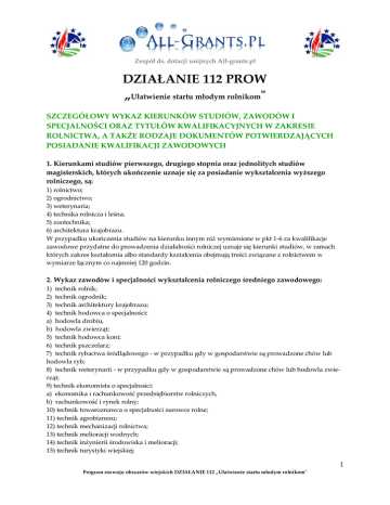 Zespół ds. dotacji unijnych All-grants.pl DZIAŁANIE 112 PROW „Ułatwienie startu młodym rolnikom" SZCZEGÓŁOWY WYKAZ KIERUNKÓW STUDIÓW, ZAWODÓW I SPECJALNOŚCI ORAZ TYTUŁÓW KWALIFIKACYJNYCH W ZAKRESIE ROLNICTWA, A TAKŻE RODZAJE DOKUMENTÓW POTWIERDZAJĄCYCH POSIADANIE KWALIFIKACJI ZAWODOWYCH 1. Kierunkami studiów pierwszego, drugiego stopnia oraz jednolitych studiów magisterskich, których ukończenie uznaje się za posiadanie wykształcenia wyższego rolniczego, są: 1) rolnictwo; 2) ogrodnictwo; 3) weterynaria; 4) technika rolnicza i leśna; 5) zootechnika; 6) architektura krajobrazu. W przypadku ukończenia studiów na kierunku innym niż wymienione w pkt 1-6 za kwalifikacje zawodowe przydatne do prowadzenia działalności rolniczej uznaje się kierunki studiów, w ramach których zakres kształcenia albo standardy kształcenia obejmują treści związane z rolnictwem w wymiarze łącznym co najmniej 120 godzin. 2. Wykaz zawodów i specjalności wykształcenia rolniczego średniego zawodowego: 1) technik rolnik; 2) technik ogrodnik; 3) technik architektury krajobrazu; 4) technik hodowca o specjalności: a) hodowla drobiu, b) hodowla zwierząt; 5) technik hodowca koni; 6) technik pszczelarz; 7) technik rybactwa śródlądowego - w przypadku gdy w gospodarstwie są prowadzone chów lub hodowla ryb; 8) technik weterynarii - w przypadku gdy w gospodarstwie są prowadzone chów lub hodowla zwierząt; 9) technik ekonomista o specjalności: a) ekonomika i rachunkowość przedsiębiorstw rolniczych, b) rachunkowość i rynek rolny; 10) technik towaroznawca o specjalności surowce rolne; 11) technik agrobiznesu; 12) technik mechanizacji rolnictwa; 13) technik melioracji wodnych; 14) technik inżynierii środowiska i melioracji; 15) technik turystyki wiejskiej; 1 Program rozwoju obszarów wiejskich DZIAŁANIE 112 „Ułatwienie startu młodym rolnikom" Zespół ds. dotacji unijnych All-grants.pl 16) technik mechanik o specjalności maszyny i urządzenia rolnicze. 3. Wykaz zawodów i specjalności wykształcenia rolniczego zasadniczego zawodowego: 1) 2) 3) 4) 5) 6) 7) 8) rolnik; ogrodnik; pszczelarz; mechanik operator pojazdów i maszyn rolniczych; rybak śródlądowy - w przypadku gdy w gospodarstwie są prowadzone chów lub hodowla ryb; mechanik maszyn rolniczych; mechanik maszyn i urządzeń o specjalności maszyny i urządzenia rolnicze; rolnik mechanizator. 4. Za studia podyplomowe w zakresie związanym z rolnictwem uznaje się studia, których program obejmuje co najmniej jedno z następujących zagadnień: 1) 2) 3) 4) 5) ekonomika rolnictwa; organizacja lub technologia produkcji rolniczej; marketing artykułów rolnych; rachunkowość rolnicza; agrobiznes. 5. Wykaz tytułów kwalifikacyjnych, tytułów zawodowych oraz tytułów zawodowych mistrza w zawodach przydatnych do prowadzenia działalności rolniczej, uzyskiwanych w systemie pozaszkolnym: 1) rolnik; 2) wykwalifikowany rolnik; 3) mistrz rolnik; 4) rolnik upraw polowych: a) wykwalifikowany rolnik upraw polowych, b) mistrz - rolnik upraw polowych; 5) rolnik łąkarz: a) wykwalifikowany rolnik łąkarz, b) mistrz - rolnik łąkarz; 6) rolnik chmielarz: a) wykwalifikowany rolnik chmielarz, b) mistrz - rolnik chmielarz; 7) rolnik hodowca bydła: a) wykwalifikowany rolnik hodowca bydła, b) mistrz - rolnik hodowca bydła; 8) rolnik hodowca trzody chlewnej: a) wykwalifikowany rolnik hodowca trzody chlewnej, b) mistrz - rolnik hodowca trzody chlewnej; 9) rolnik hodowca owiec: a) wykwalifikowany rolnik hodowca owiec, b) mistrz - rolnik hodowca owiec; 10) rolnik hodowca koni: a) wykwalifikowany rolnik hodowca koni, b) mistrz - rolnik hodowca koni; 2 Program rozwoju obszarów wiejskich DZIAŁANIE 112 „Ułatwienie startu młodym rolnikom" Zespół ds. dotacji unijnych All-grants.pl 11) hodowca drobiu: a) wykwalifikowany hodowca drobiu, b) mistrz - hodowca drobiu; 12) hodowca zwierząt futerkowych: a) wykwalifikowany hodowca zwierząt futerkowych, b) mistrz - hodowca zwierząt futerkowych; 13) pszczelarz; 14) wykwalifikowany pszczelarz; 15) mistrz pszczelarz; 16) ogrodnik; 17) wykwalifikowany ogrodnik; 18) mistrz ogrodnik; 19) ogrodnik sadownik: a) wykwalifikowany ogrodnik sadownik, b) mistrz - ogrodnik sadownik; 20) ogrodnik szkółkarz: a) wykwalifikowany ogrodnik szkółkarz, b) mistrz - ogrodnik szkółkarz; 21) ogrodnik warzywnik: a) wykwalifikowany ogrodnik warzywnik, b) mistrz - ogrodnik warzywnik; 22) ogrodnik upraw kwiaciarskich: a) wykwalifikowany ogrodnik upraw kwiaciarskich, b) mistrz - ogrodnik upraw kwiaciarskich; 23) ogrodnik pieczarkarz: a) wykwalifikowany ogrodnik pieczarkarz, b) mistrz - ogrodnik pieczarkarz; 24) traktorzysta - wykwalifikowany traktorzysta; 25) traktorzysta kombajnista - wykwalifikowany traktorzysta kombajnista; 26) rolnik obsługi maszyn rolniczych - mistrz rolnik obsługi maszyn rolniczych; 27) mechanik operator pojazdów i maszyn rolniczych; 28) wykwalifikowany mechanik operator pojazdów i maszyn rolniczych; 29) mistrz - mechanik operator pojazdów i maszyn rolniczych; 30) rybak stawowy - w przypadku gdy w gospodarstwie są prowadzone chów lub hodowla ryb: a) wykwalifikowany rybak stawowy, b) mistrz - rybak stawowy; 31) rybak jeziorowy - w przypadku gdy w gospodarstwie są prowadzone chów lub hodowla ryb: a) wykwalifikowany rybak jeziorowy, b) mistrz - rybak jeziorowy; 32) rybak rzeczny - w przypadku gdy w gospodarstwie są prowadzone chów lub hodowla ryb: a) wykwalifikowany rybak rzeczny, b) mistrz - rybak rzeczny; 33) rybak śródlądowy - w przypadku gdy w gospodarstwie są prowadzone chów lub hodowla ryb. 3 Program rozwoju obszarów wiejskich DZIAŁANIE 112 „Ułatwienie startu młodym rolnikom"