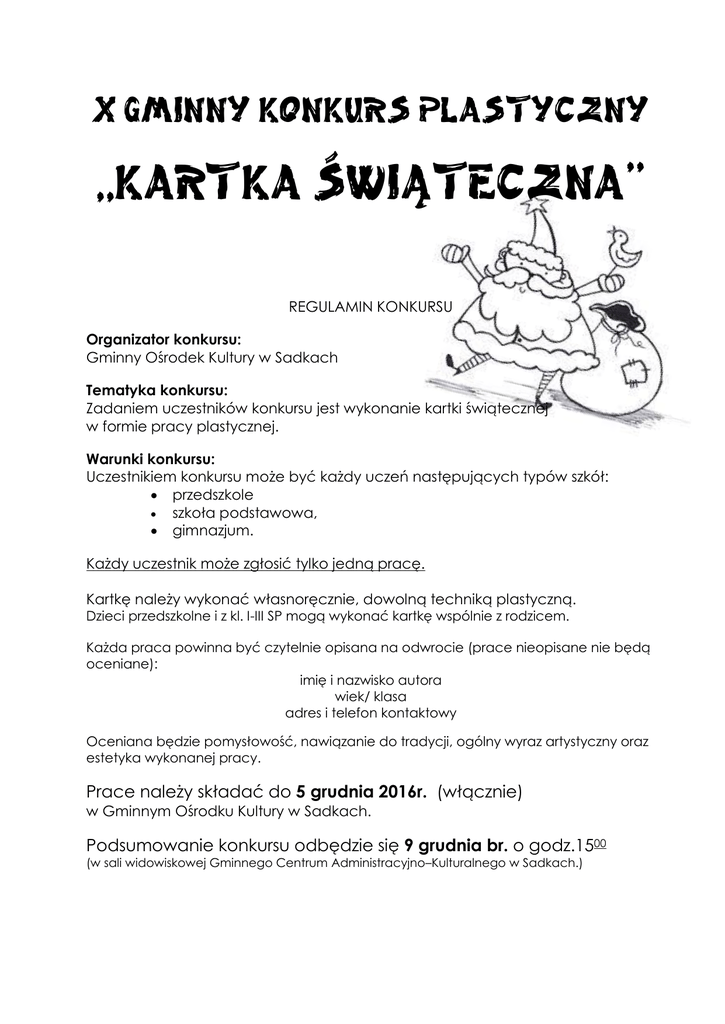 X GMINNY KONKURS PLASTYCZNY „KARTKA ŚWIĄTECZNA” REGULAMIN KONKURSU Organizator konkursu: Gminny Ośrodek Kultury w Sadkach Tematyka konkursu: Zadaniem uczestników konkursu jest wykonanie kartki świątecznej w formie pracy plastycznej. Warunki konkursu: Uczestnikiem konkursu może być każdy uczeń następujących typów szkół: przedszkole szkoła podstawowa, gimnazjum. Każdy uczestnik może zgłosić tylko jedną pracę. Kartkę należy wykonać własnoręcznie, dowolną techniką plastyczną. Dzieci przedszkolne i z kl. I-III SP mogą wykonać kartkę wspólnie z rodzicem. Każda praca powinna być czytelnie opisana na odwrocie (prace nieopisane nie będą oceniane): imię i nazwisko autora wiek/ klasa adres i telefon kontaktowy Oceniana będzie pomysłowość, nawiązanie do tradycji, ogólny wyraz artystyczny oraz estetyka wykonanej pracy. Prace należy składać do 5 grudnia 2016r. (włącznie) w Gminnym Ośrodku Kultury w Sadkach. Podsumowanie konkursu odbędzie się 9 grudnia br. o godz.1500 (w sali widowiskowej Gminnego Centrum Administracyjno–Kulturalnego w Sadkach.)