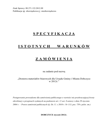 Znak Sprawy: RI.271.122.2012.III Publikacja: obowiązkowa nieobowiązkowa SPECYFIKACJA ISTOTNYCH WARUNKÓW ZAMÓWIENIA na zadanie pod nazwą „Dostawa materiałów biurowych dla Urzędu Gminy i Miasta Dobczyce w 2012r.” Postępowanie prowadzone dla zamówienia publicznego o wartości nie przekraczającej kwoty określonej w przepisach wydanych na podstawie art. 11 ust. 8 ustawy z dnia 29 stycznia 2004 r. – Prawo zamówień publicznych (tj. Dz. U. z 2010 r. Nr 113, poz. 759 z późn. zm.) DOBCZYCE styczeń 2012r. SPECYFIKACJA ISTOTNYCH WARUNKÓW ZAMÓWIENIA I. INFORMACJE O ZAMAWIAJĄCYM. 1. Postępowanie jest prowadzone przez Gmina Dobczyce, 32-410 Dobczyce, Rynek 26, Powiat Myślenice, Województwo małopolskie, NIP: 681- 10 – 04 – 443, REGON: 351555424, Telefon : 12 37 – 21 – 703, faks: 12 27 – 12 – 993 e – mail: [email protected] adres strony internetowej: www.dobczyce.pl znak postępowania: RI.271.122.2012.III 2. Miejsce publikacji ogłoszenia o przetargu: Biuletyn Zamówień Publicznych Nr 26452 – 2012 z dnia 27.01.2012 strona internetowa Zamawiającego – www.dobczyce.pl tablica ogłoszeń w miejscu publicznie dostępnym w siedzibie Zamawiającego. II. TRYB UDZIELENIA ZAMÓWIENIA. Zamówienie udzielane jest w trybie przetargu nieograniczonego zgodnie z ustawą z dnia 29 stycznia 2004 r. Prawo zamówień publicznych (tekst jednolity Dz. U. z 2010r. Nr 113, poz. 759), zwaną dalej „ustawą”. III. OPIS PRZEDMIOTU ZAMÓWIENIA. 1. Przedmiotem zamówienia jest „Dostawa materiałów biurowych dla Urzędu Gminy i Miasta Dobczyce w 2012r.”, zwana dalej „zadaniem” 2. Kody i nazwy zamówienia wg Wspólnego Słownika Zamówień: Główny przedmiot zamówienia: 30190000 – 7 Różne sprzęty i artykuły biurowe. 3. Zadanie należy wykonać zgodnie z zapisami SIWZ, uwzględniając zakres dostawy. Materiały biurowe dostarczane będą na podstawie druku zamówienia. Wykonawca materiały biurowe dostarczać będzie w terminie 24 godzin od doręczenia przez Zamawiającego zamówienia. Dostawy odbywać się będą do siedziby Zamawiającego mieszczącej się w Dobczycach, Rynek 26, na II piętro. Wykonawca we własnym zakresie zabezpieczy osoby, które wniosą dostarczone materiały biurowe na II piętro Urzędu Gminy. W ramach umowy Zamawiający będzie mógł zmieniać wielkość poszczególnych pozycji. W przypadku gdy w zakresie dostawy wskazane są dla niektórych materiałów biurowych nazwy własne – nadmienia się, że wszystkie użyte nazwy produktów jak i firm mają tylko i wyłącznie zastosowanie do określenia minimalnych parametrów materiałów biurowych. Zamawiający dopuszcza możliwość składania ofert z zastosowaniem materiałów równoważnych, pod warunkiem zapewnienia nie gorszych parametrów. Wykonawca, który zaoferuje materiały równoważne ma obowiązek wskazać w swojej ofercie jakie materiały zostały zamienione i określić jakie materiały i o jakich parametrach w ich miejsce proponuje oraz załączyć ich opis do oferty w formie tabeli porównującej parametry materiałów wskazanych przez Zamawiającego z materiałami oferowanymi przez Wykonawcę. 4. Zakres dostawy materiałów biurowych: Lp 1 2 3 4 Nazwa materiału biurowego blok techniczny mały A4 cienkopis kolorowy szt 6 w etui długopis SPOKO długopis Pilot czarny SUPER GRIP Burmistrz Gminy i Miasta Dobczyce 32-410 Dobczyce, Rynek 26; tel.: (+ 48) 12 372-17-00, 12 271 10 04, fax: (+ 48) 12 271 29 93, e-mail: ugi [email protected] www.dobczyce.pl Ilość 53 29 42 29 2 5 6 7 8 9 10 11 12 13 14 15 16 17 18 19 20 21 22 23 24 25 26 27 28 29 30 31 32 33 34 35 36 37 38 39 40 41 42 43 44 45 46 47 48 długopis Pentel niebieski Bk77 długopis Pilot zielony G1 długopis Pilot czerwony G1 długopis Pilot niebieski G2 długopis Pilot niebieski G1 długopis Rystor gz031 długopis żelowy niebieski gumka pentel mała gumki recepturki /40 G karton archiwizacyjny Esselte 100 mm karton archiwizacyjny Esselte 80 mm klej w tubce 21 g klipy do dokumentów op.12 szt 40 mm klipy do dokumentów/15 szt./klip 25mm/op.12szt koperta biała A5 /50 szt./ samoklejąca koperta biała C6 100 szt. samoklejąca koperta szara A-4 (50szt), koperta biała A-5 (50 szt). koperty z rozszerzonymi bokami A4 20 szt. korektor Tipp-Ex w płynie korektor w piórze Grand GR-11 korektor w taśmie kostki nie klejone kolor 85x85x35 kostki w pojemniku akrylowym kolor koszulki na A3 koszulki szerokie 22x30 cm do katalogów 50 szt koszulki krystaliczne BANTEX A4/100 szt koszulki ESSELTE A4 MAXI 120Mic/25 szt kronika magnetyczne punkty mocujące 15 mm 10 szt notesy samoprzylepne 38x51 notesy samoprzylepne TARTAN 76x76 ofertówka sztywna (100 szt) L ołówek automatyczny PENTEL 0,5 AZ125 papier etykietowy A4/100 ark. papier wizytówkowy płótnowany (25 kart), papier xero A4 – ryza 500 kartek, gramatura 80g/m2 o bieli minimum 161 CIE, mający zastosowanie do kserokopiarek, faksów, drukarek laserowych i atramentowych Pojemnik na czasopisma Leitz Plus pojemnik na czasopisma Esselte A4/100 pojemnik na spinacze z magnesem rozszywacz, EAGLE segregator szeroki 4 klamry A4/35/4R skoroszyt plastykowy zawieszkowy. skoroszyt plastykowy, Burmistrz Gminy i Miasta Dobczyce 32-410 Dobczyce, Rynek 26; tel.: (+ 48) 12 372-17-00, 12 271 10 04, fax: (+ 48) 12 271 29 93, e-mail: ugi [email protected] www.dobczyce.pl 40 10 41 11 15 3 44 25 20 40 10 38 30 27 24 50 22 23 8 10 21 13 54 18 1 16 29 9 4 9 135 125 12 20 9 2 1347 10 32 7 8 3 345 160 3 49 50 51 52 53 54 55 56 57 58 59 60 61 62 63 64 65 66 67 68 69 70 71 72 73 74 75 76 77 78 79 80 81 82 83 84 85 86 87 88 89 90 91 92 taśma dwustronna taśma klejąca biurowa przeźr. 2 cm tasiemka bawełniana mb teczka lakierowana z gumką teczka wiązana kartonowa A4 teka akt osobowych wkład do ołówka automatycznego 5mm zakładki indeksujące DONAU kpl zakreślacze (kpi 4kol.), zastrugiwaczka metalowa kostka szt 1 zeszyt A4 100 twarda oprawa zeszyt A4 ze skorowidzem twarda oprawa zeszyt w kratkę A5 
