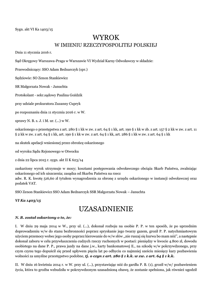 Sygn. akt VI Ka 1403/15 WYROK W IMIENIU RZECZYPOSPOLITEJ POLSKIEJ Dnia 11 stycznia 2016 r. Sąd Okręgowy Warszawa-Praga w Warszawie VI Wydział Karny Odwoławczy w składzie: Przewodniczący: SSO Adam Bednarczyk (spr.) Sędziowie: SO Zenon Stankiewicz SR Małgorzata Nowak - Januchta Protokolant - sekr.sądowy Paulina Goździk przy udziale prokuratora Zuzanny Cupryk po rozpoznaniu dnia 11 stycznia 2016 r. w W. sprawy N. B. s. J. i M. ur. (...) w W. oskarżonego o przestępstwa z art. 280 § 1 kk w zw. z art. 64 § 1 kk, art. 190 § 1 kk w zb. z art. 157 § 2 kk w zw. z art. 11 § 2 kk w zw. z art. 64 § 1 kk, art. 190 § 1 kk w zw. z art. 64 § 1 kk, art. 286 § 1 kk w zw. z art. 64 § 1 kk na skutek apelacji wniesionej przez obrońcę oskarżonego od wyroku Sądu Rejonowego w Otwocku z dnia 22 lipca 2015 r. sygn. akt II K 623/14 zaskarżony wyrok utrzymuje w mocy; kosztami postępowania odwoławczego obciąża Skarb Państwa, zwalniając oskarżonego od ich uiszczenia; zasądza od Skarbu Państwa na rzecz adw. R. K. kwotę 516,60 zł tytułem wynagrodzenia za obronę z urzędu oskarżonego w instancji odwoławczej oraz podatek VAT. SSO Zenon Stankiewicz SSO Adam Bednarczyk SSR Małgorzata Nowak – Januchta VI Ka 1403/15 UZASADNIENIE N. B. został oskarżony o to, że: I. W dniu 29 maja 2014 w W., przy ul. (...), dokonał rozboju na osobie P. P. w ten sposób, że po uprzednim doprowadzeniu w/w do stanu bezbronności poprzez spryskanie jego twarzy gazem, groził P. P. natychmiastowym użyciem przemocy wobec jego osoby poprzez kierowanie do w/w słów ,,nie ruszaj się kurwa bo mam nóż’’, a następnie dokonał zaboru w celu przywłaszczenia cudzych rzeczy ruchomych w postaci: pieniędzy w kwocie 4.800 zł, dowodu osobistego na dane P. P., prawa jazdy na dane j.w., karty bankomatowej E., na szkodę w/w pokrzywdzonego, przy czym czynu tego dopuścił się przed upływem pięciu lat po odbyciu co najmniej sześciu miesięcy kary pozbawienia wolności za umyślne przestępstwo podobne, tj. o czyn z art. 280 § 1 k.k. w zw. z art. 64 § 1 k.k. II. W dniu 16 kwietnia 2014 r. w W. przy ul. (...), przystawiając nóż do gardła P. B. (1), groził w/w/ pozbawieniem życia, która to groźba wzbudziła w pokrzywdzonym uzasadnioną obawę, że zostanie spełniona, jak również ugodził pokrzywdzonego nożem powyżej talerza lewej kości biodrowej, powodując u niego ranę ciętą o długości 3 cm bez uszkodzenia mięśni i powięzi bocznej lewej strony powłok brzusznych, co skutkowało u P. B. (1) rozstrojem zdrowia na okres poniżej 7 dni, przy czym czynu tego dopuścił się przed upływem pięciu lat po odbyciu co najmniej sześciu miesięcy kary pozbawienia wolności za umyślne przestępstwo podobne, tj. o czyn z art. 190 § 1 k.k. w zb. z art. 157 § 2 k.k. w zw. z art. 11 § 2 k.k. w zw. z art. 64 § 1 k.k. III. W dniu 15 kwietnia 2014 r. w W. w rozmowie telefonicznej groził P. B. (1) uszkodzeniem ciała, która to groźba wzbudziła u pokrzywdzonego uzasadniona obawę, że zostanie spełniona, przy czym czynu tego dopuścił się przed upływem pięciu lat po odbyciu co najmniej sześciu miesięcy kary pozbawienia wolności za umyślne przestępstwo podobne, tj. art. 190 § 1 k.k. w zw. z art. 64 § 1 k.k. IV. W dniu 24 lutego 2014 r. w J., pow. (...), woj. (...), działając w celu osiągnięcia korzyści majątkowej doprowadził B. S. do niekorzystnego rozporządzenia mieniem w kwocie 150 zł w ten sposób, że zaoferował w/w do sprzedaży papierosy po okazyjnej cenie i przyjął za sprzedaż 6 kartonów papierosów gotówkę w kwocie 150 zł, wprowadzając B. S. w błąd co do zamiaru dostarczenia jej zakupionych papierosów, albowiem nie miał zamiaru wywiązać się z powyższej umowy, przy czym czynu tego dopuścił się przed upływem pięciu lat po odbyciu co najmniej sześciu miesięcy pozbawienia wolności za umyślne przestępstwo podobne, tj. o czyn z art. 286 § 1 k.k. w zw. z art. 64 § 1 k.k. Sąd Rejonowy w Otwocku wyrokiem z dnia 22 lipca 2015 roku w sprawie o sygn. akt II K 623/14 orzekł: 1. oskarżonego N. B. uznał za winnego czynu opisanego w pkt I, czym wyczerpał znamiona przestępstwa z art. 280 § 1 k.k. w zb. z art. 275 § 1 k.k. w zw. z art. 11 § 2 k.k. w zw. z art. 64 § 1 k.k. i za to na podstawie art. 280 § 1 k.k. w zw. z art. 11 § 3 k.k. wymierzył mu karę 2 (dwóch) lat i 6 (sześciu) miesięcy pozbawienia wolności, 2. oskarżonego N. B. uznał za winnego czynu opisanego w pkt II z tym to ustaleniem, iż czyn ten miał miejsce w nocy z 15 na 16 kwietnia 2014 r. i za to na podstawie art. 157 § 2 k.k. w zw. z art. 11 § 3 k.k. wymierzył mu karę 10 (dziesięciu) miesięcy pozbawienia wolności, 3. oskarżonego N. B. uznał za winnego czynu opisanego w pkt III z tym ustaleniem, że oskarżony groził pokrzywdzonemu P. B. (1) spaleniem domu oraz uniemożliwieniem powrotu do domu, eliminuje z opisu czynu groźby uszkodzenia ciała i za to na podstawie art. 190 § 1 k.k. wymierzył mu karę 6 (sześciu) miesięcy pozbawienia wolności, 4. oskarżonego N. B. uznał za winnego czynu opisanego w pkt IV z tym ustaleniem, że czyn ten dotyczył pięciu kartonów papierosów i za to na podstawie art. 286 § 1 k.k. wymierzył mu karę 1 (jednego) roku pozbawienia wolności, 5. na podstawie art. 85 § 1 k.k. i art. 86 § 1 k.k. wymierzył oskarżonemu karę łączną pozbawienia wolności w rozmiarze 4 (czterech) lat, 6. na podstawie art. 63 § 1 k.k. na poczet orzeczonej kary pozbawienia wolności zaliczył okres tymczasowego aresztowania od dnia 06.06.2014 r. godz. 06:50 do dnia 22.07.2015 r. oraz okres zatrzymania od dnia 16.04.2014 r. godz. 02:25 do dnia 17.04.2014 r. godz. 19:45, 7. na podstawie art. 46 § 1 k.k. orzekł wobec oskarżonego obowiązek naprawienia szkody wyrządzonej czynem I poprzez zapłatę na rzecz pokrzywdzonego P. P. kwoty 4900,50 (cztery tysiące dziewięćset 500/100) złotych, 8. na podstawie art. 46 § 1 k.k. orzekł wobec 