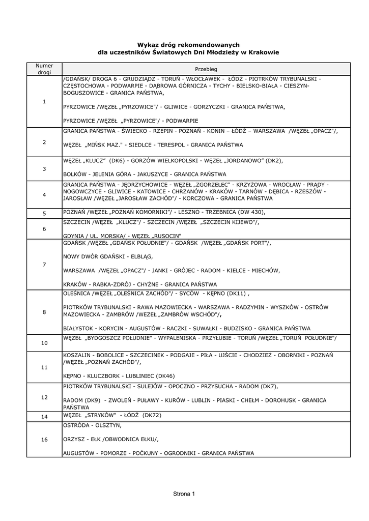 Wykaz dróg rekomendowanych dla uczestników Światowych Dni Młodzieży w Krakowie Numer drogi Przebieg /GDAŃSK/ DROGA 6 - GRUDZIĄDZ - TORUŃ - WŁOCŁAWEK - ŁÓDŹ - PIOTRKÓW TRYBUNALSKI CZĘSTOCHOWA - PODWARPIE - DĄBROWA GÓRNICZA - TYCHY - BIELSKO-BIAŁA - CIESZYNBOGUSZOWICE - GRANICA PAŃSTWA, 1 PYRZOWICE /WĘZEŁ „PYRZOWICE"/ - GLIWICE - GORZYCZKI - GRANICA PAŃSTWA, PYRZOWICE /WĘZEŁ „PYRZOWICE"/ - PODWARPIE GRANICA PAŃSTWA - ŚWIECKO - RZEPIN - POZNAŃ - KONIN – ŁÓDŹ – WARSZAWA /WĘZEŁ „OPACZ"/, 2 WĘZEŁ „MIŃSK MAZ." - SIEDLCE - TERESPOL - GRANICA PAŃSTWA WĘZEŁ „KLUCZ” (DK6) - GORZÓW WIELKOPOLSKI - WĘZEŁ „JORDANOWO” (DK2), 3 4 5 BOLKÓW - JELENIA GÓRA - JAKUSZYCE - GRANICA PAŃSTWA GRANICA PAŃSTWA - JĘDRZYCHOWICE - WĘZEŁ „ZGORZELEC" - KRZYŻOWA - WROCŁAW - PRĄDY NOGOWCZYCE - GLIWICE - KATOWICE - CHRZANÓW - KRAKÓW - TARNÓW - DĘBICA - RZESZÓW JAROSŁAW /WĘZEŁ „JAROSŁAW ZACHÓD"/ - KORCZOWA - GRANICA PAŃSTWA POZNAŃ /WĘZEŁ „POZNAŃ KOMORNIKI”/ - LESZNO - TRZEBNICA (DW 430), SZCZECIN /WĘZEŁ „KLUCZ"/ - SZCZECIN /WĘZEŁ „SZCZECIN KIJEWO"/, 6 GDYNIA / UL. MORSKA/ - WĘZEŁ „RUSOCIN" GDAŃSK /WĘZEŁ „GDAŃSK POŁUDNIE"/ - GDAŃSK /WĘZEŁ „GDAŃSK PORT"/, NOWY DWÓR GDAŃSKI - ELBLĄG, 7 WARSZAWA /WĘZEŁ „OPACZ"/ - JANKI - GRÓJEC - RADOM - KIELCE - MIECHÓW, KRAKÓW - RABKA-ZDRÓJ - CHYŻNE - GRANICA PAŃSTWA OLEŚNICA /WĘZEŁ „OLEŚNICA ZACHÓD"/ - SYCÓW - KĘPNO (DK11) , 8 PIOTRKÓW TRYBUNALSKI - RAWA MAZOWIECKA - WARSZAWA - RADZYMIN - WYSZKÓW - OSTRÓW MAZOWIECKA - ZAMBRÓW /WEZEŁ „ZAMBRÓW WSCHÓD"/, BIAŁYSTOK - KORYCIN - AUGUSTÓW - RACZKI - SUWAŁKI - BUDZISKO - GRANICA PAŃSTWA 10 11 WĘZEŁ „BYDGOSZCZ POŁUDNIE" - WYPALENISKA - PRZYŁUBIE - TORUŃ /WĘZEŁ „TORUŃ POŁUDNIE"/ KOSZALIN - BOBOLICE - SZCZECINEK - PODGAJE - PIŁA - UJŚCIE - CHODZIEŻ - OBORNIKI - POZNAŃ /WĘZEŁ „POZNAŃ ZACHÓD"/, KĘPNO - KLUCZBORK - LUBLINIEC (DK46) PIOTRKÓW TRYBUNALSKI - SULEJÓW - OPOCZNO - PRZYSUCHA - RADOM (DK7), 12 14 RADOM (DK9) - ZWOLEŃ - PUŁAWY - KURÓW - LUBLIN - PIASKI - CHEŁM - DOROHUSK - GRANICA PAŃSTWA WĘZEŁ „STRYKÓW" - ŁÓDŹ (DK72) OSTRÓDA - OLSZTYN, 16 ORZYSZ - EŁK /OBWODNICA EŁKU/, AUGUSTÓW - POMORZE - POĆKUNY - OGRODNIKI - GRANICA PAŃSTWA Strona 1 GRANICA PAŃSTWA - KUŹNICA - BIAŁYSTOK - SIEMIATYCZE - MIĘDZYRZEC PODLASKI - KOCK LUBARTÓW - LUBLIN /WĘZEŁ „LUBLIN RUDNIK"/, 19 LUBLIN (DP2350L) - KRAŚNIK - JANÓW LUBELSKI - NISKO - SOKOŁÓW MAŁOPOLSKI - RZESZÓW - BABICA - LUTCZA - DOMARADZ - MIEJSCE PIASTOWE - DUKLA - BARWINEK - GRANICA PAŃSTWA WĘZEŁ „SWAROŻYN" - MALBORK (DK55), 22 ELBLĄG - CHRUŚCIEL - GRZECHOTKI - GRANICA PAŃSTWA KROSNO - SANOK (DK84), 28 44 46 50 51 52 54 55 57 58 63 65 72 73 74 77 84 94 97 340 617 748 786 835 933 2350L 2359L 1036K 2399L 100342L PRZEMYŚL - MEDYKA - GRANICA PAŃSTWA OŚWIĘCIM - ZATOR - SKAWINA - KRAKÓW A4 „WĘZEŁ OPOLE ZACHÓD" – KARCZÓW - OPOLE - OZIMEK - LUBLINIEC - BLACHOWNIA - CZĘSTOCHOWA CIECHANÓW - PŁOŃSK - WYSZOGRÓD - RUSZKI - SOCHACZEW - MSZCZONÓW - GRÓJEC - GÓRA KALWARIA - KOŁBIEL - MIŃSK MAZOWIECKI (DK2) GRANICA PAŃSTWA - BEZLEDY - BARTOSZYCE (DK57) WADOWICE - GŁOGOCZÓW CHRUŚCIEL - BRANIEWO - GRONOWO - GRANICA PAŃSTWA NOWY DWÓR GDAŃSKI (DK7) - MALBORK (DK22) BARTOSZYCE (DK51) - BISKUPIEC - SZCZYTNO - PRZASNYSZ SZCZYTNO - BABIĘTA - RUCIANE NIDA - PISZ ORZYSZ - PISZ GRANICA PAŃSTWA - GOŁDAP - OLECKO - EŁK /OBWODNICA EŁKU/, BIAŁYSTOK - BOBROWNIKI - GRANICA PAŃSTWA ŁÓDŹ (DK1) - ŁÓDŹ (DK14) KIELCE - MORAWICA - CHMIELNIK KIELCE - ŁAGÓW - OPATÓW - OŻARÓW - ANNOPOL - KRAŚNIK DK4 - PRZEMYŚL SANOK - LESKO - USTRZYKI DOLNE - KROŚCIENKO - GRANICA PAŃSTWA DĄBROWA GÓRNICZA (DK1) - OLKUSZ WĘZEŁ „RZESZÓW WSCHÓD” - RZESZÓW (DK94) TRZEBNICA (DK5) - WĘZEŁ „OLEŚNICA ZACHÓD" (DK8) PRZASNYSZ (DK57) - CIECHANÓW (DK50) KOSTOMŁOTY DRUGIE (DK74) - STRAWCZYN (DW786) STRAWCZYN (DW748) - CZĘSTOCHOWA WĘZEŁ „LUBLIN RUDNIK" - LUBLIN (DP2399L) CHRZANÓW - OŚWIĘCIM LUBLIN (DP2359L) - LUBLIN (DK19) LUBLIN (DG100342L) - LUBLIN (DP2350L) CHRZANÓW LUBLIN (DW835) - LUBLIN (DG100342L) LUBLIN (DP2399L) - LUBLIN (DP2359L) POŁUDNIOWA OBWODNICA RADOMIA (MIEJSKA) Objazd dla ruchu tranzytowego - wykaz dróg 1 4 28 52 69 73 75 78 SIEWIERZ - PODWARPIE - DĄBROWA GÓRNICZA - TYCHY - BIELSKO-BIAŁA KATOWICE - CHRZANÓW - KRAKÓW - TARNÓW WADOWICE - RABKA-ZDRÓJ - LIMANOWA - NOWY SĄCZ BIELSKO BIAŁA (DK69) - KĘTY - WADOWICE BIELSKO BIAŁA (DK1) - BIELSKO BIAŁA (DK52) CHMIELNIK - BUSKO-ZDRÓJ - SZCZUCIN - DĄBROWA TARNOWSKA - TARNÓW BRZESKO - NOWY SĄCZ SIEWIERZ - ZAWIERCIE - SZCZEKOCINY - NAGŁOWICE - JĘDRZEJÓW Strona 2