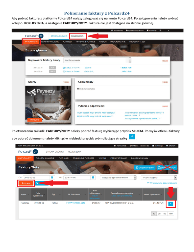 Pobieranie faktury z Polcard24 Aby pobrać fakturę z platformy Polcard24 należy zalogować się na konto Polcard24. Po zalogowaniu należy wybrać kolejno: ROZLICZENIA, a następnie FAKTURY/NOTY. Faktura nie jest dostępna na stronie głównej. Po otworzeniu zakładki FAKTURY/NOTY należy pobrać fakturę wybierając przycisk SZUKAJ. Po wyświetleniu faktury aby pobrać dokument należy kliknąć w niebieski przycisk sybmolizujący strzałkę . Pobieranie załączników do faktury, czyli raporty WPF Raport WPF jest dostępny w zakładce RAPORTY CYKLICZNE. W celu przejścia do zakładki należy wybrać kolejno: ROZLICZENIA, a następnie RAPORTY CYKLICZNE. Po otworzeniu zakładki RAPORTY CYKLICZNE, należy określić okres czasu którego ma dotyczyć raport. W celu poprawnego wyszukania raportu należy zaznaczyć okres czasu większy niż 1 miesiąc, np. jeśli raport dotyczy września, kontrahent powinien zaznaczyć okres czasu od np. 2016-08-29 do 2016-10-07. Po wyszukaniu raportu w celu pobrania należy kliknąć w nazwę pliku podświetloną na niebiesko.