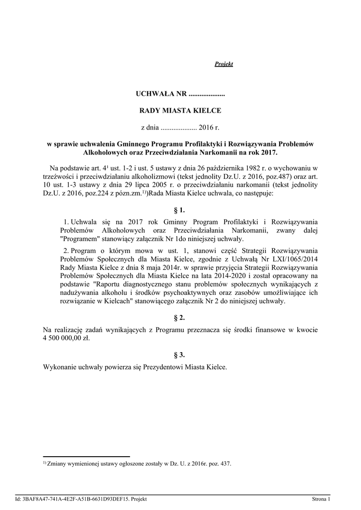 Projekt UCHWAŁA NR .................... RADY MIASTA KIELCE z dnia .................... 2016 r. w sprawie uchwalenia Gminnego Programu Profilaktyki i Rozwiązywania Problemów Alkoholowych oraz Przeciwdziałania Narkomanii na rok 2017. Na podstawie art. 4¹ ust. 1-2 i ust. 5 ustawy z dnia 26 października 1982 r. o wychowaniu w trzeźwości i przeciwdziałaniu alkoholizmowi (tekst jednolity Dz.U. z 2016, poz.487) oraz art. 10 ust. 1-3 ustawy z dnia 29 lipca 2005 r. o przeciwdziałaniu narkomanii (tekst jednolity Dz.U. z 2016, poz.224 z pózn.zm.1))Rada Miasta Kielce uchwala, co następuje: § 1. 1. Uchwala się na 2017 rok Gminny Program Profilaktyki i Rozwiązywania Problemów Alkoholowych oraz Przeciwdziałania Narkomanii, zwany dalej "Programem" stanowiący załącznik Nr 1do niniejszej uchwały. 2. Program o którym mowa w ust. 1, stanowi część Strategii Rozwiązywania Problemów Społecznych dla Miasta Kielce, zgodnie z Uchwałą Nr LXI/1065/2014 Rady Miasta Kielce z dnia 8 maja 2014r. w sprawie przyjęcia Strategii Rozwiązywania Problemów Społecznych dla Miasta Kielce na lata 2014-2020 i został opracowany na podstawie "Raportu diagnostycznego stanu problemów społecznych wynikających z nadużywania alkoholu i środków psychoaktywnych oraz zasobów umożliwiające ich rozwiązanie w Kielcach" stanowiącego załącznik Nr 2 do niniejszej uchwały. § 2. Na realizację zadań wynikających z Programu przeznacza się środki finansowe w kwocie 4 500 000,00 zł. § 3. Wykonanie uchwały powierza się Prezydentowi Miasta Kielce. 1) Zmiany wymienionej ustawy ogłoszone zostały w Dz. U. z 2016r. poz. 437. Id: 3BAF8A47-741A-4E2F-A51B-6631D93DEF15. Projekt Strona 1 § 4. Uchwała wchodzi w życie z dniem podjęcia. Przewodniczący Rady Miasta Kielce Dariusz Kozak Id: 3BAF8A47-741A-4E2F-A51B-6631D93DEF15. Projekt Strona 2 Załącznik Nr 1 do Uchwały Nr …………… Rady Miasta Kielce z dnia ………………2016r. Gminny Program Profilaktyki i Rozwiązywania Problemów Alkoholowych oraz Przeciwdziałania Narkomanii Miasta Kielce na rok 2017 KIELCE 2016 Id: 3BAF8A47-741A-4E2F-A51B-6631D93DEF15. Projekt Strona 3 ROZDZIAŁ I Ogólne cele programu §1 1. Ograniczenie procesu degradacji osób uzależnionych i ich rodzin oraz osób zagrożonych uzależnieniem od alkoholu i narkotyków, zwiększenie dostępności do terapii dla osób uzależnionych i współuzależnionych. 2. Zmniejszenie rozmiarów szkód zdrowotnych, psychologicznych i społecznych spowodowanych nadużywaniem alkoholu i przemocą w rodzinie oraz używaniem narkotyków. 3. Zwiększenie zasobów materialnych, metodycznych i organizacyjnych niezbędnych do rozwiązywania istniejących problemów związanych z uzależnieniami. 4. Rozwijanie i propagowanie modelu „Zdrowego, trzeźwego i dobrego życia” poprzez tworzenie systemu oddziaływań profilaktycznych w procesie wychowawczym dzieci i młodzieży, zwłaszcza młodzieży zagrożonej oraz młodych-dorosłych. 5. Zapewnienie mieszkańcom miasta Kielce możliwości uzyskania wsparcia oraz profesjonalnej pomocy w rozwiązywaniu problemów wynikających z nadużywania alkoholu, środków psychoaktywnych, przemocy w rodzinie oraz wychowywania się i egzystencji w rodzinie dysfunkcyjnej. Szczegółowe cele programu na rok 2017 §2 1. Rozwijanie działań mających na celu zwiększenie dostępności i poprawę skuteczności różnorodnych form terapii i pomocy dla osób uzależnionych współuzależnionych, dzieci z rodzin z problemem uzależnienia oraz dorosłych dzieci alkoholików. 2. Tworzenie i rozwijanie programów terapeutycznych dla małżeństw i rodzin z problemem uzależnienia oraz innymi dysfunkcjami. 3. Rozwijanie i ewaluacja oddziaływań interwencyjnych, edukacyjnych i profilaktycznych wśród dzieci, młodzieży i studentów oraz różnorodnych grup ryzyka. 4. Stworzenie bazy informacyjnej dla mieszkańców Kielc dotyczącej pomocy w zakresie interwencji, profilaktyki, terapii uzależnień i problemów przystosowawczych. 5. Monitorowanie przestrzegania prawa w zakresie sprzedaży i podawania napojów alkoholowych i wyrobów nikotynowych oraz edukacja sprzedawców. Cele programu opracowane zostały zgodnie z kierunkami określonymi w : - Narodowym Programie Profilaktyki Zdrowia na lata 2016 – 2020, - Strategii Rozwiązywania Problemów Społecznych Miasta Kielce na lata 2014-2020, - Gminnego Programu Przeciwdziałania Przemocy w Rodzinie na terenie miasta Kielce na lata 2014- 2020 oraz na podstawie „Raportu diagnostycznego stanu problemów społecznych wynikających z nadużywania alkoholu i środków psychoaktywnych oraz zasoby umożliwiające ich rozwiązywanie w Kielcach”. Id: 3BAF8A47-741A-4E2F-A51B-6631D93DEF15. Projekt Strona 4 ROZDZIAŁ II Zadania i sposoby realizacji §3 Pomoc terapeutyczna i rehabilitacyjna dla osób z problemami uzależnień 1. Zadanie będzie realizowane w szczególności poprzez: a/ zajęcia umożliwiające odzyskiwanie funkcji społecznych, prowadzone w placówkach typu kluby abstynenckie, centra, czy kluby integracji i reintegracji społecznej oraz domy pomocy społecznej, gdzie przebywają osoby uzależnione, b/ zajęcia terapeutyczne, konsultacje psychologiczne i działania rehabilitacyjne dla osób z problemami uzależnienia oraz terapia dla sprawców przemocy prowadzone w szczególności w specjalistycznych ośrodkach terapeutycznych, c/ rozbudowę i wdrożenie programów pomocowych i terapeutycznych dla osób uzależnionych. d/ zajęcia oraz materiały edukacyjne uświadamiające młodym ludziom – potencjalnym rodzicom konsekwencje spożywania alkoholu przez kobiety w ciąży. Pomoc, diagnostyka i terapia dzieci z FASD. §4 Pomoc terapeutyczna, psychospołeczna i prawna dla członków rodzin z problemem uzależnień oraz ofiar przemocy w rodzinie 1. Zadanie będzie realizowane w szczególności poprzez: a/ zajęcia umożliwiające odzyskiwanie funkcji w placówkach specjalistycznych, klubach abstynenckich, spo